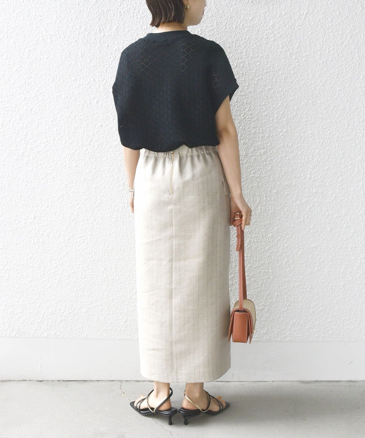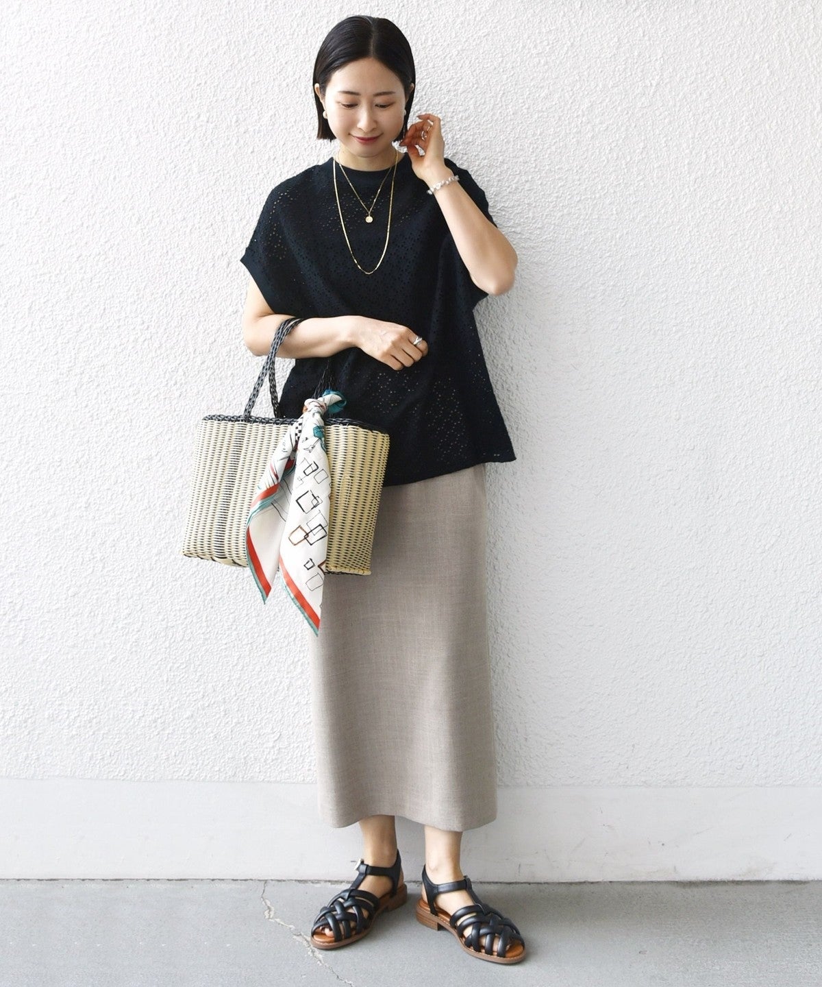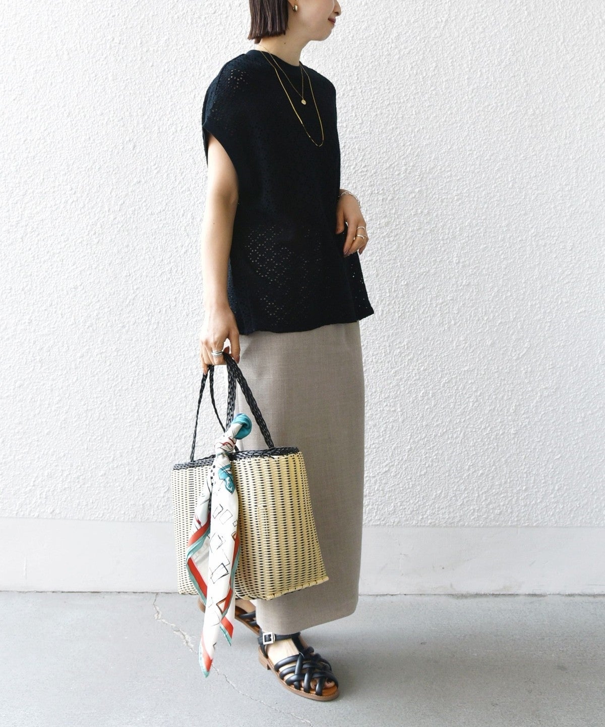 コメント:全体的にゆったりめのシルエットですが、透け感のある素材なので重たくならず着られました。気温の高い時期にも重宝しそうな一枚です。
