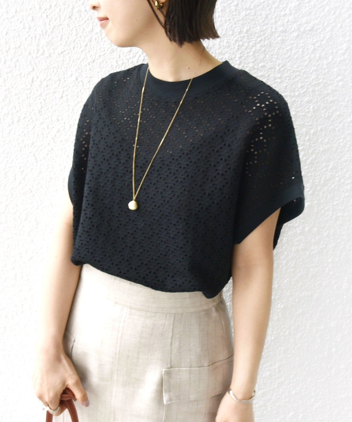 ・レースのような柄がポイントのアイレットカットワークデザインのトップスです。