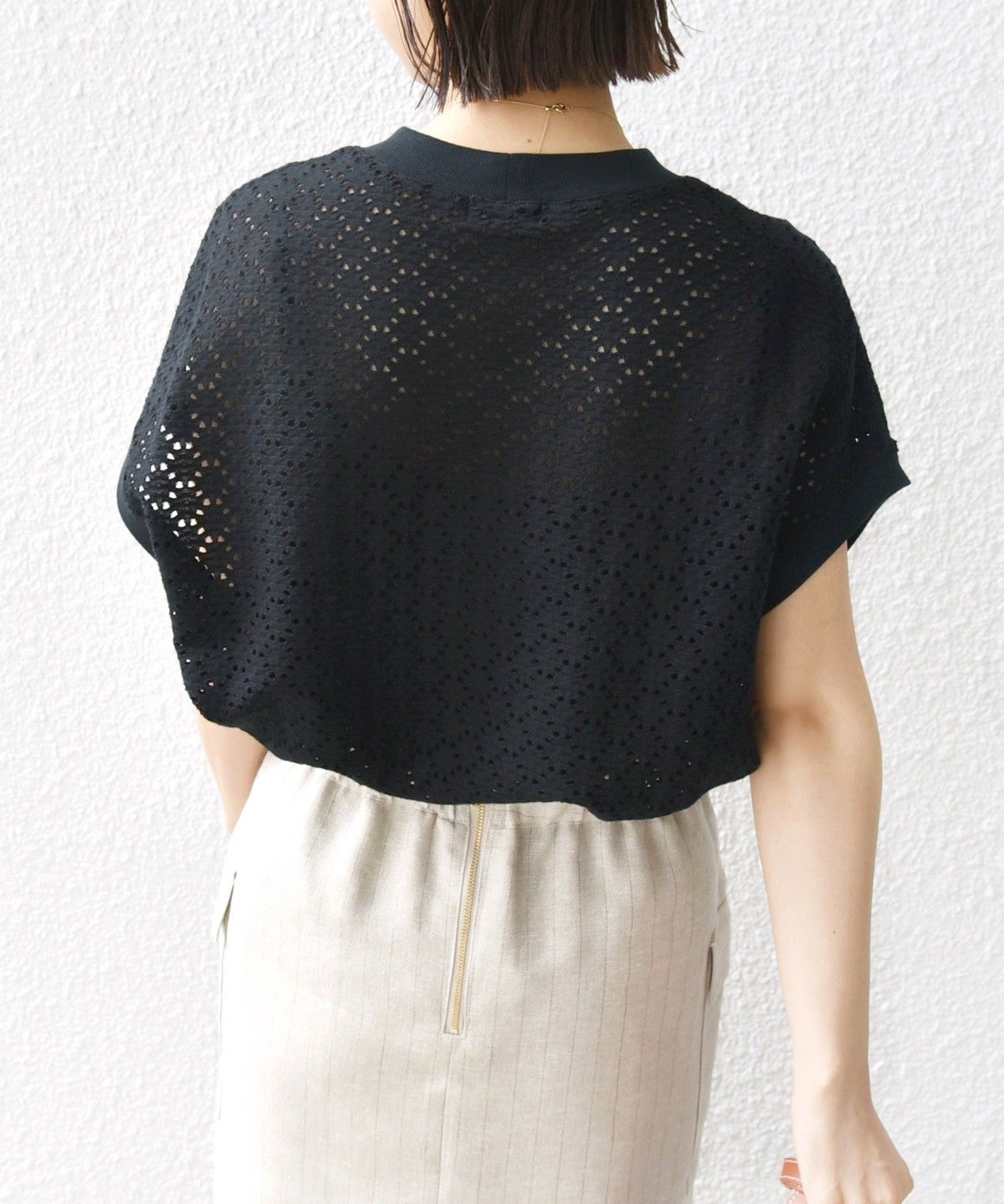 ・アイレット素材とは、カットソージャガード天竺素材に特殊加工を施し、多彩なレースのような柄を表現したものです。