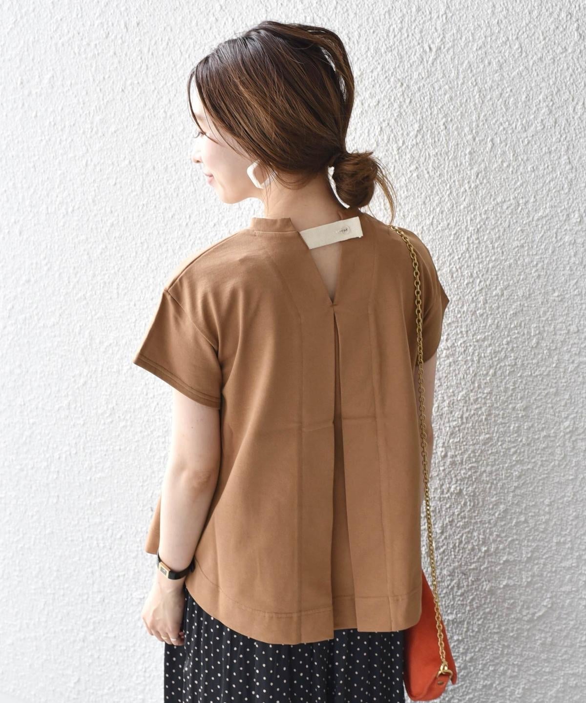 バックのテープがポイントになったカットソー。前はシンプルなので、ボトムも選ばずに合わせられます。