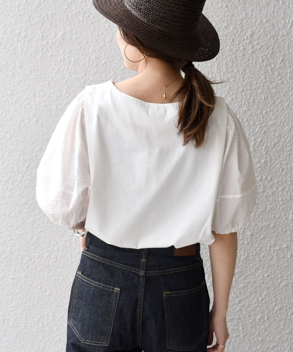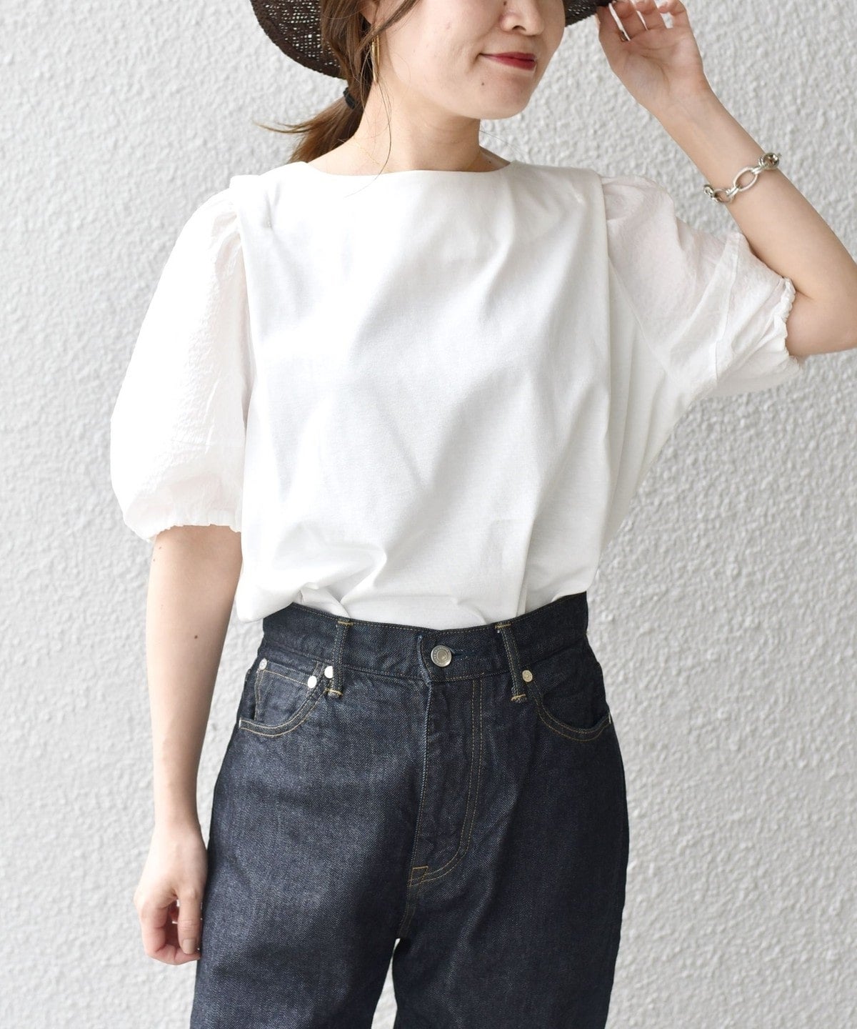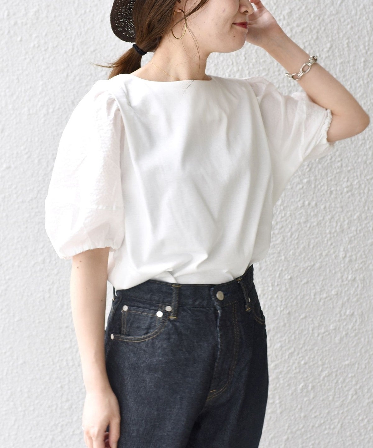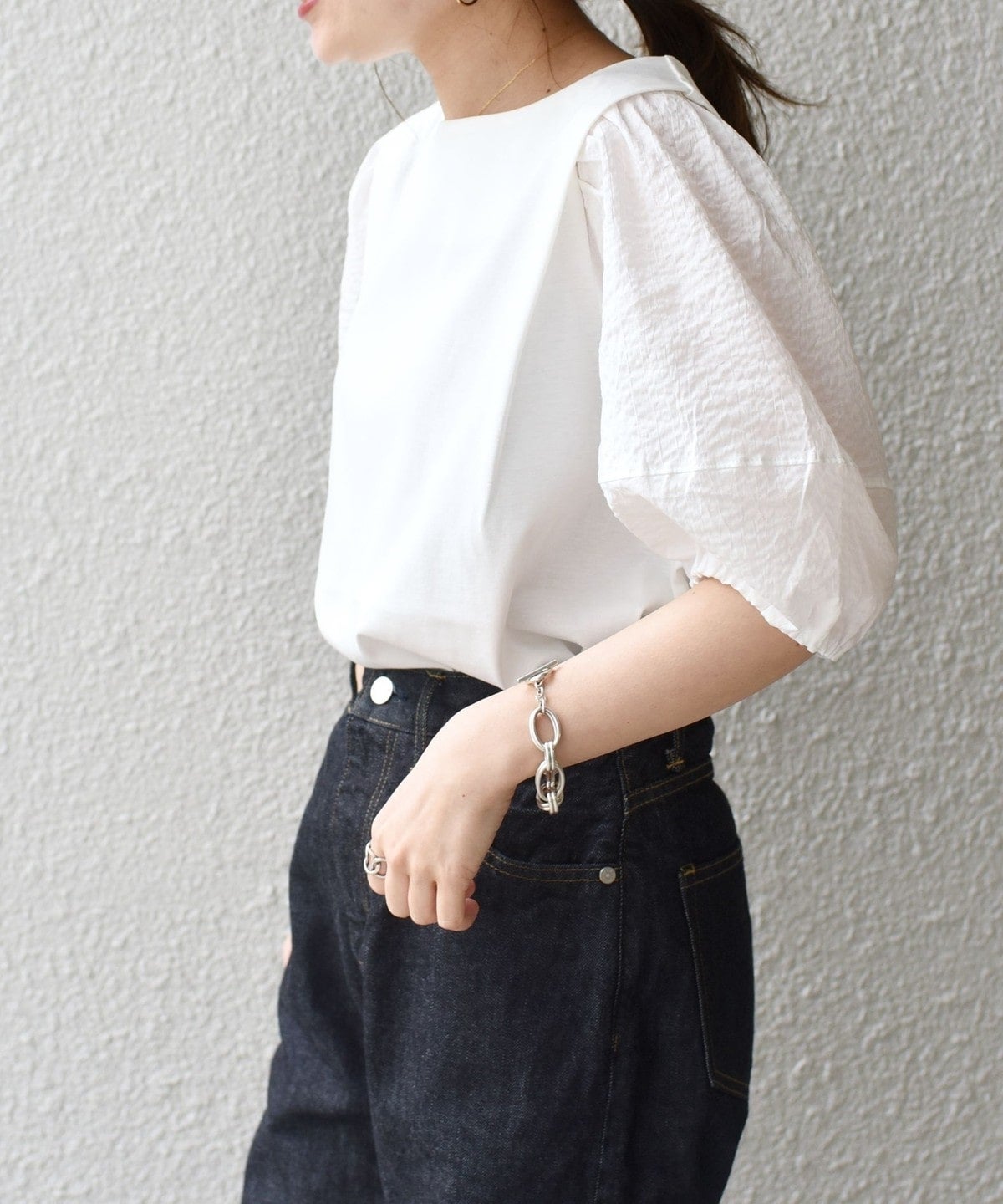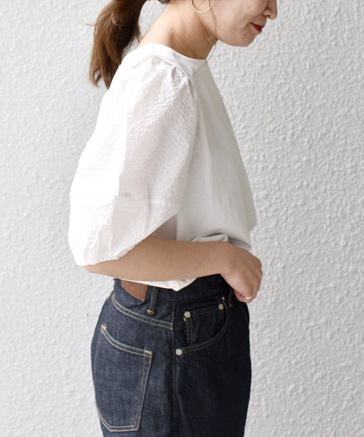 デザインポイントでもある立体的な袖に凹凸感ある布帛を使用しています。