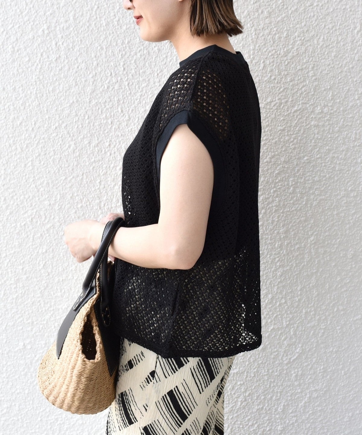 レースのシアー感とタイトすぎないシルエットが華奢見えし女性らしさを演出します。