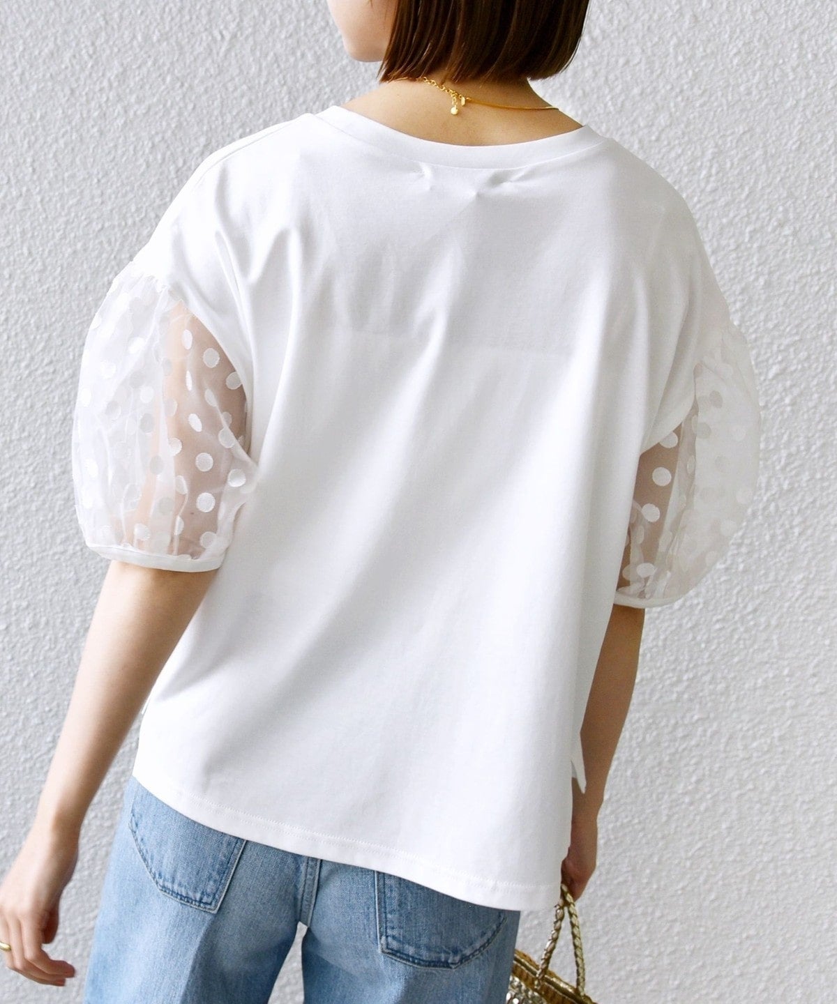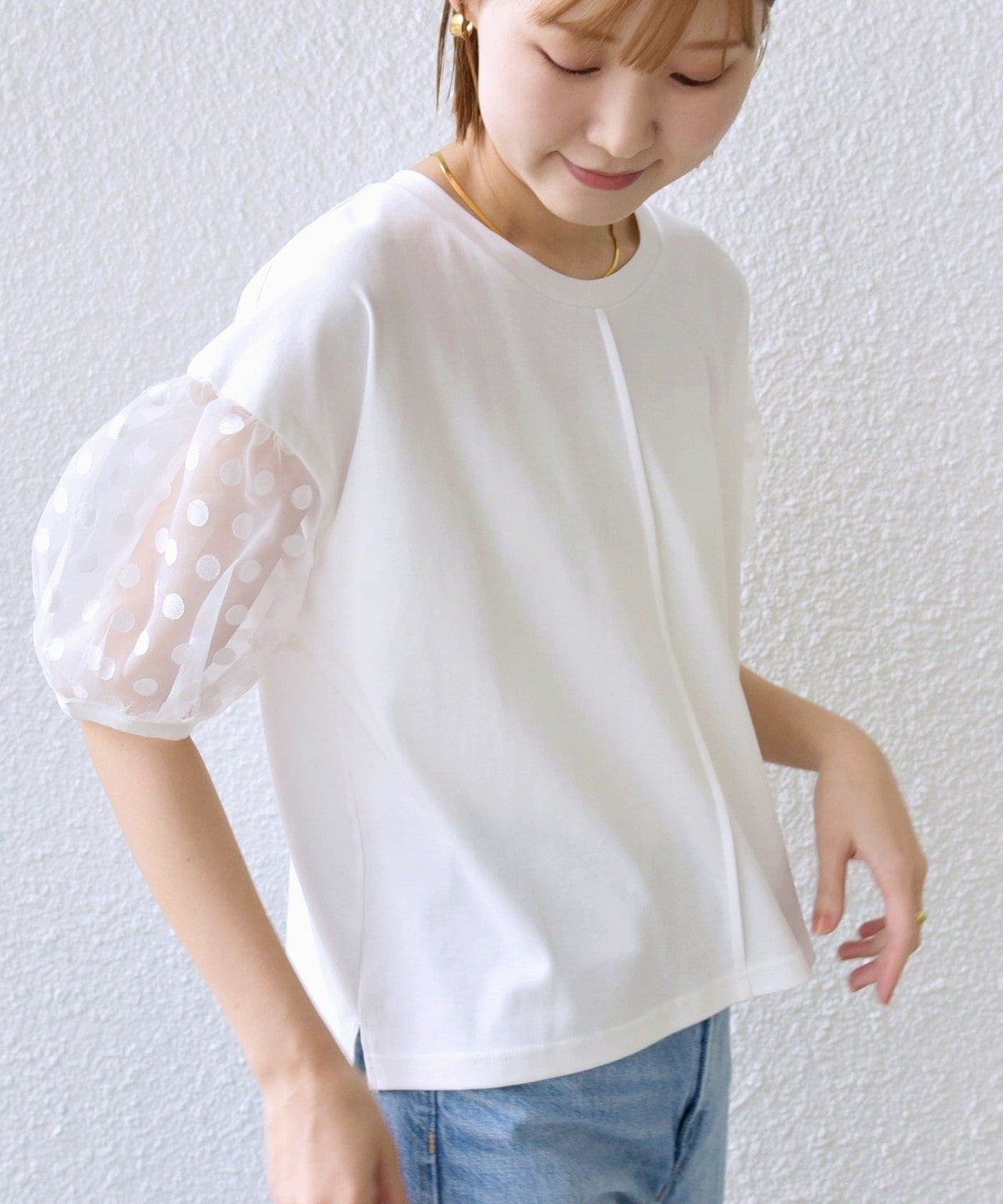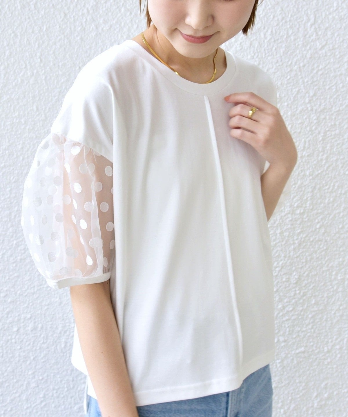 袖部分はシアー素材を使用していますが、ドットの柄が入ることで露骨に透けすぎず、挑戦しやすいデザインです。