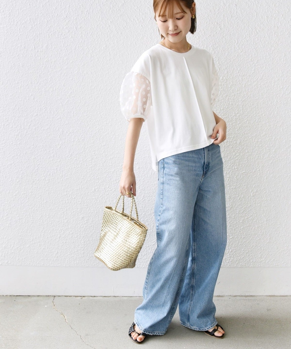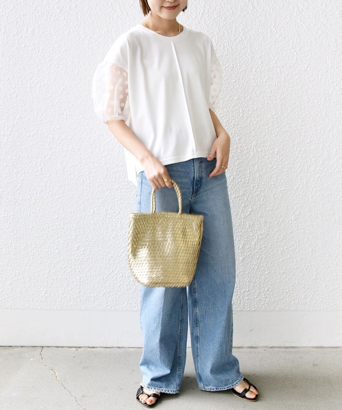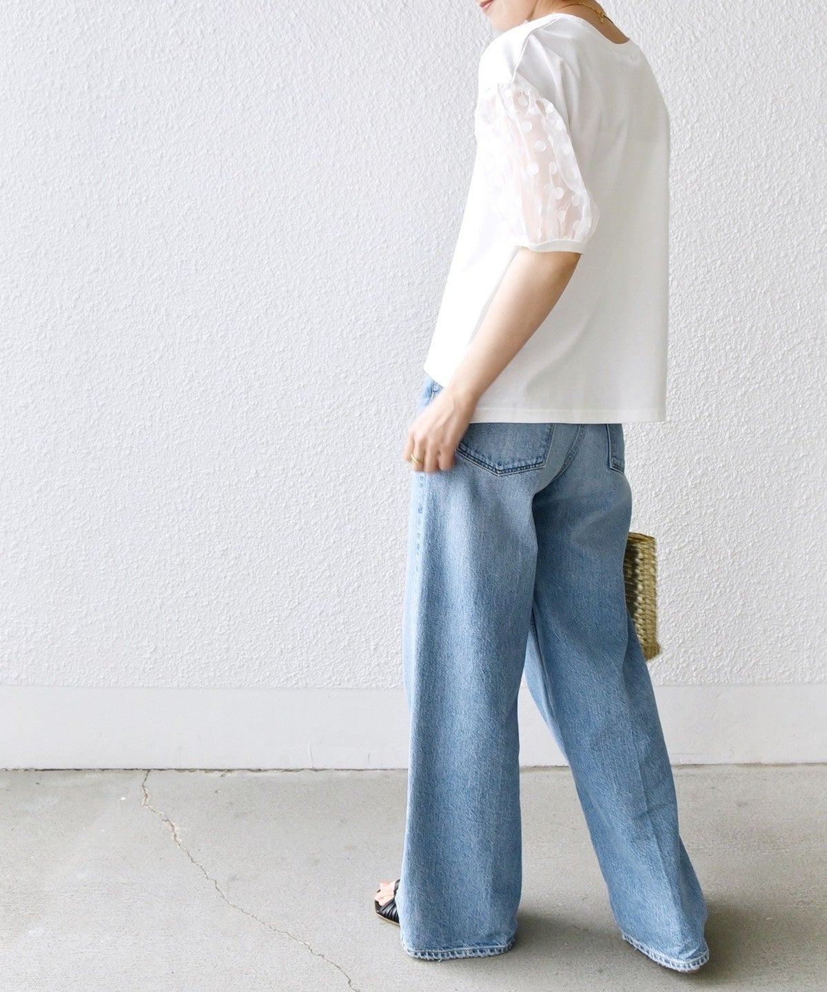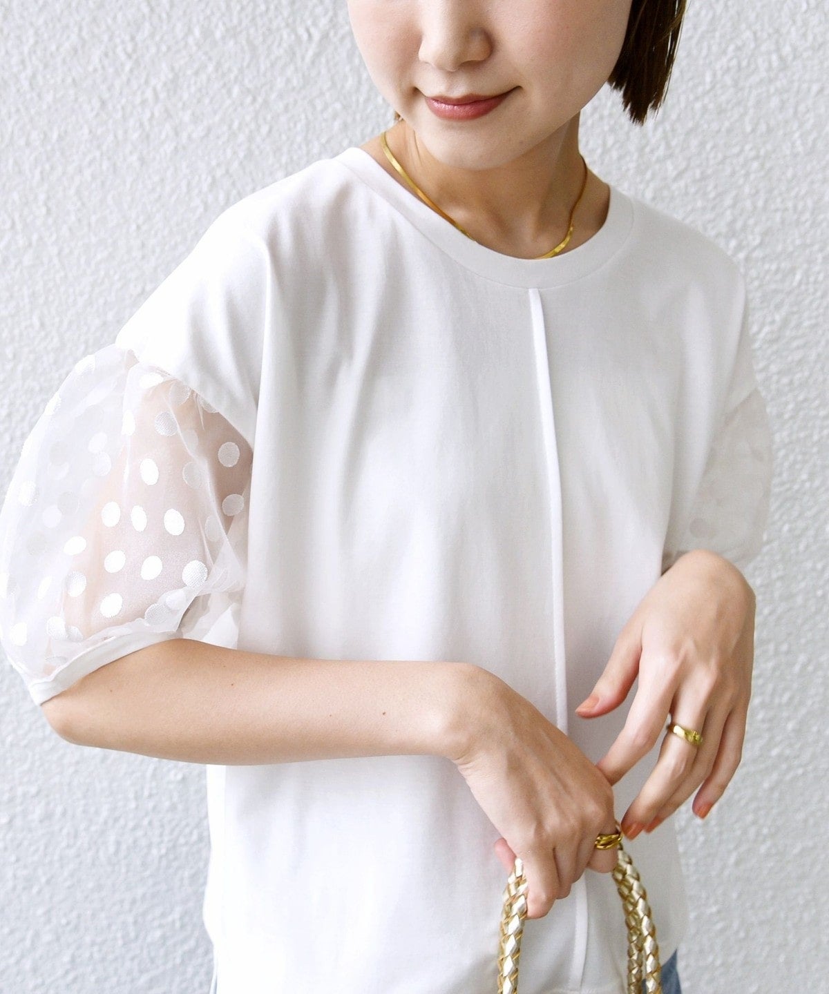 袖部分はシアー素材を使用していますが、ドットの柄が入ることで露骨に透けすぎず、挑戦しやすいデザインです。