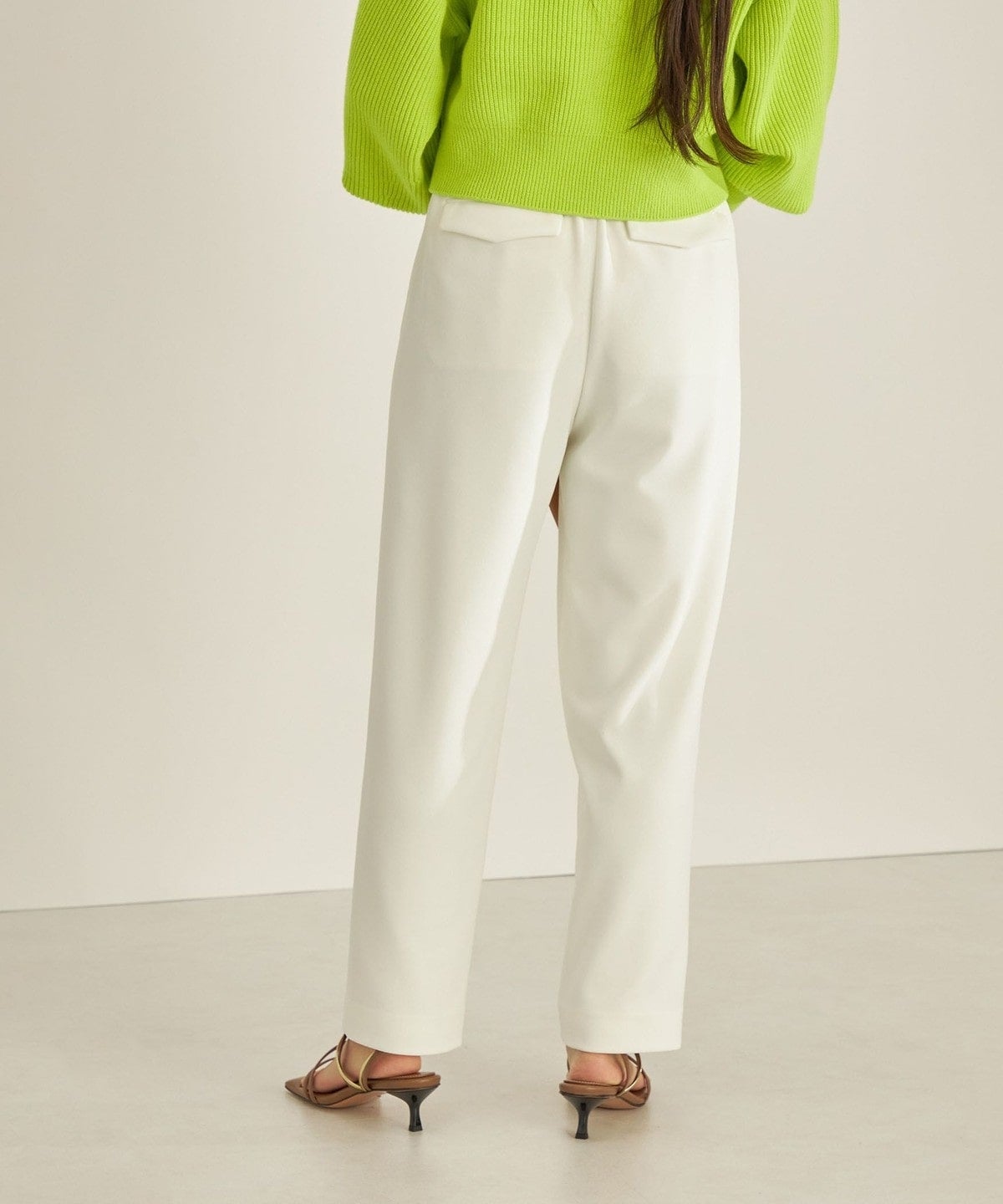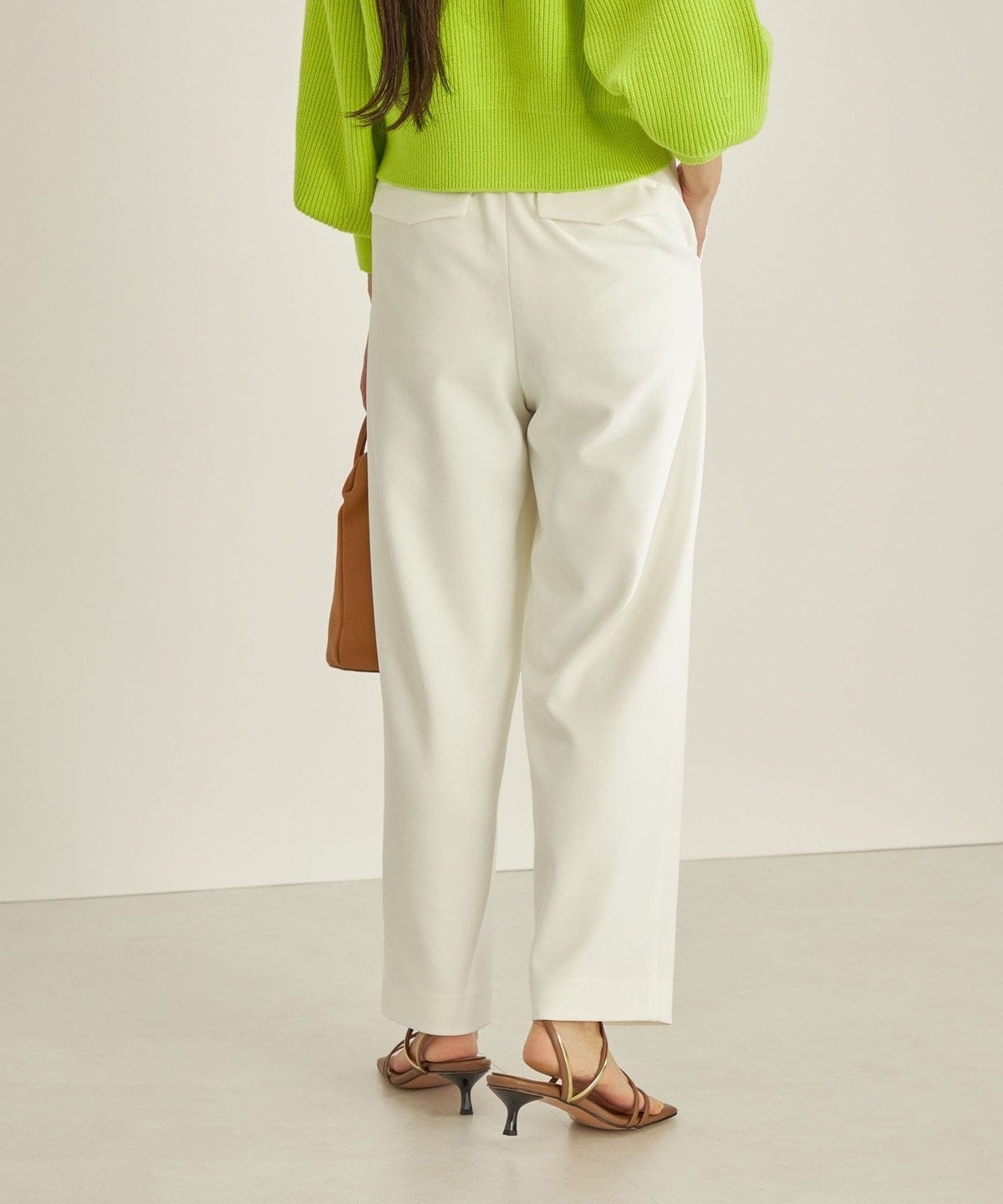 太めのベルトタブがアクセントに。後ろウエストはゴム仕様でストレスフリーな着心地です。