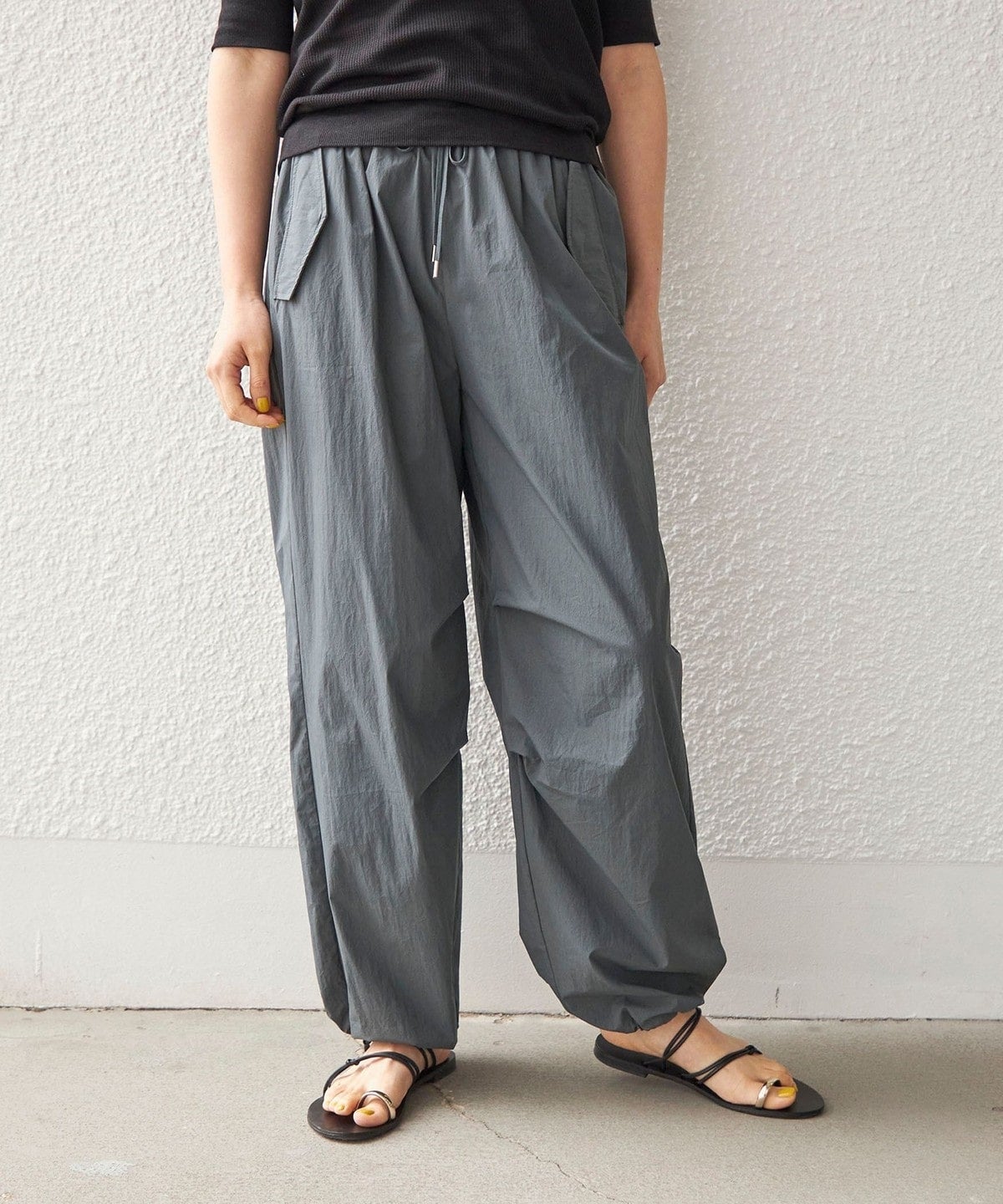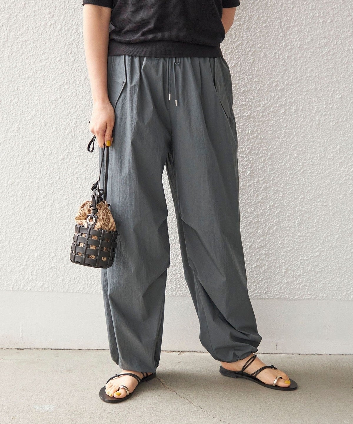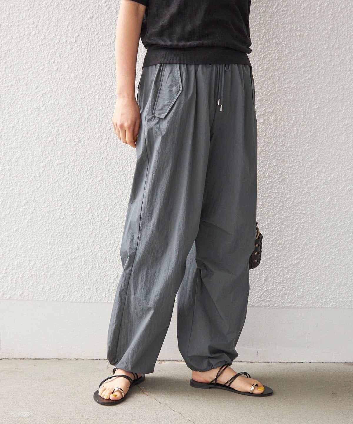 今季トレンドのスポーティなドロストパンツ。