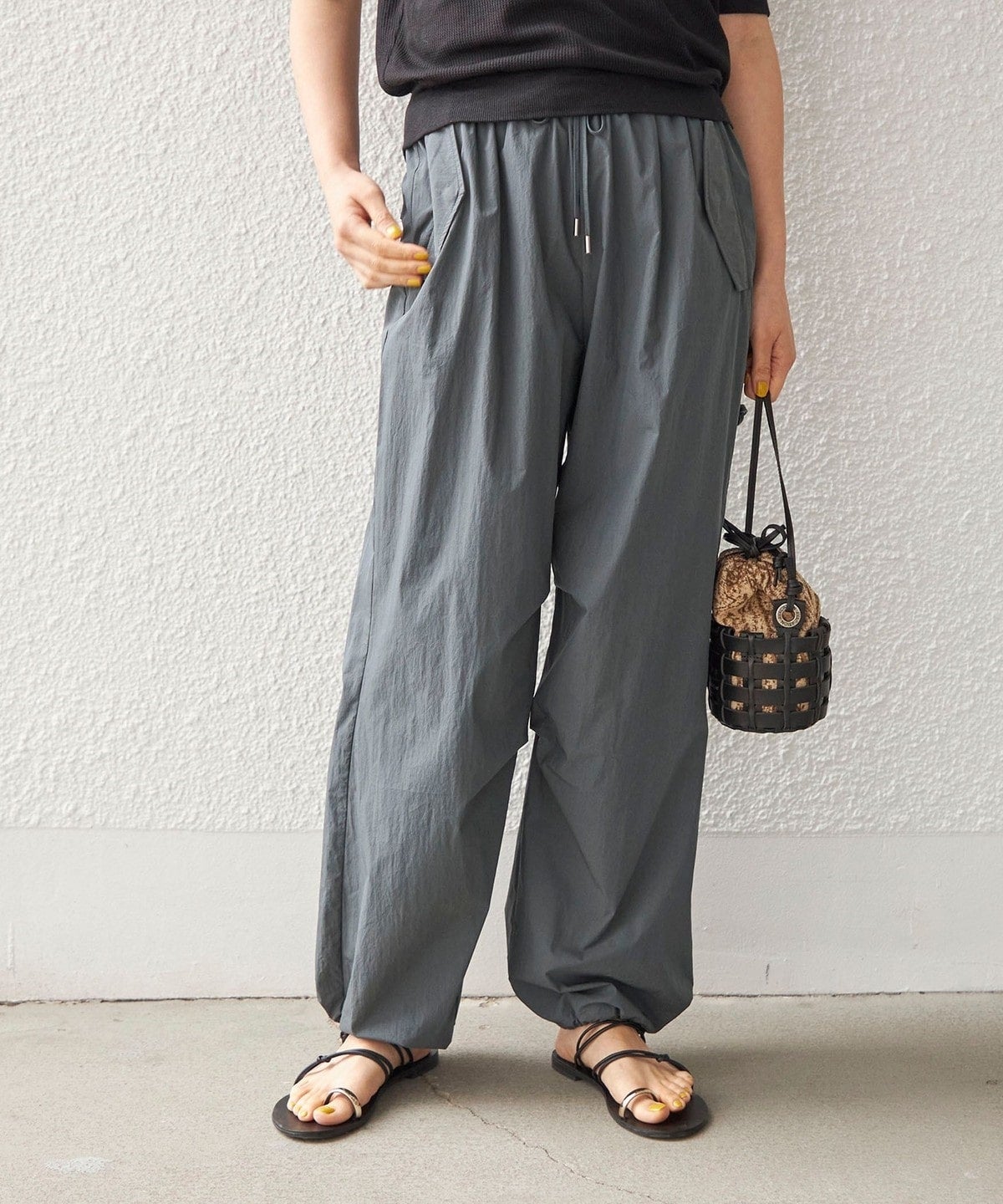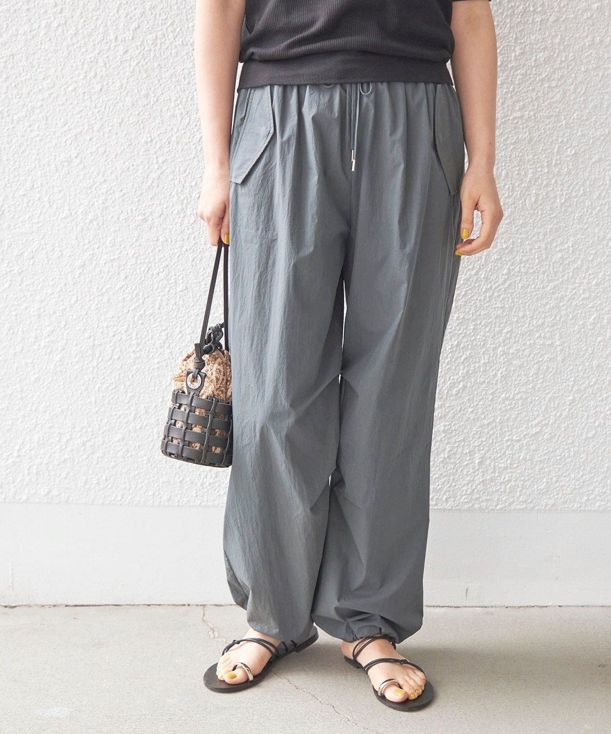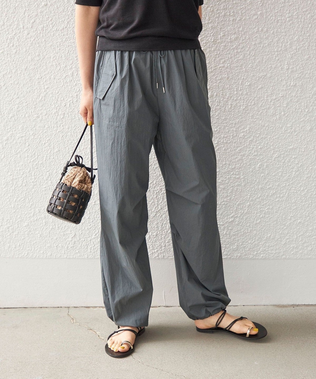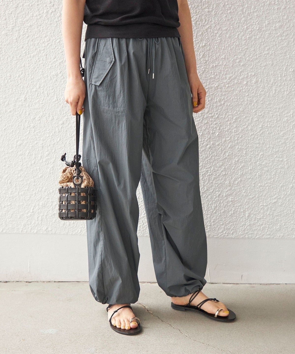 今季トレンドのスポーティなドロストパンツ。