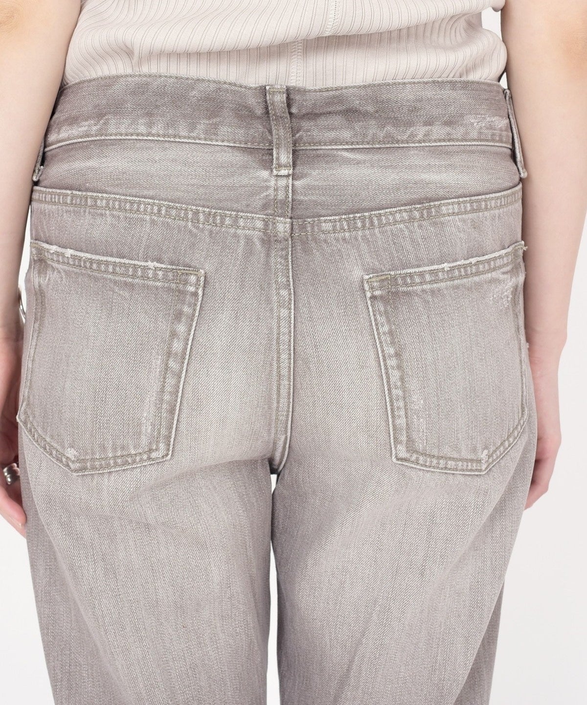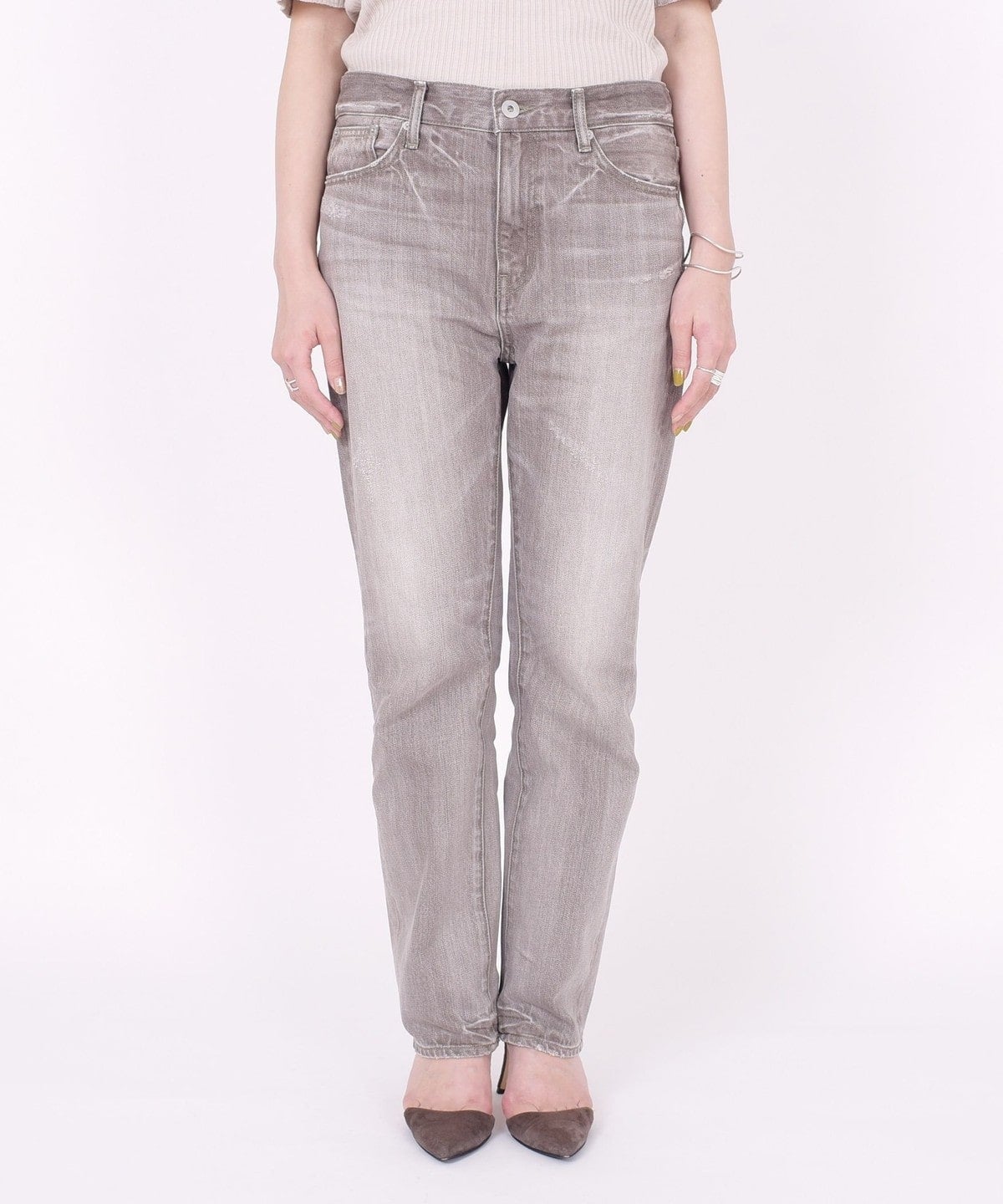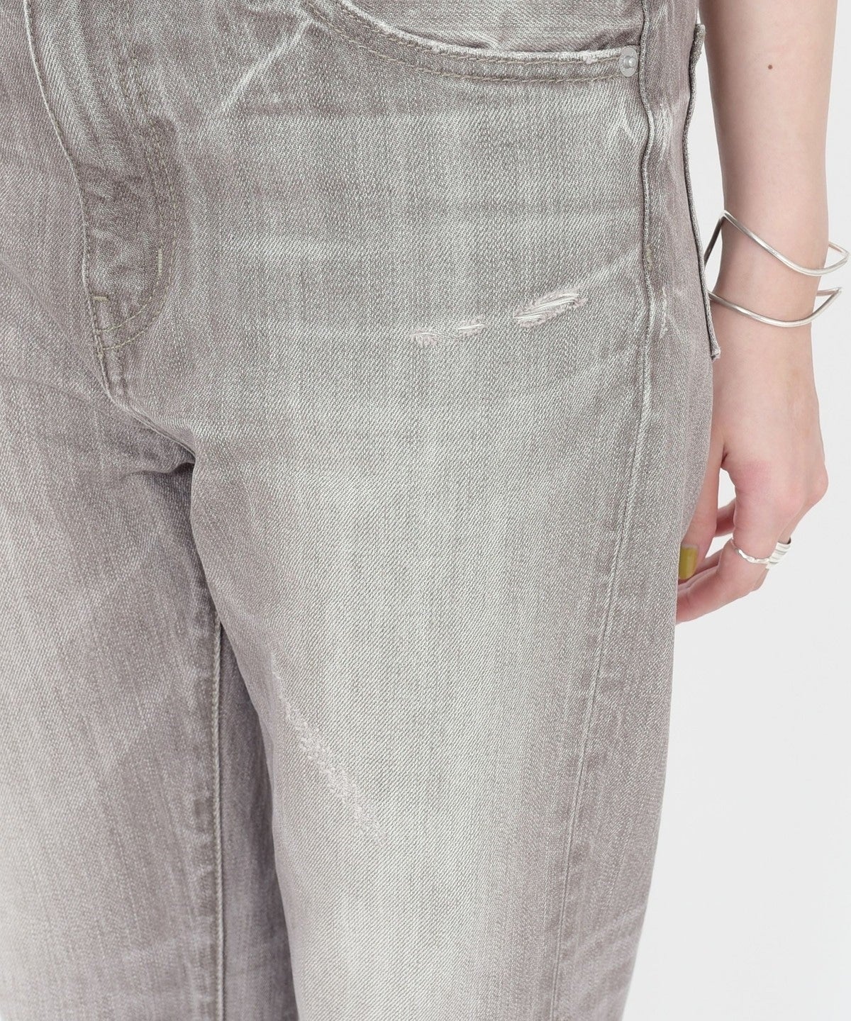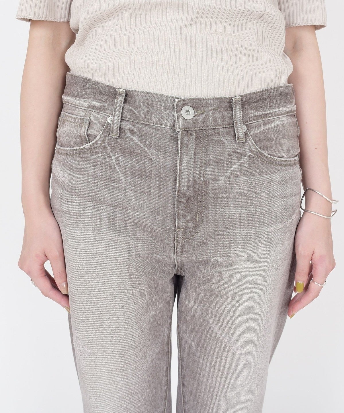 大人カジュアルコーディネートが決まるような加工感やシルエットが魅力のデニムです。