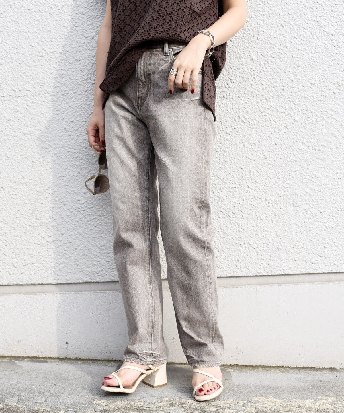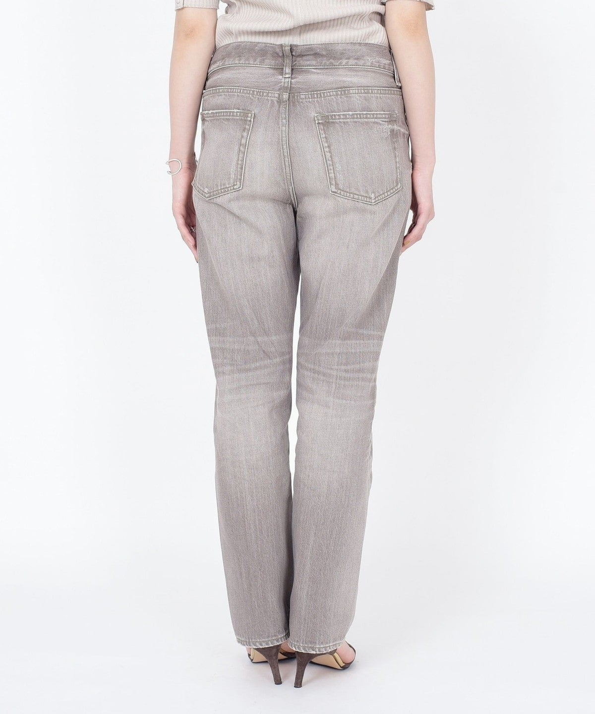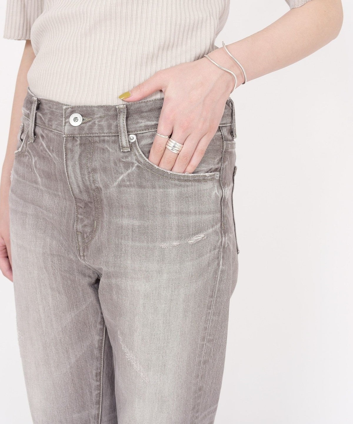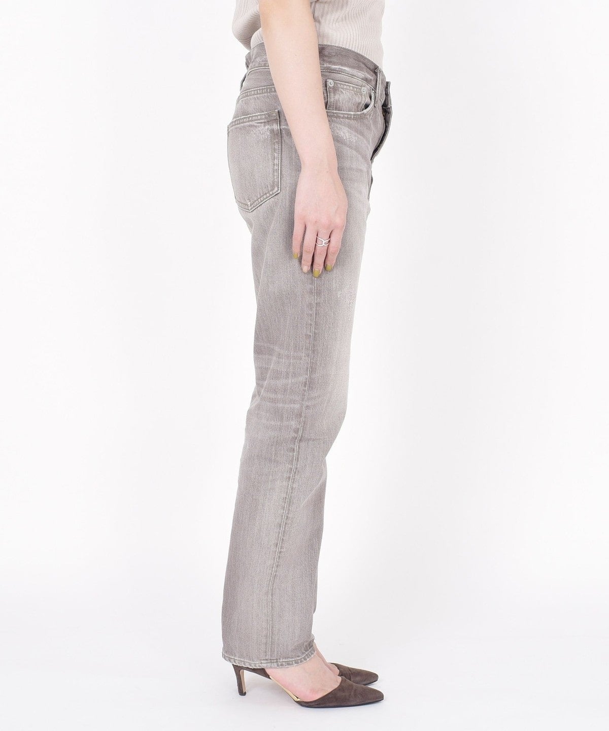 大人カジュアルコーディネートが決まるような加工感やシルエットが魅力のデニムです。