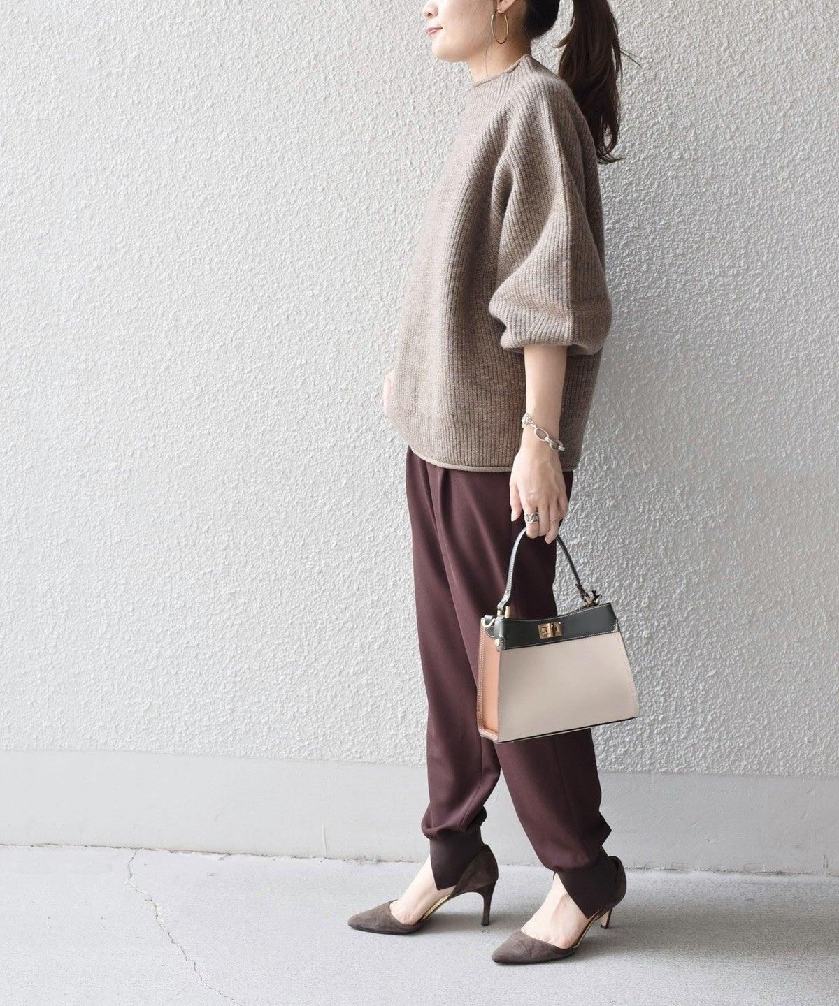 フロントのタック、シルエット、太めのウエスト幅でスポーティーな印象になりすぎないポイントをプラス。