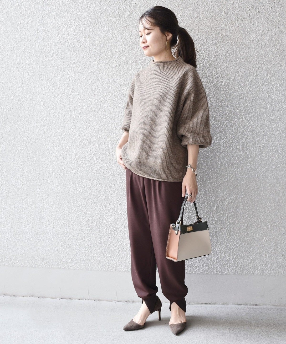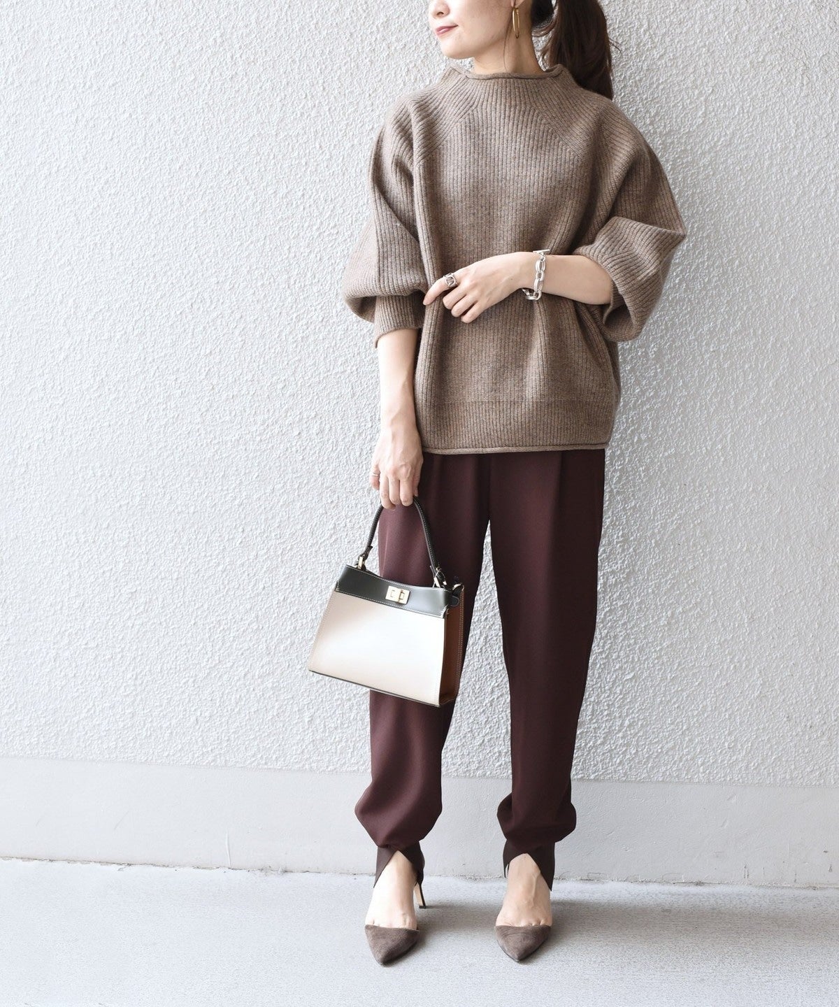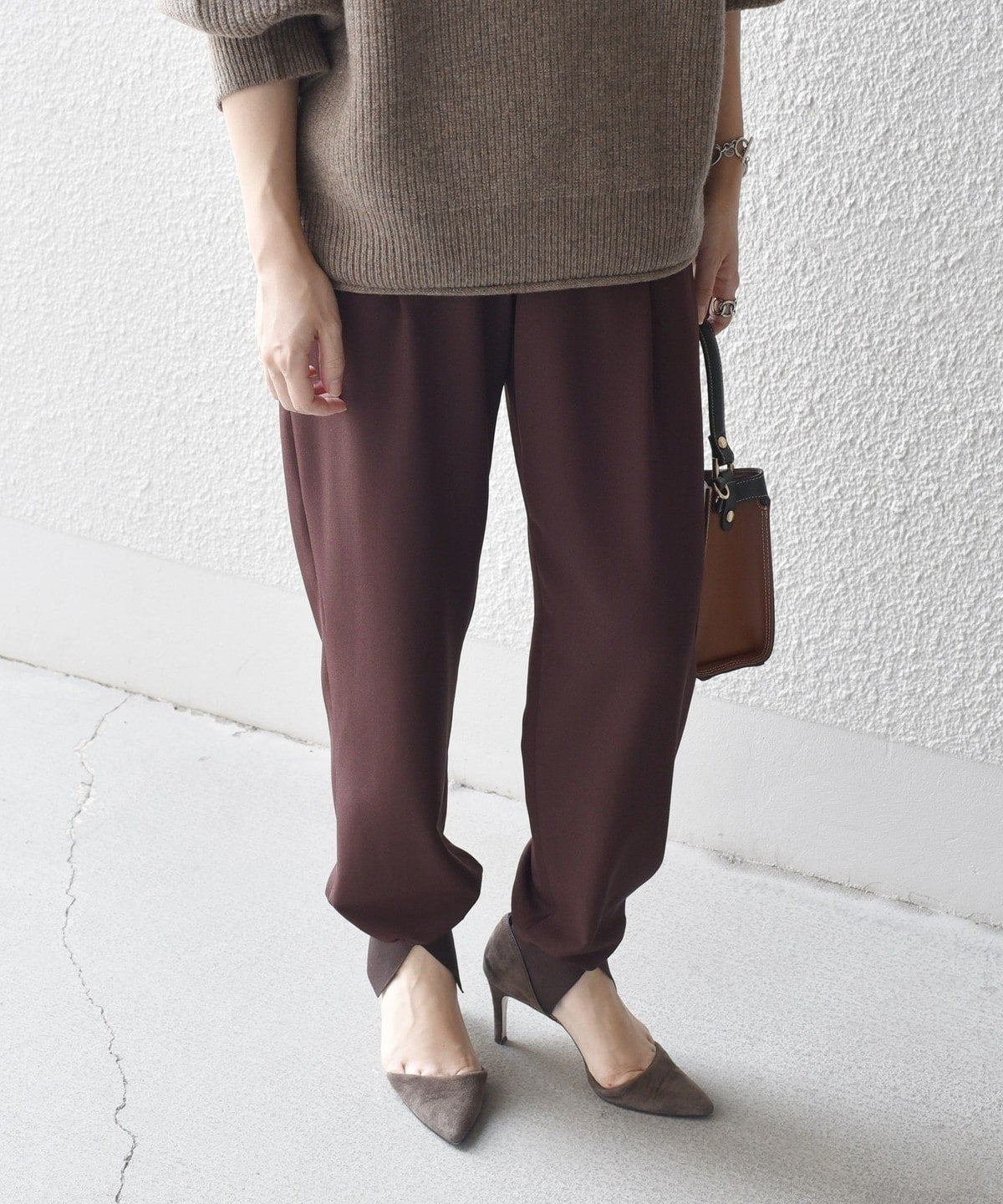 フロントのタック、シルエット、太めのウエスト幅でスポーティーな印象になりすぎないポイントをプラス。