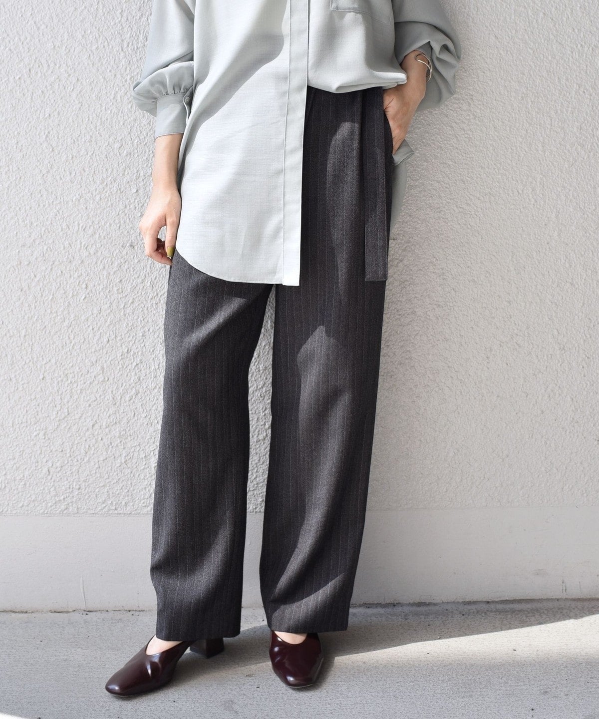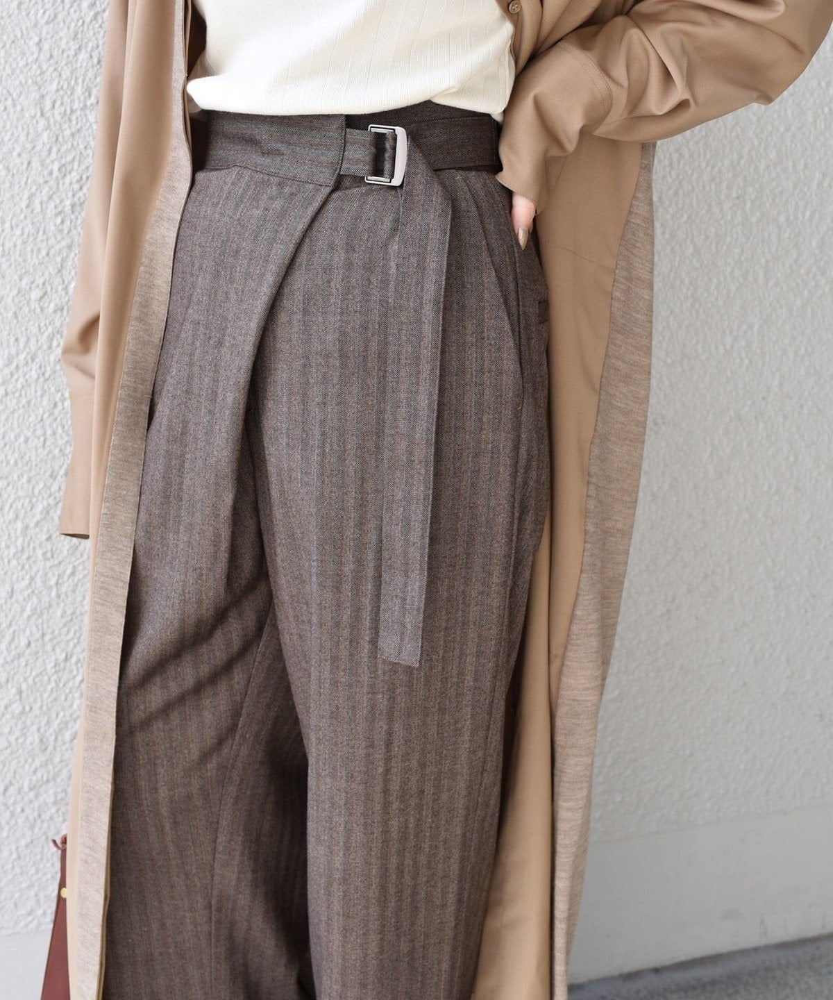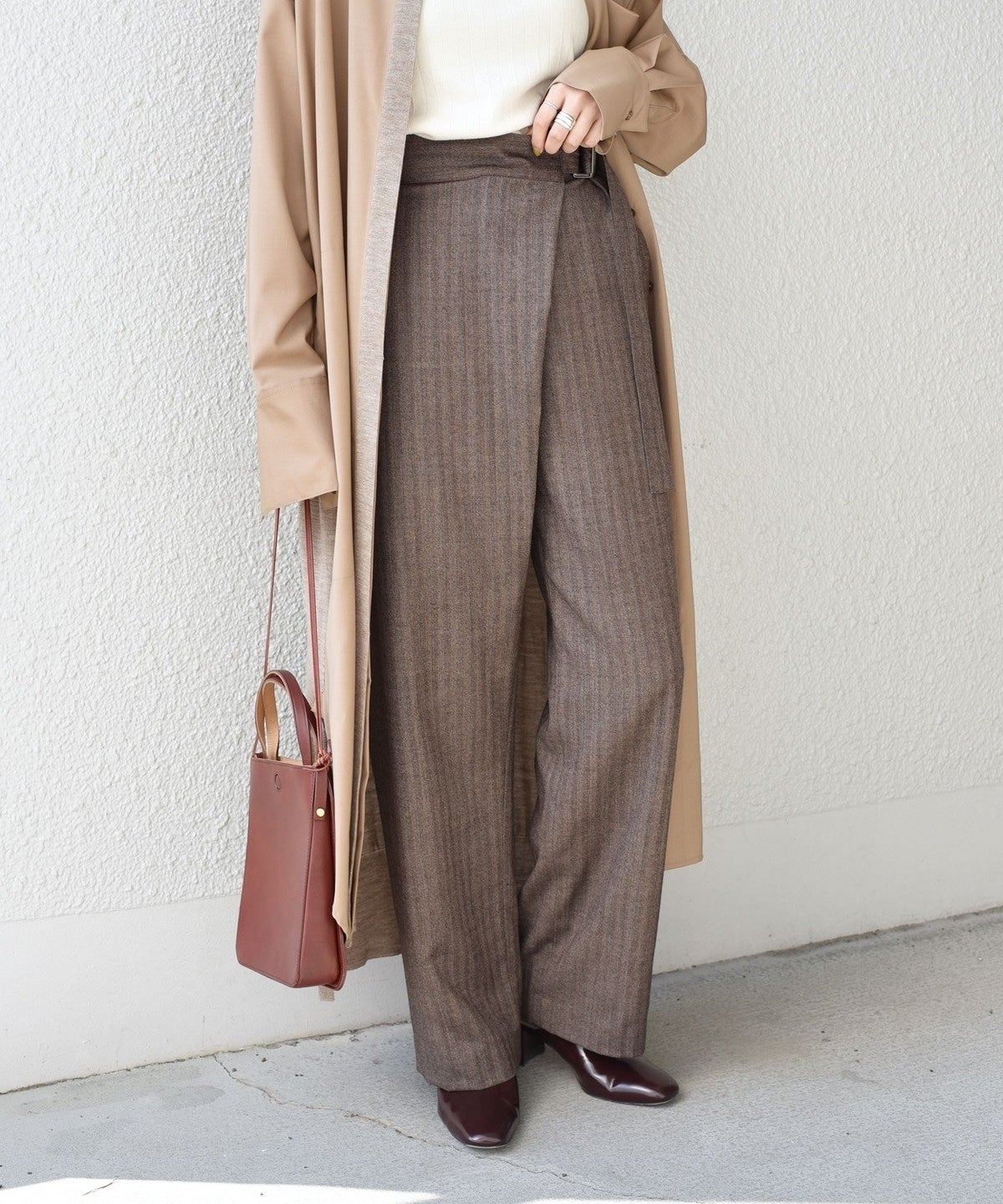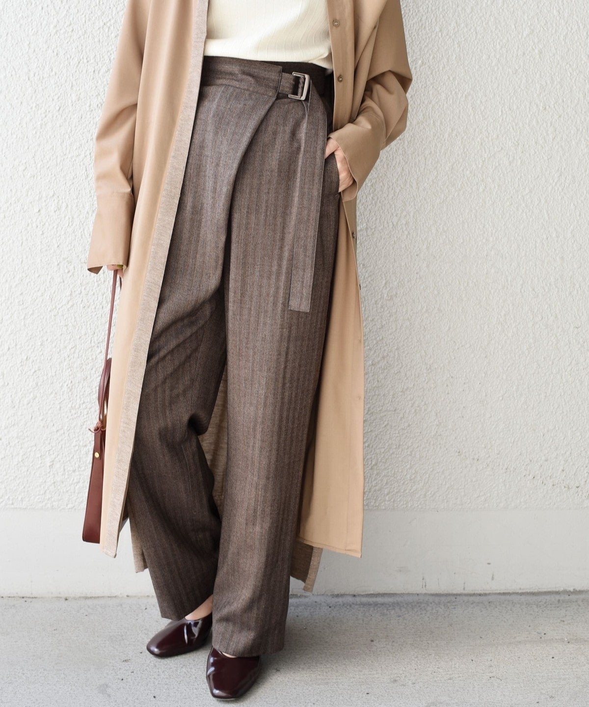 ウエストのベルトをキュッとしてボリュームを付けて履きたいこのラップパンツは、トップスをインした着こなしにも大活躍。