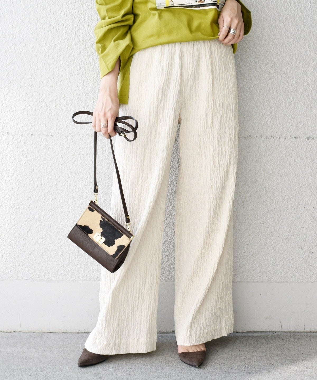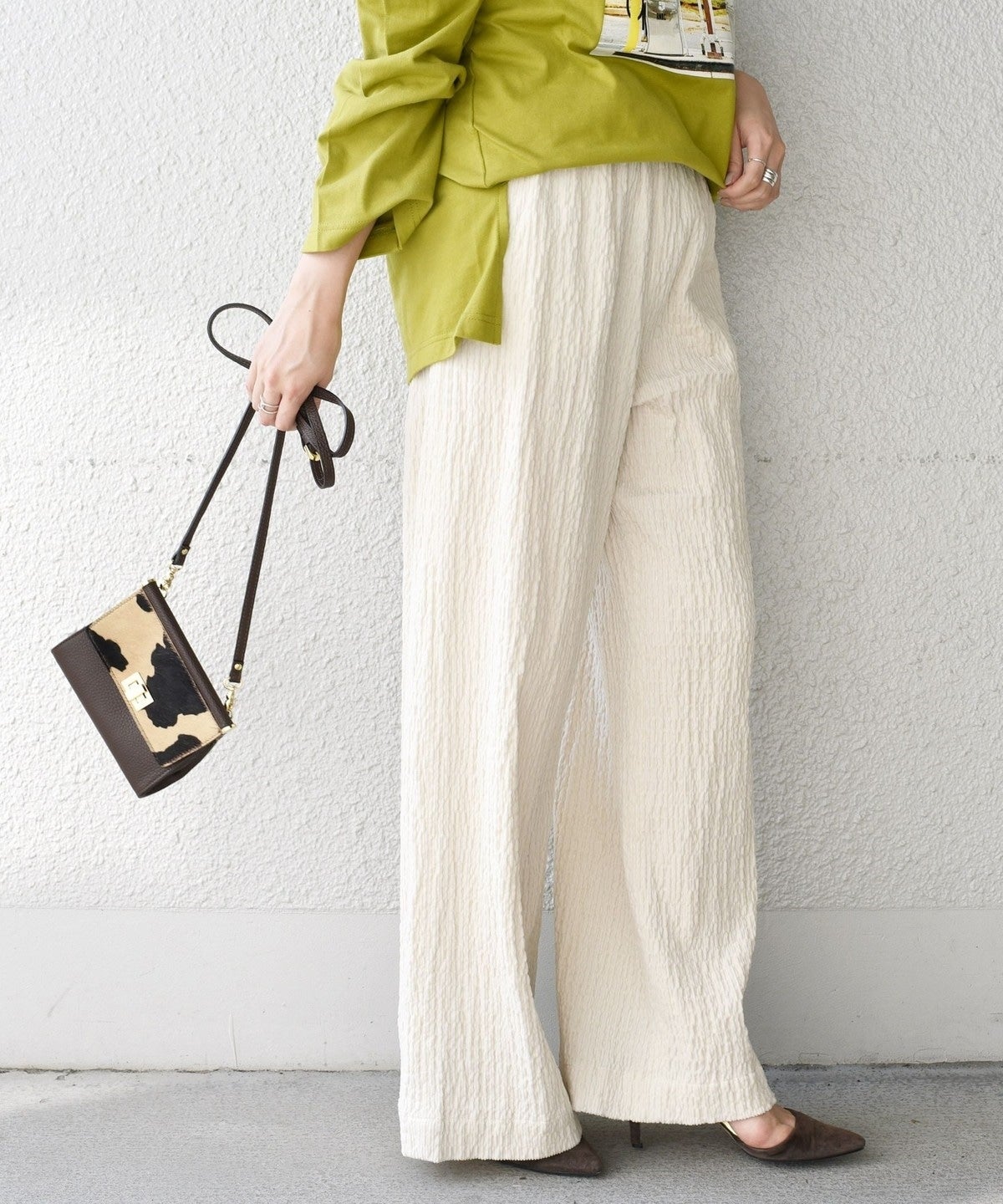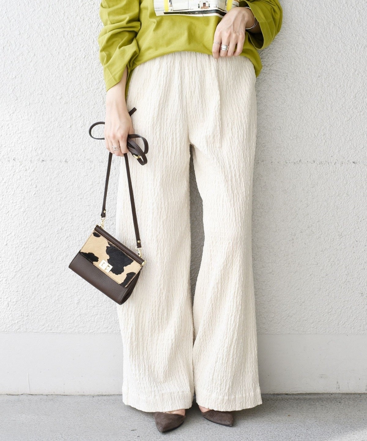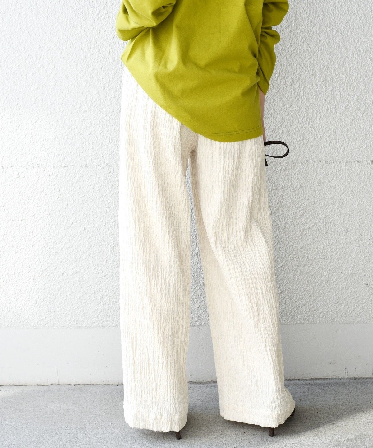履き心地抜群のワイドイージーパンツにシャーリングしたコーデュロイの素材をのせました。