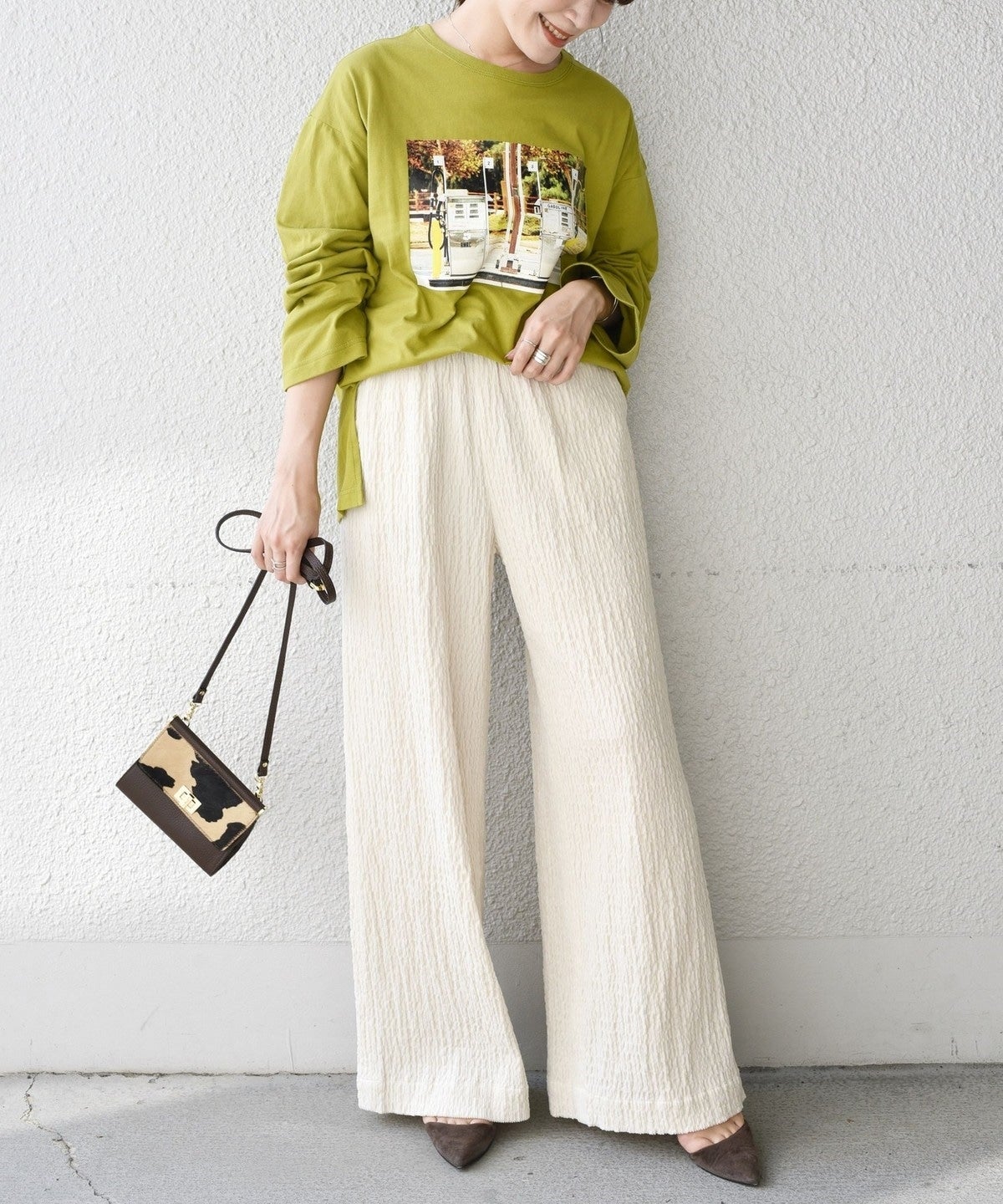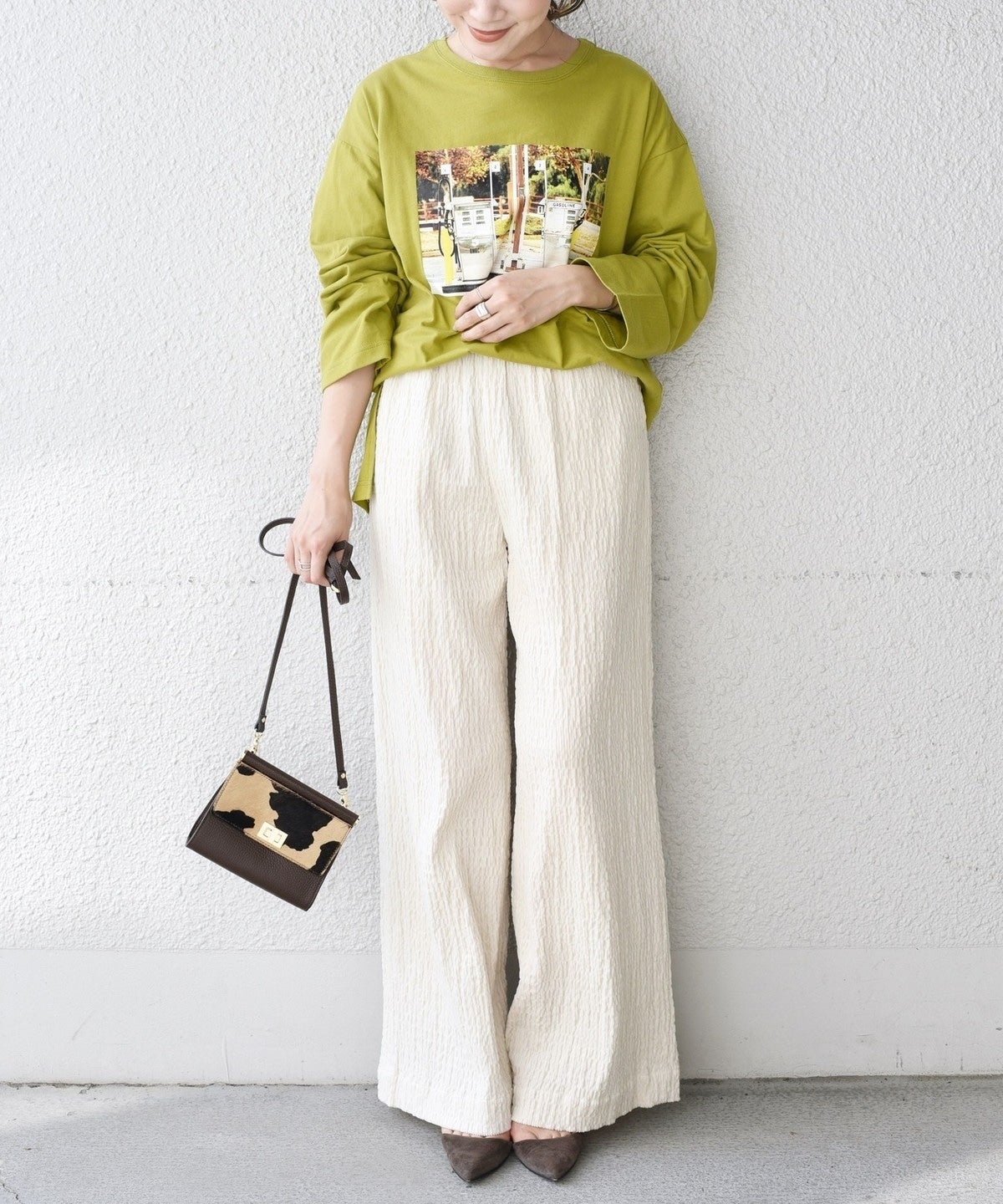 ワイド型なので足のラインを拾わず楽に履けるパンツです。ウエストはゴムなのでストレスフリーなのも◎。