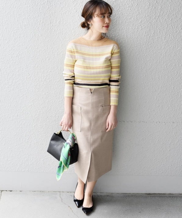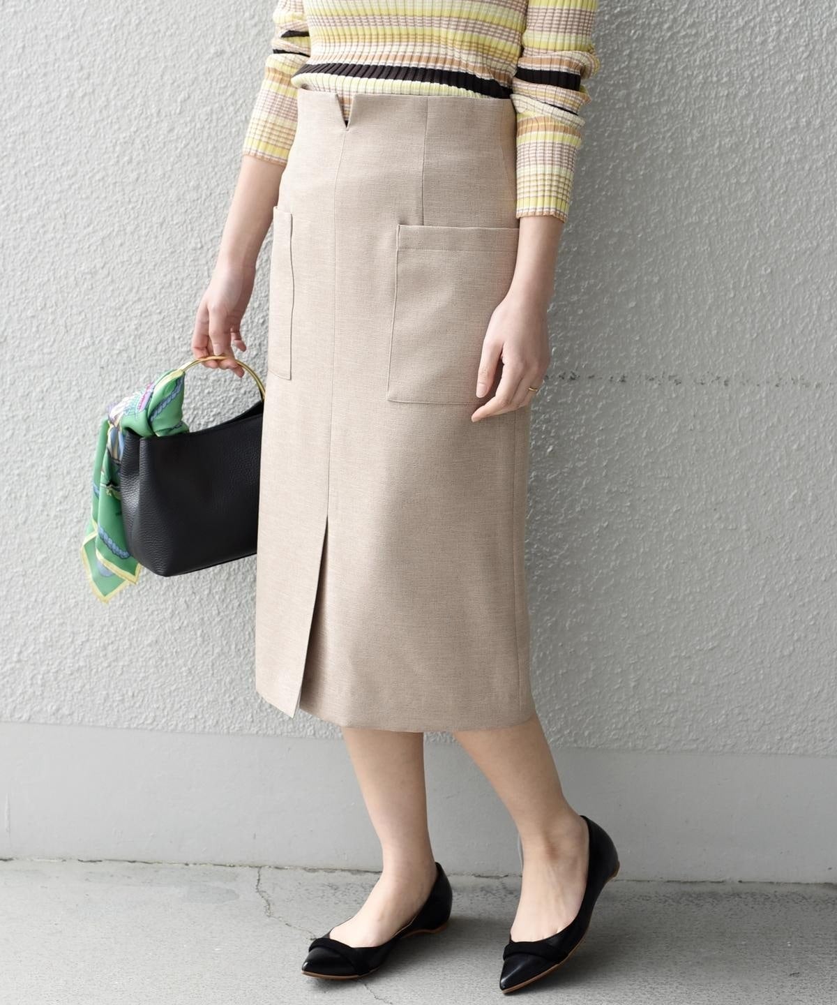 ハイウエストのタイトスカートはスッキリとした大人な印象の一枚。サイドのポケットがアクセントで、程良い丈感がお仕事にもオススメです。