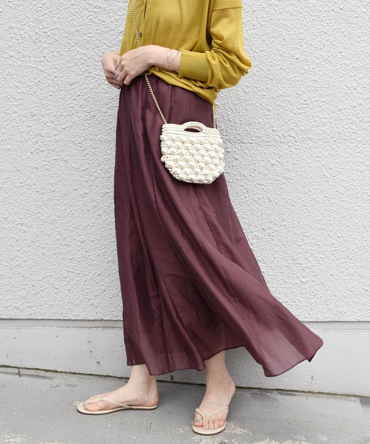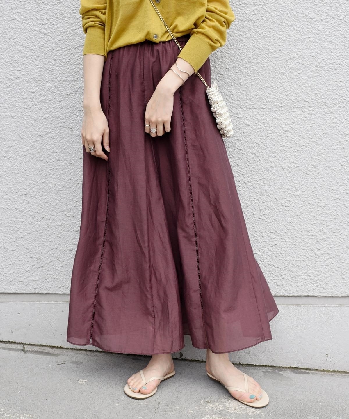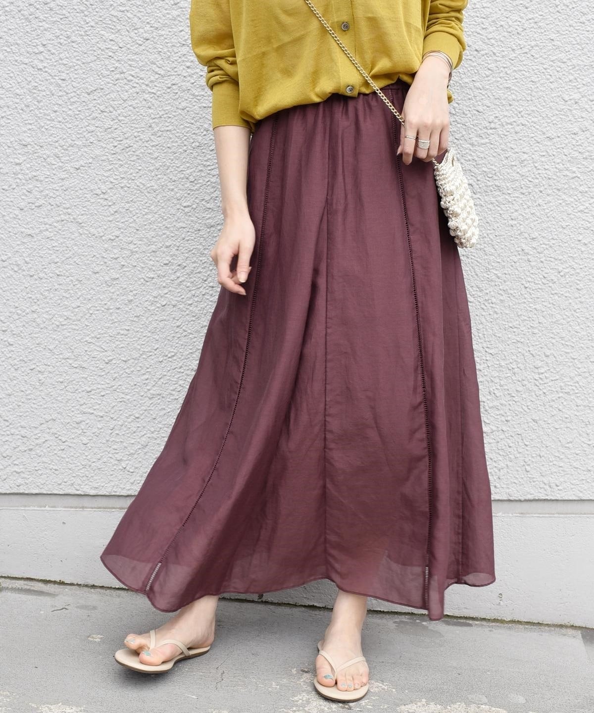 裾の程よい透け感が涼しげなロングスカートは、シルクの上品な光沢感が大人カジュアルに決まるデザイン。