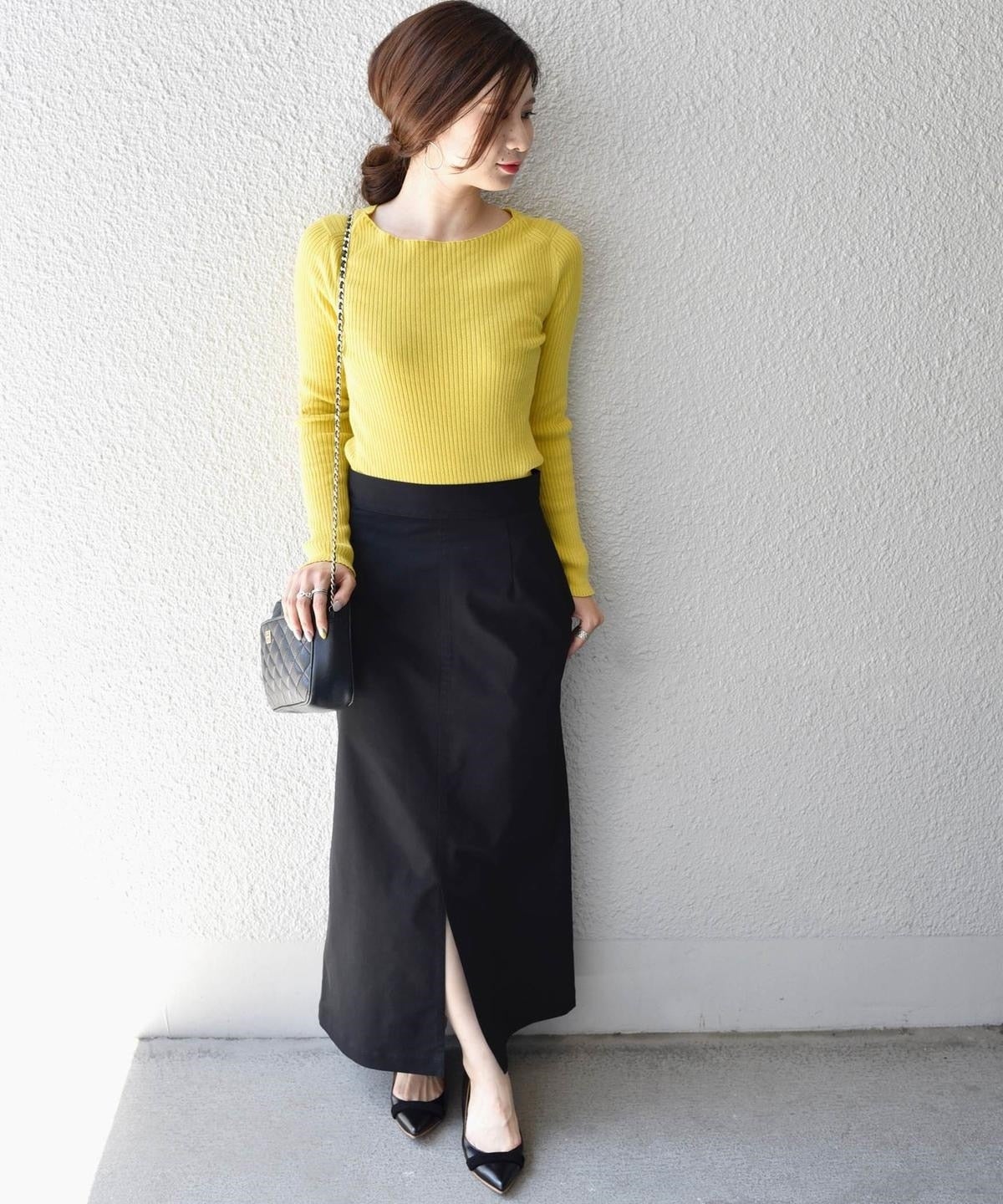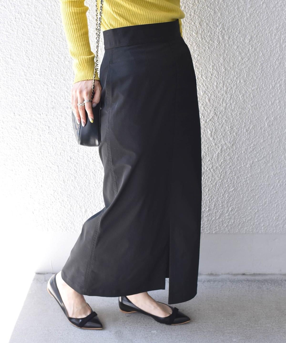 すっきりとしたシルエットが落ち着いた印象のアイテム。スリットが入っているので足さばきも良く、カジュアルにも綺麗めにも着ていただける一枚です◎