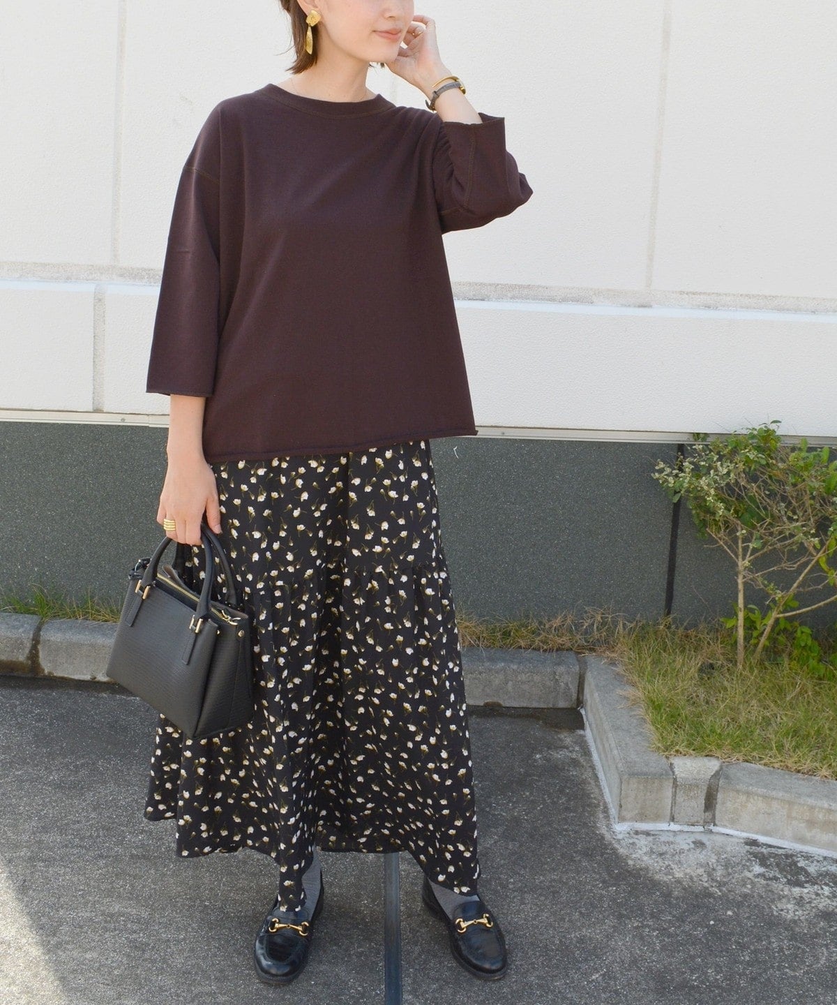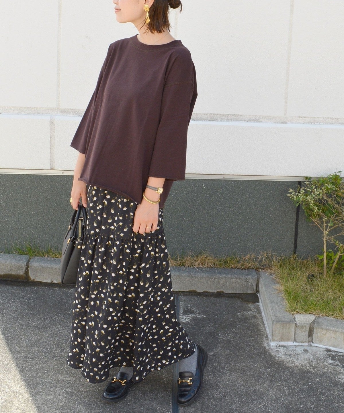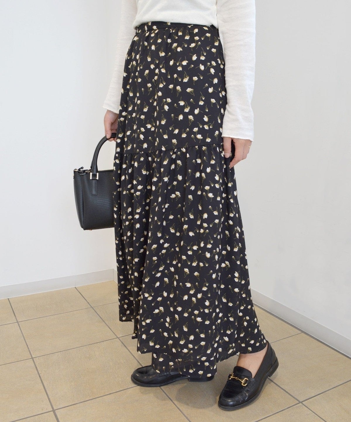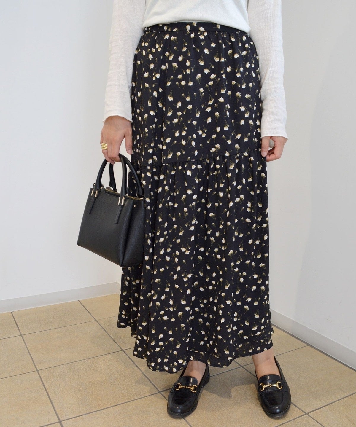 秋ベースの濃色に、差し色のイエローやオレンジのつぼみプリントが華やかさのあるスカート。