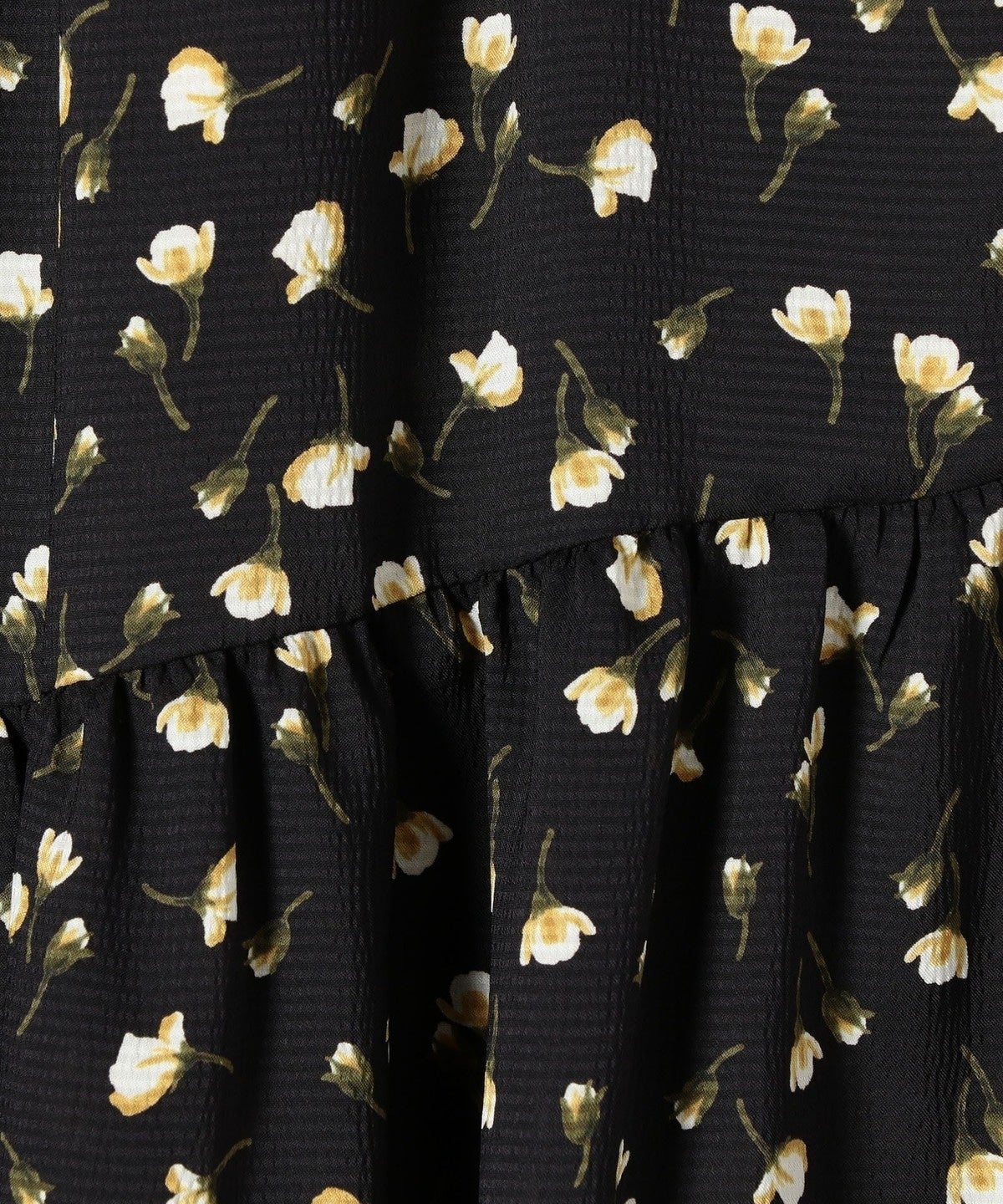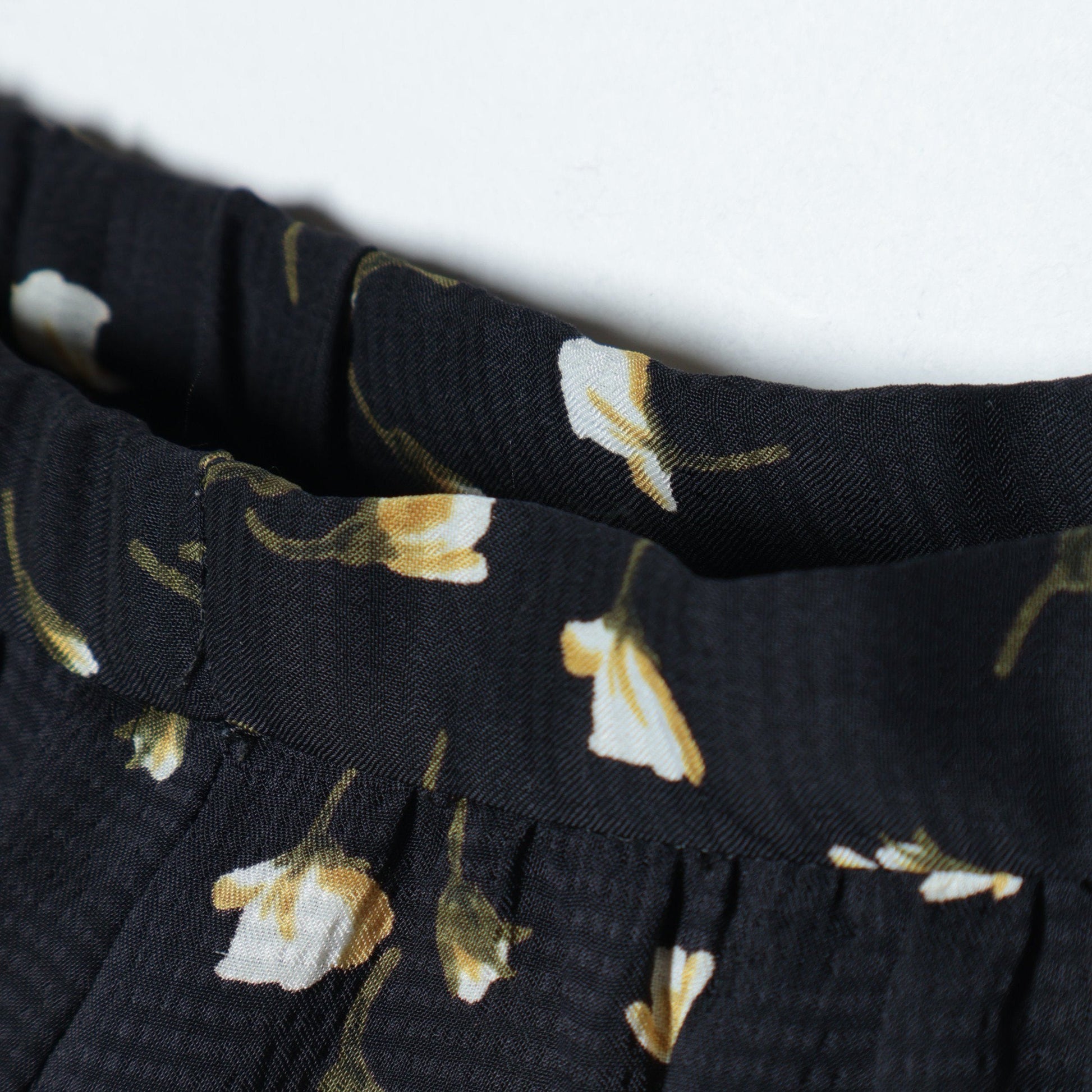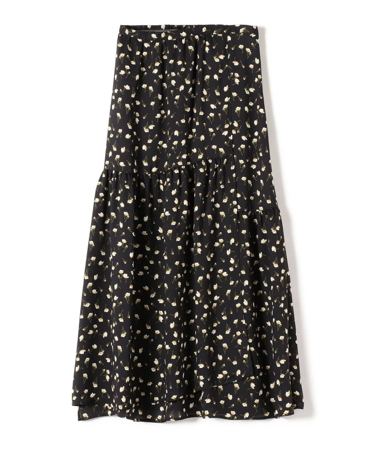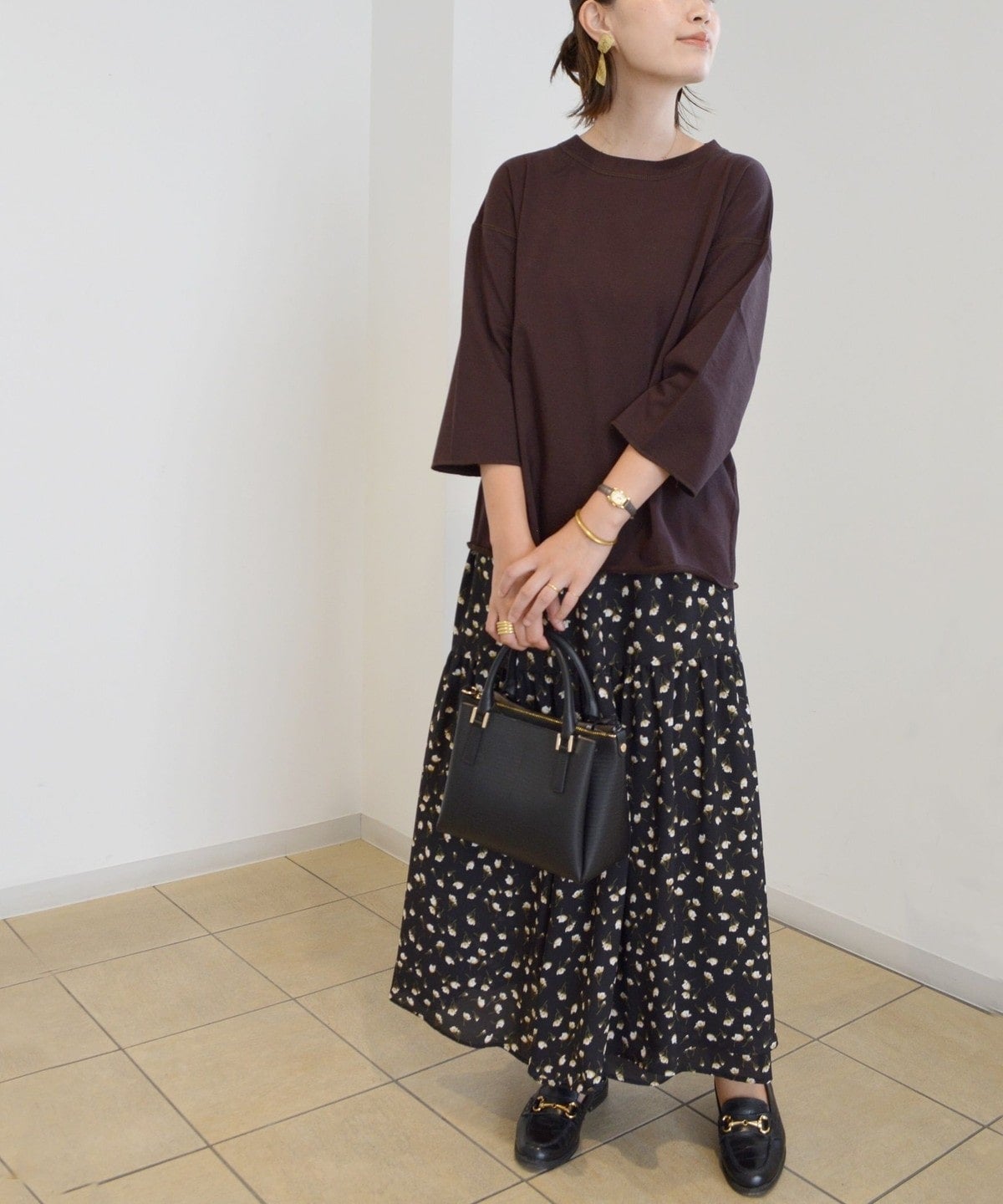 秋ベースの濃色に、差し色のイエローやオレンジのつぼみプリントが華やかさのあるスカート。
