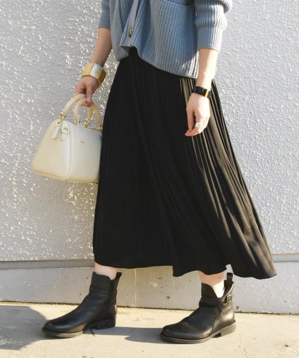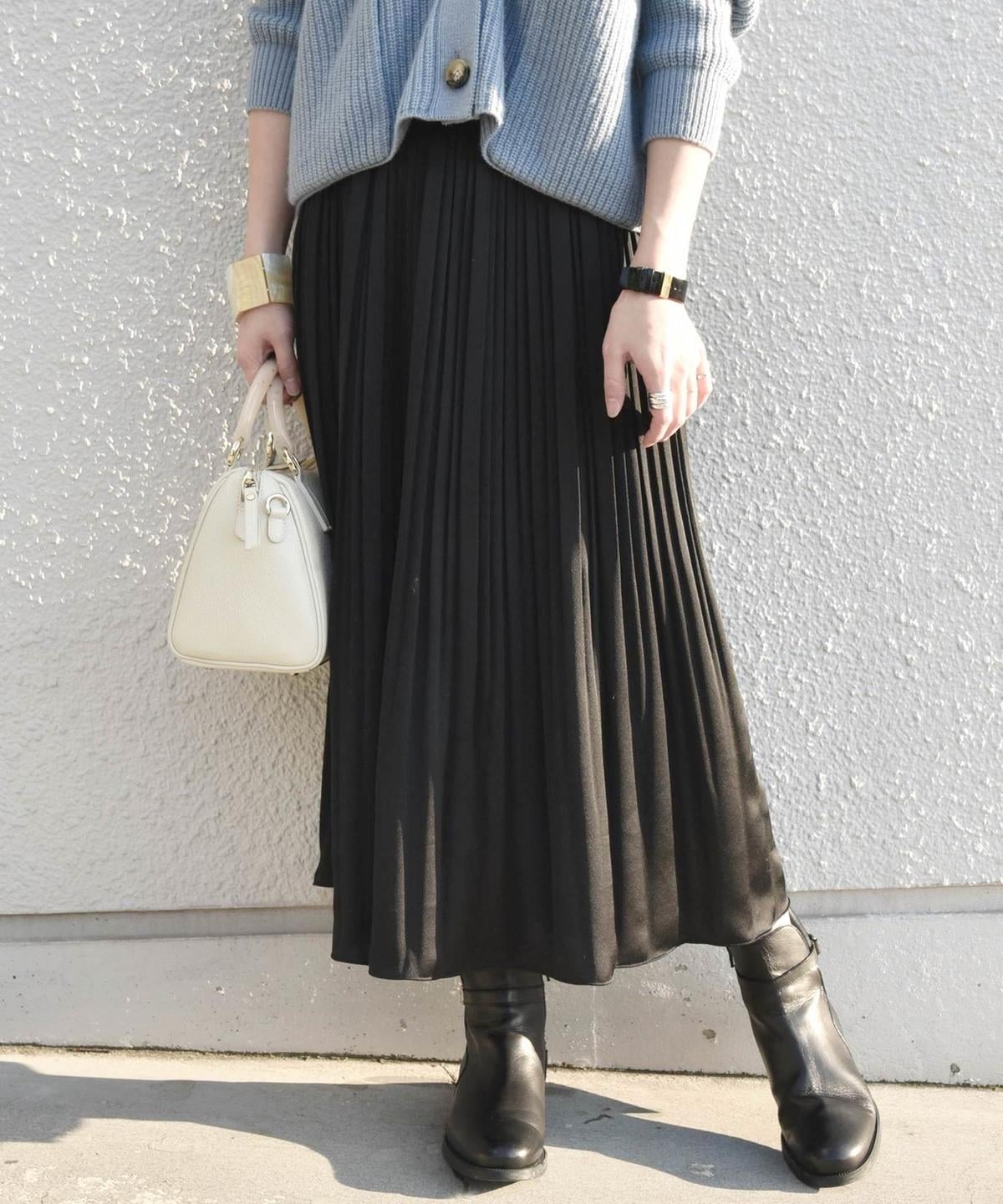 程良い光沢感が上品なスカートはオンオフ問わず使える優秀アイテム。