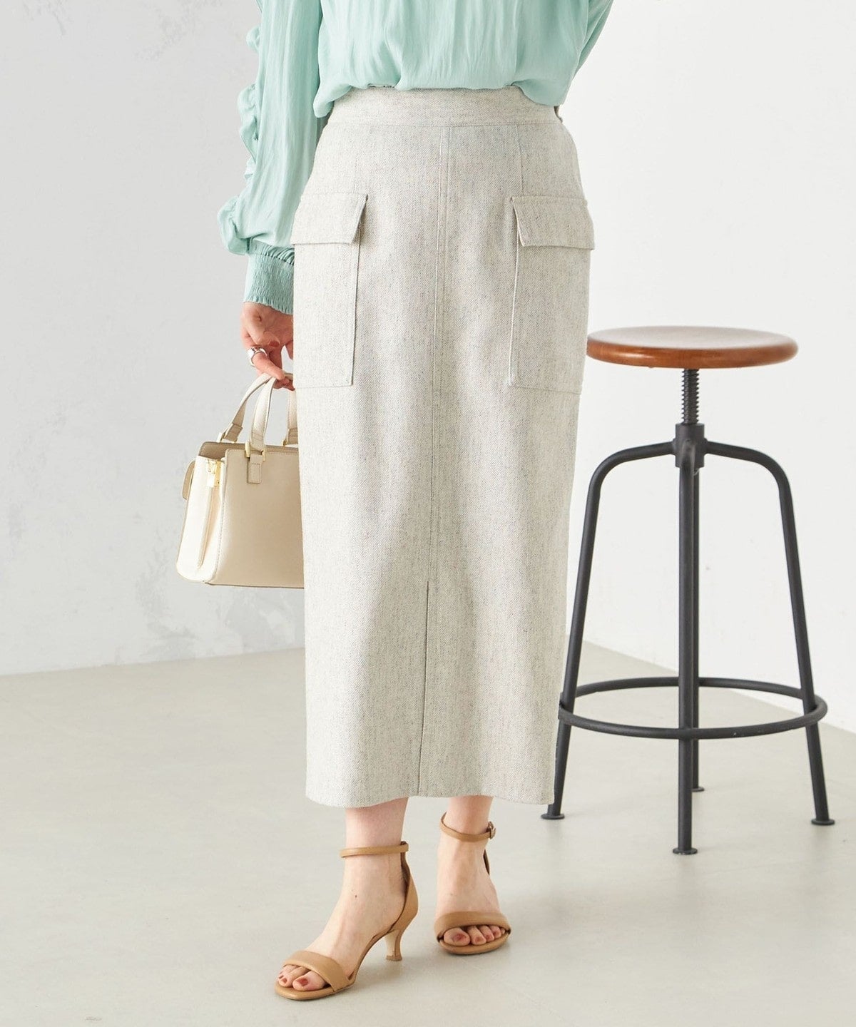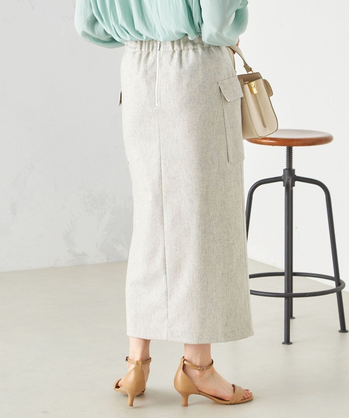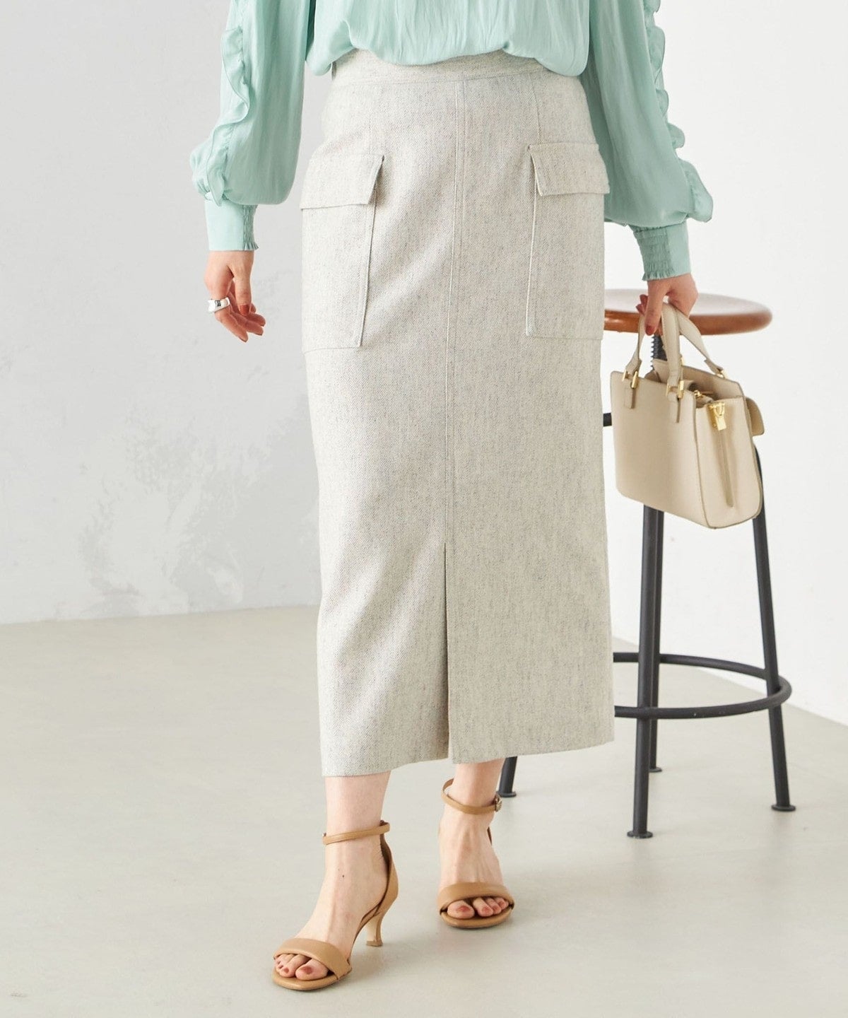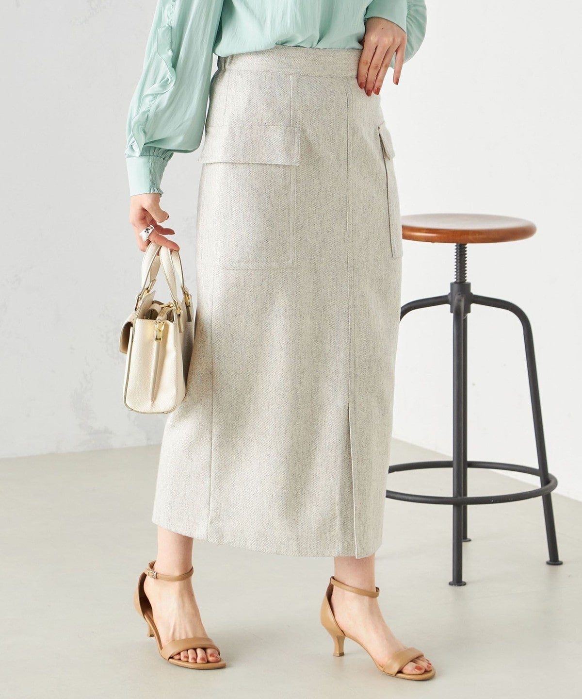フロントに入ったスリットが女性らしい抜け感を演出し、フラップ付きのアウトポケットがポイントの今シーズンらしいアイテムです。