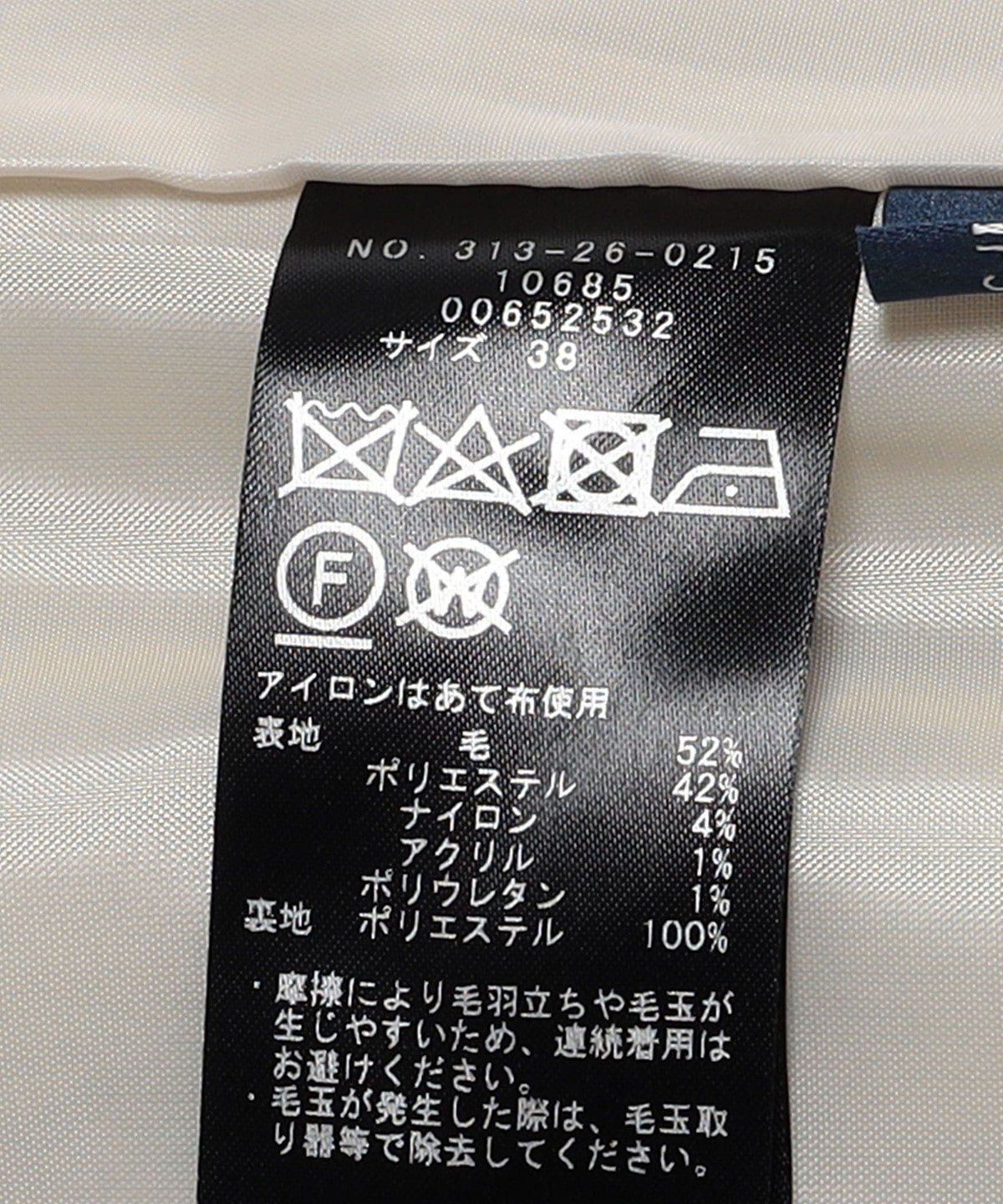 素材 表地 毛 52% ポリエステル 42% ナイロン 4% アクリル 1% ポリウレタン 1% 裏地 ポリエステル 100%