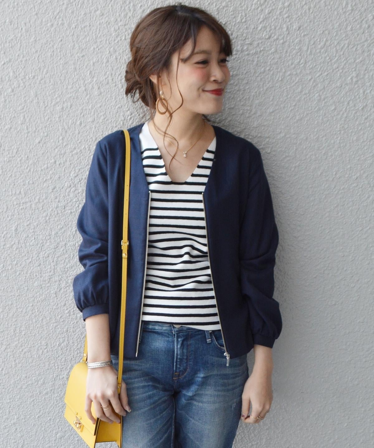 季節の変わりめに使い易い、薄手のブルゾンが登場。サラっとした素材感にVネックのデザインがカジュアル過ぎず、落ち着いた印象に。