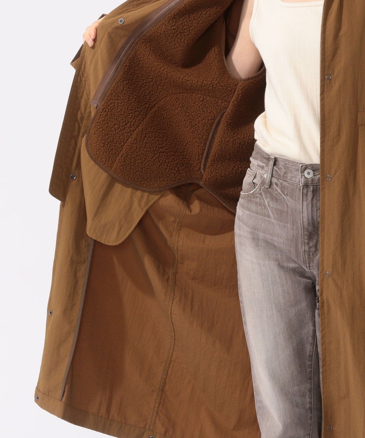 ベスト型のボアライナー付きのフードロングコート。