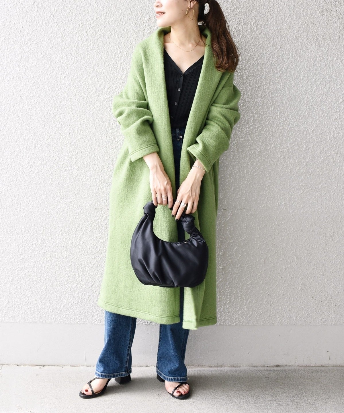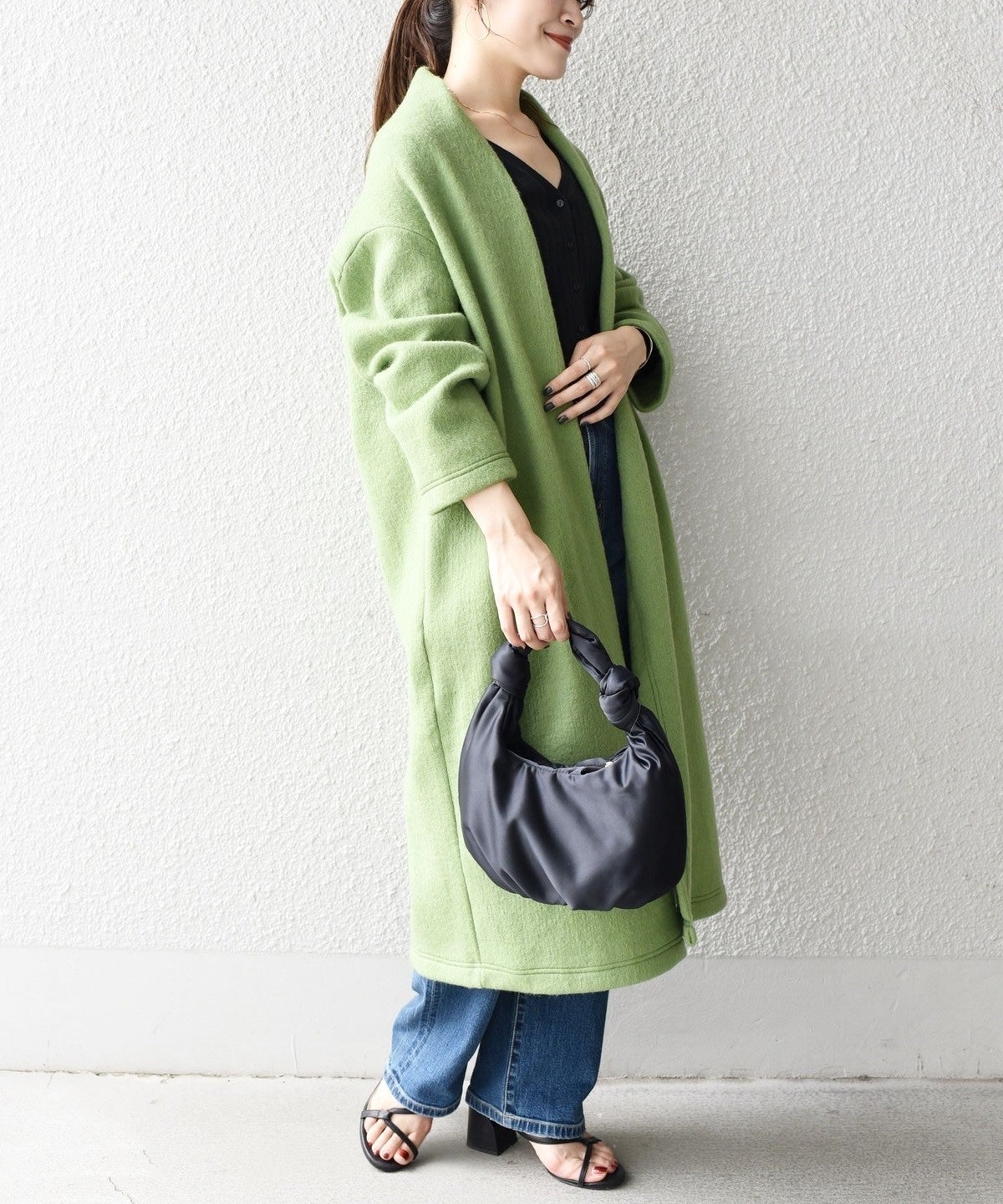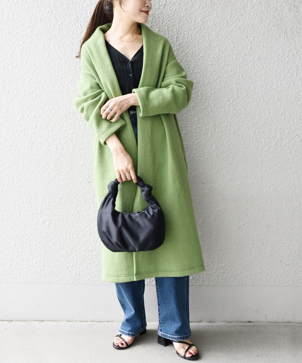 また、襟部分も着流しのデザインのためインナーはVネック、クルーネック、タートルネックなどネックの形も選びません。