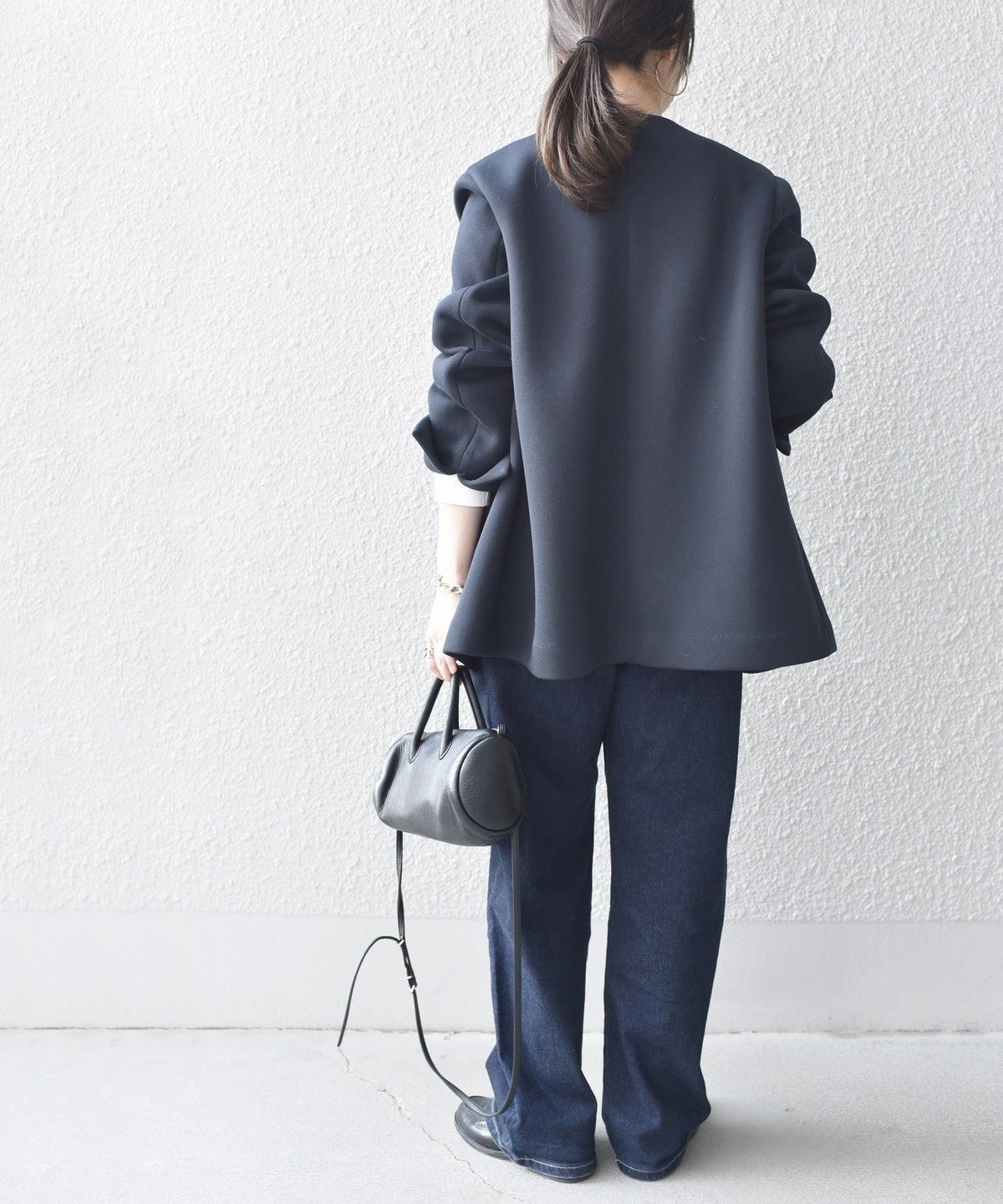 ・女性らしいシルエットとデザインなのでデニムと合わせても大人カジュアルな印象に。