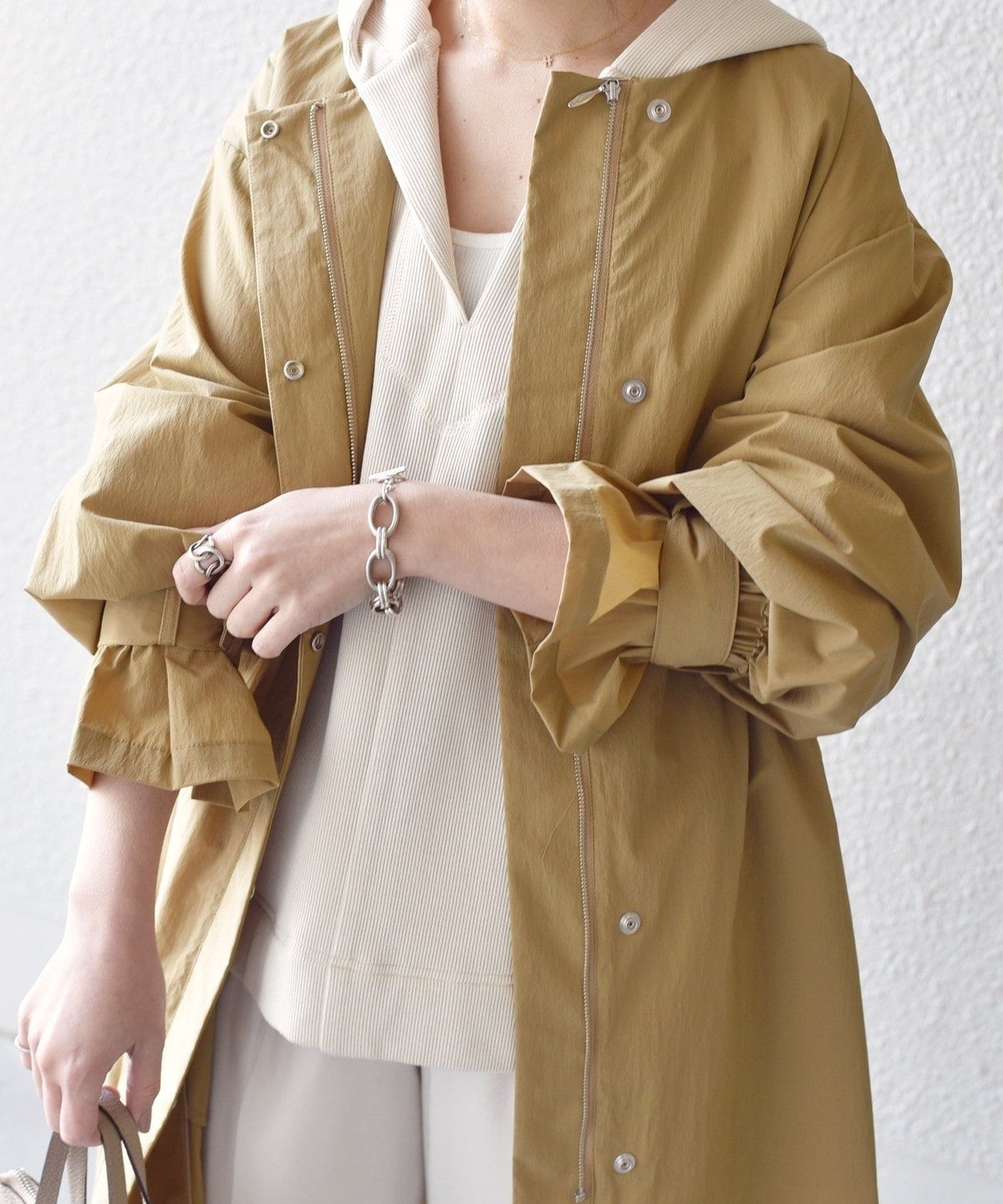 首回りがコンパクトなので、ストールを巻いたりフード付きのアイテムとの組み合わせもしやすく、幅広いスタイリングが楽しめます。