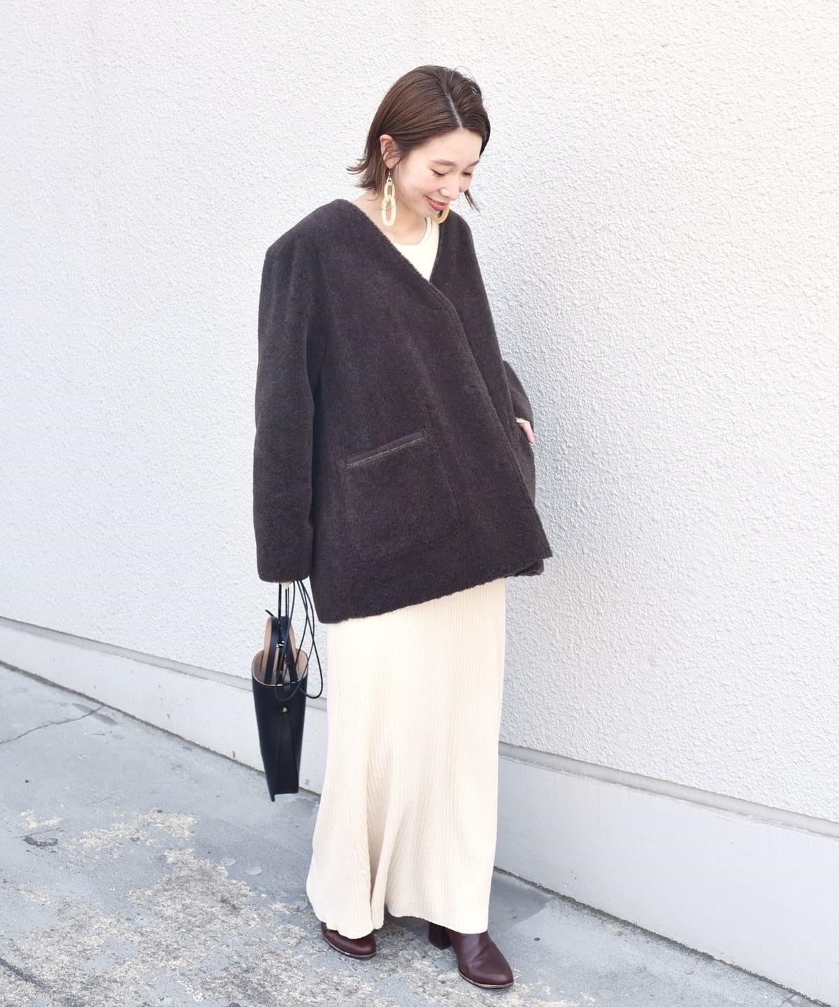 コメント:ヒップが隠れるくらいの着丈で、ロングスカートなどともバランスとりやすいデザインです。