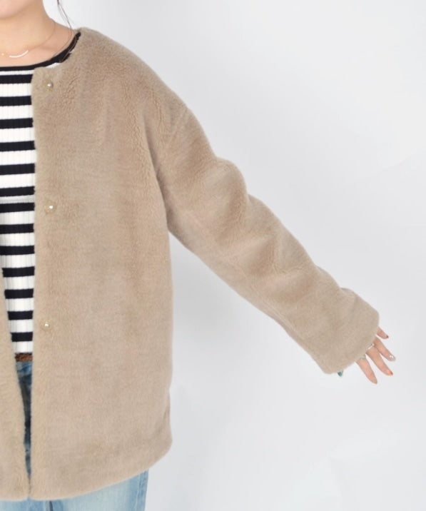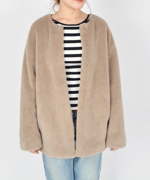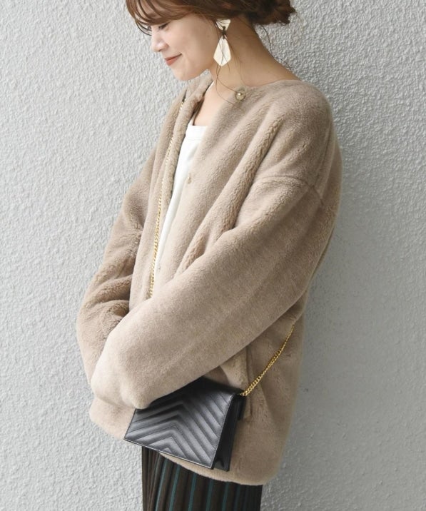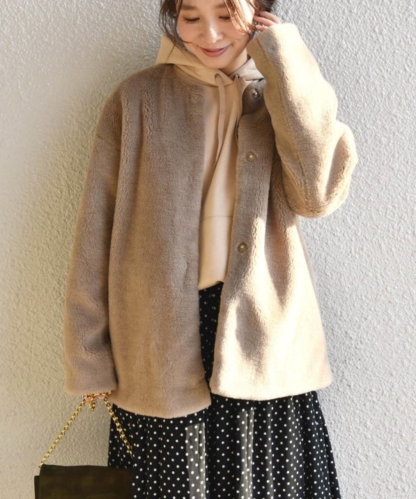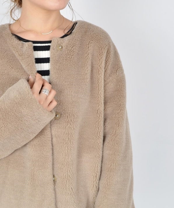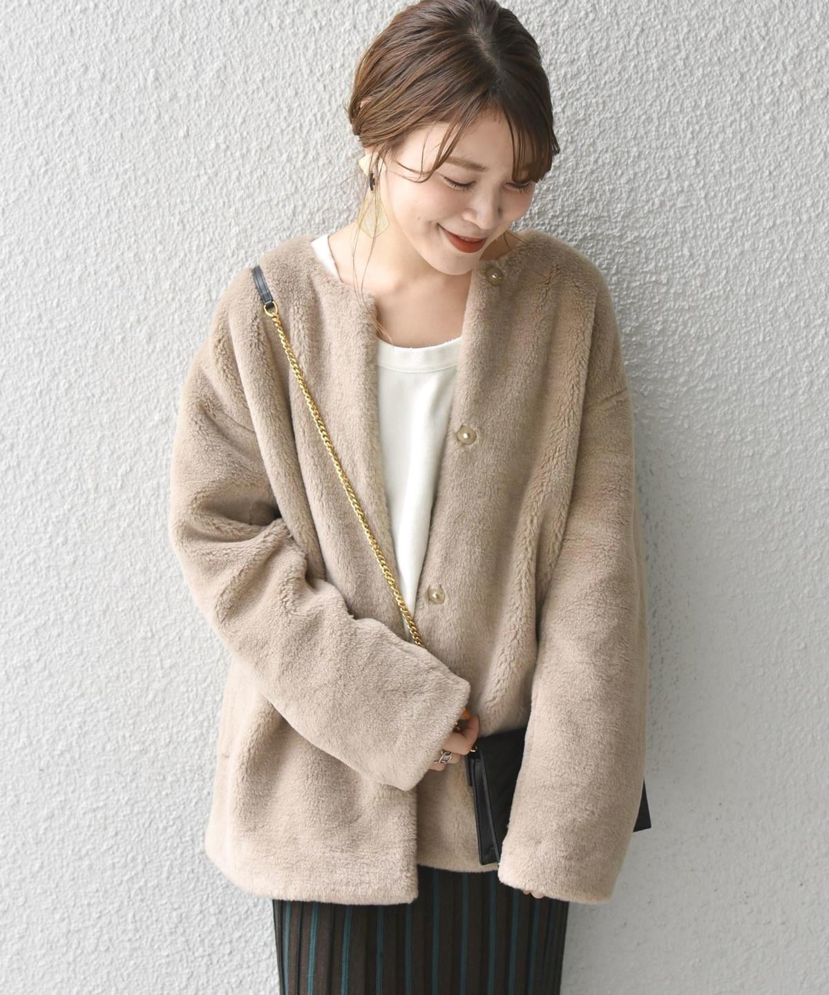 やわらかな風合いと温かみのあるボアコート。ノーカラーで仕上げた大人っぽく女性らしいアイテムです。マキシスカートやパンツなどバランスのとりやすい着丈となっています。