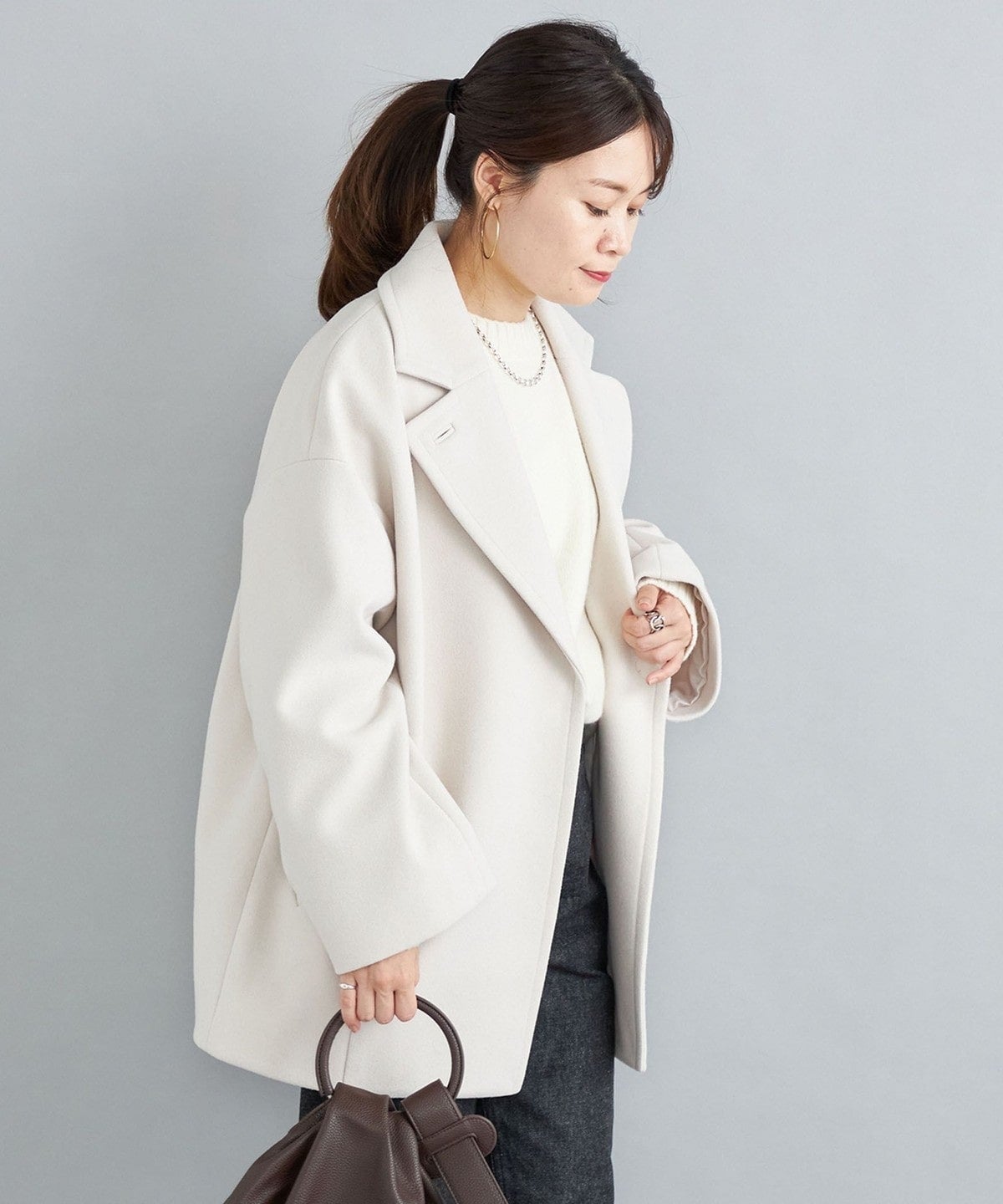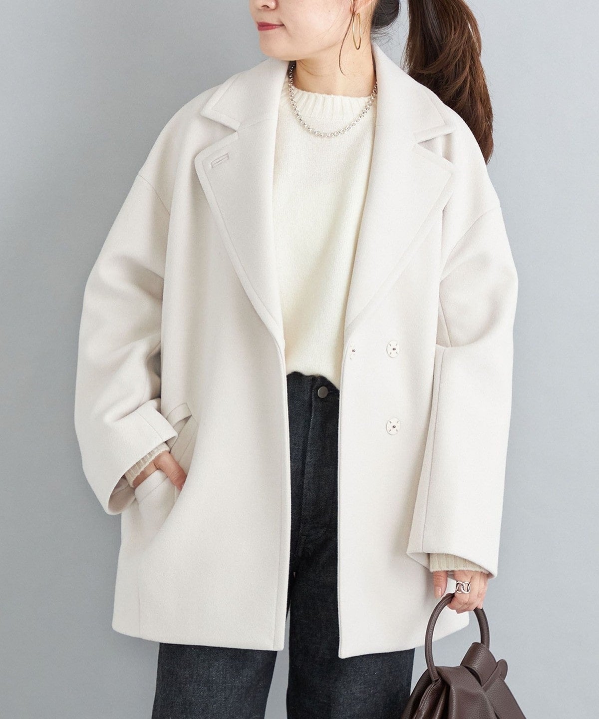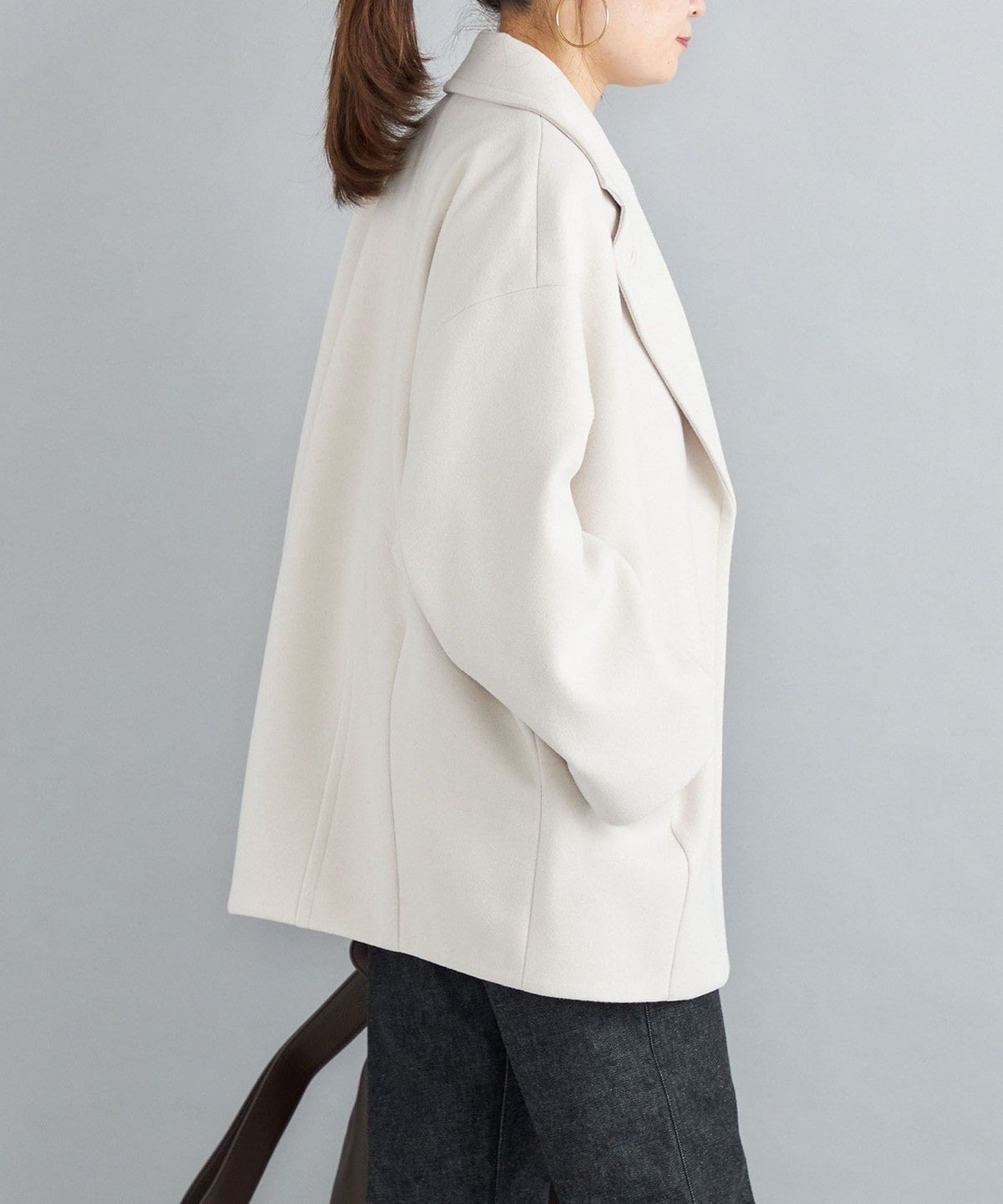 ゆるっとしたダブル開きのコクーンシルエットで女性らしいハーフ丈のコート。