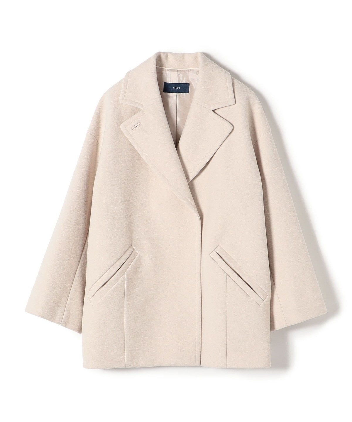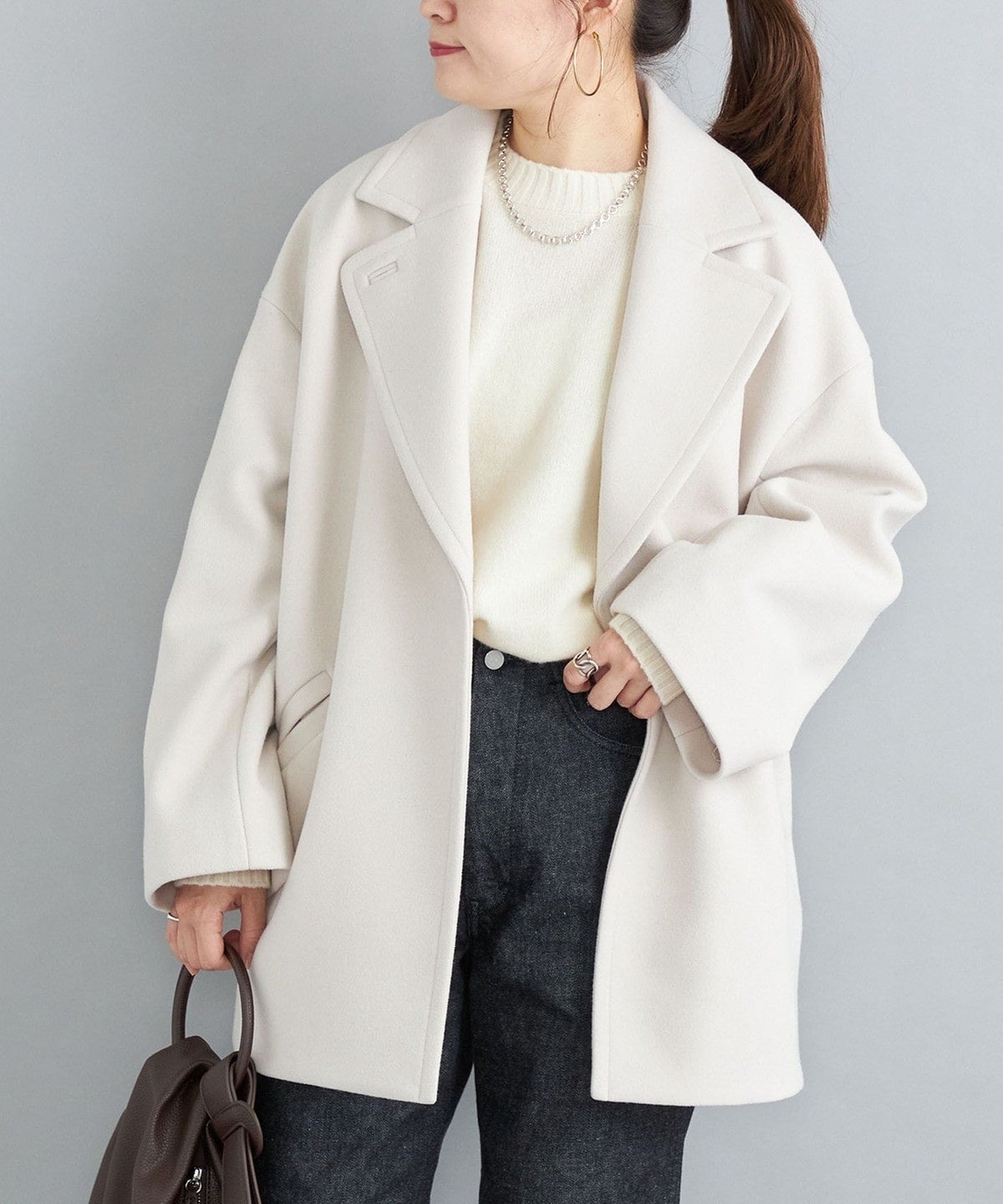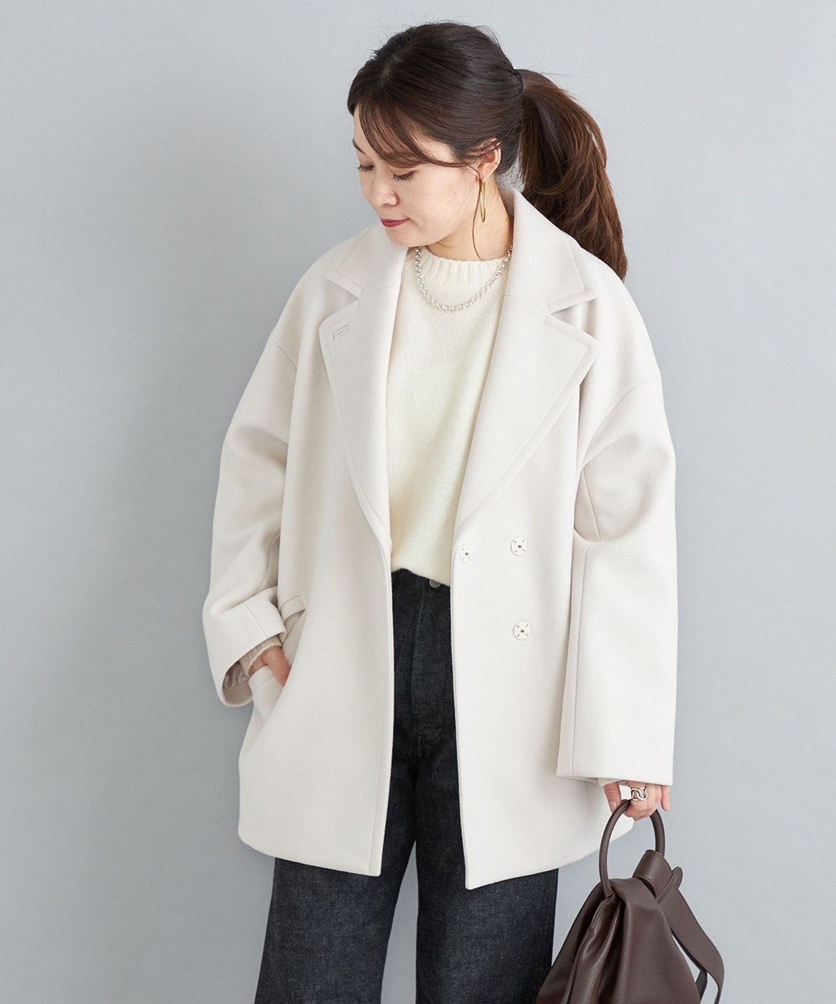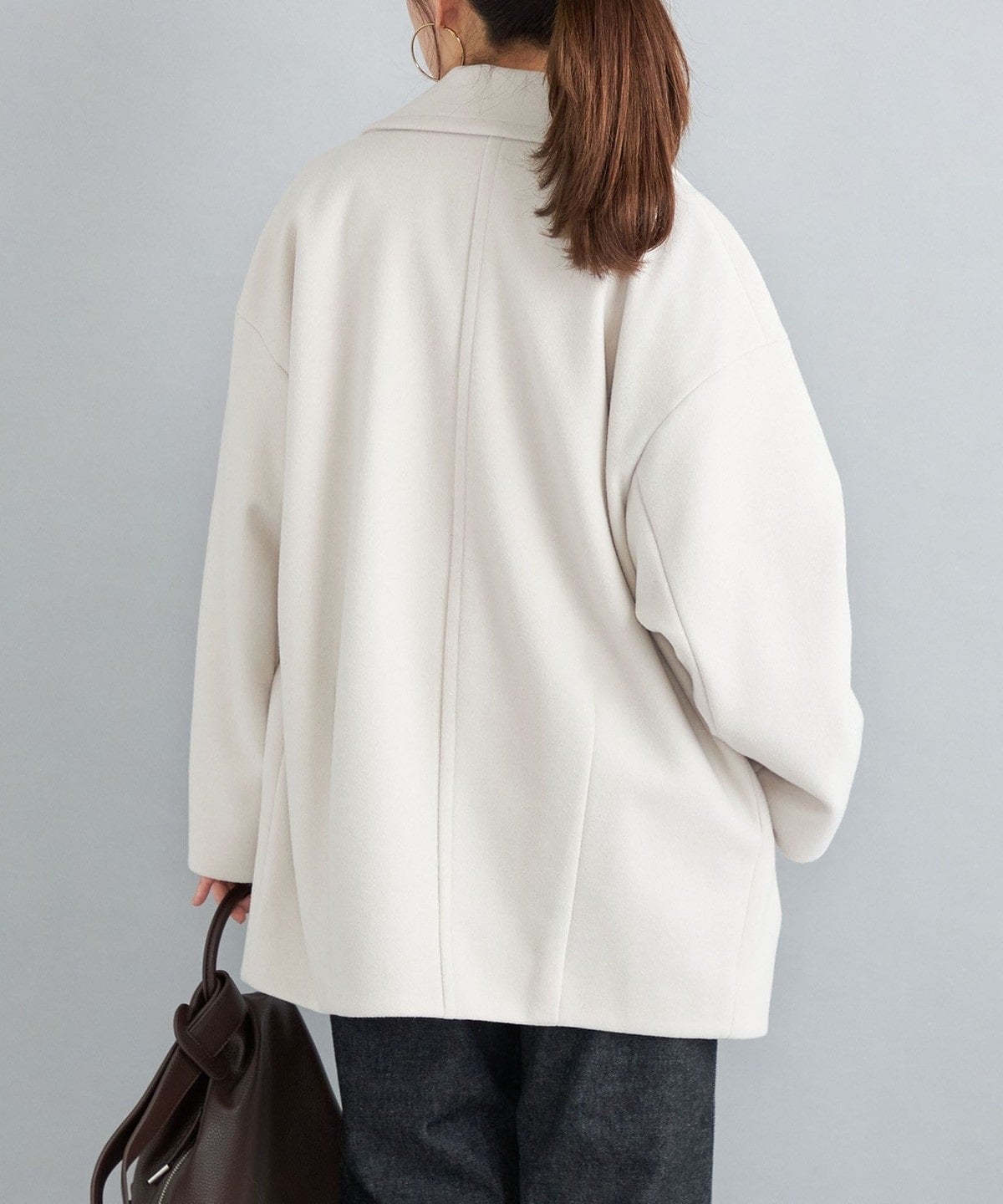 ゆるっとしたダブル開きのコクーンシルエットで女性らしいハーフ丈のコート。