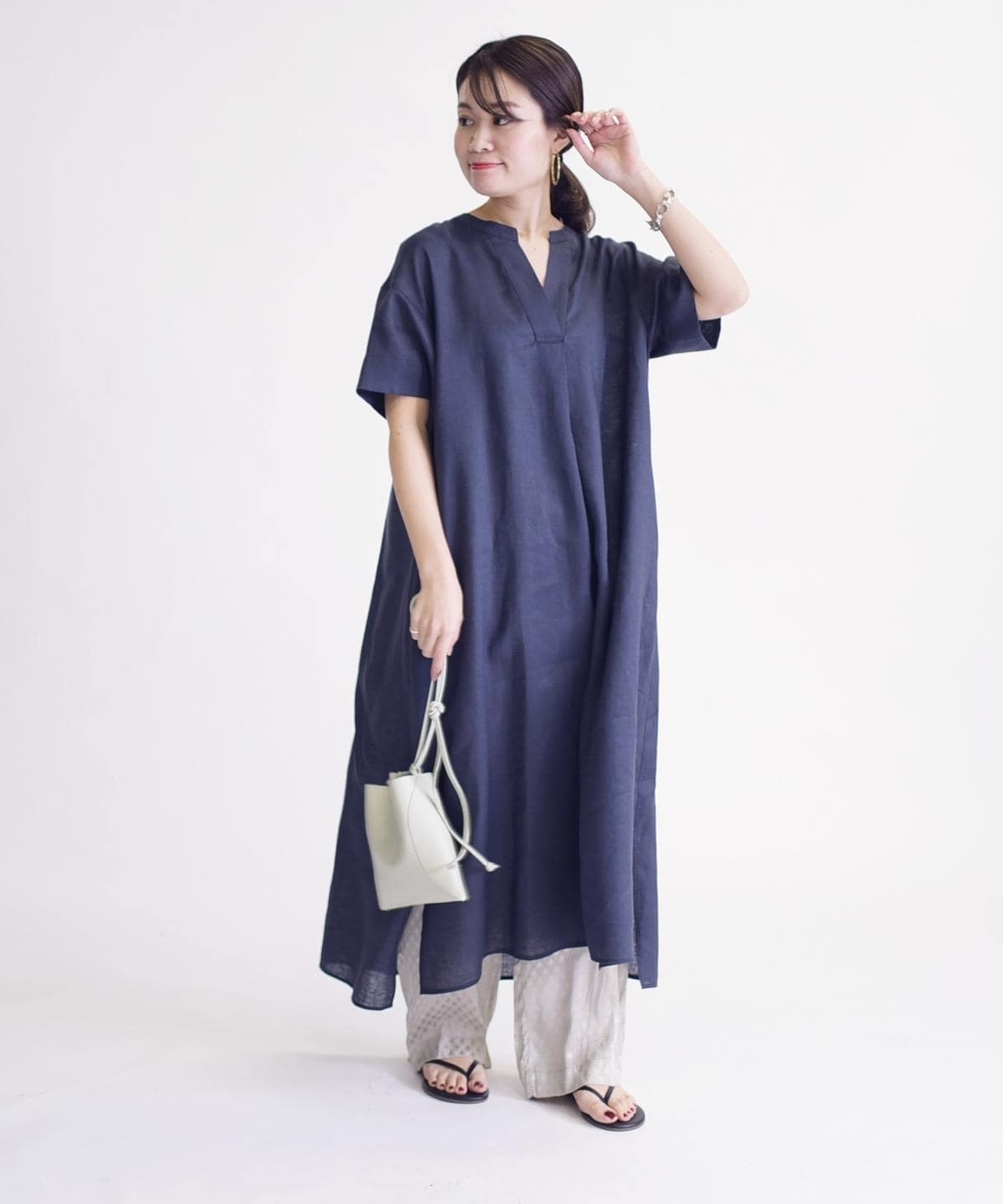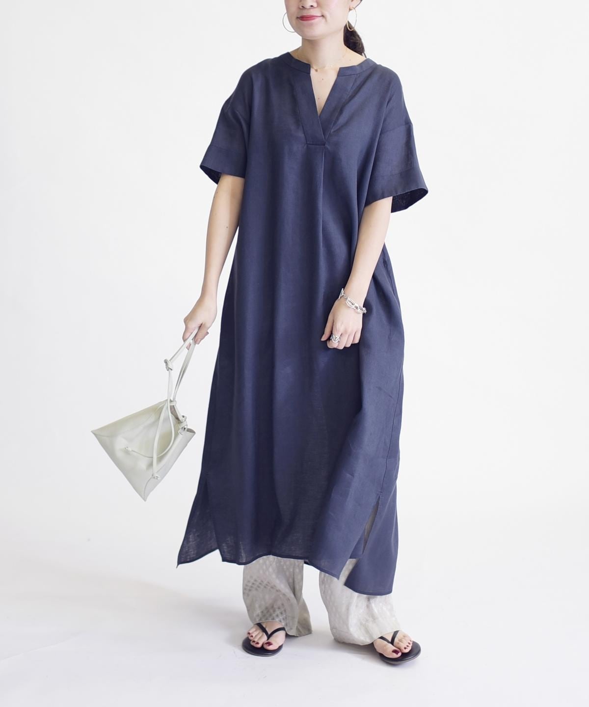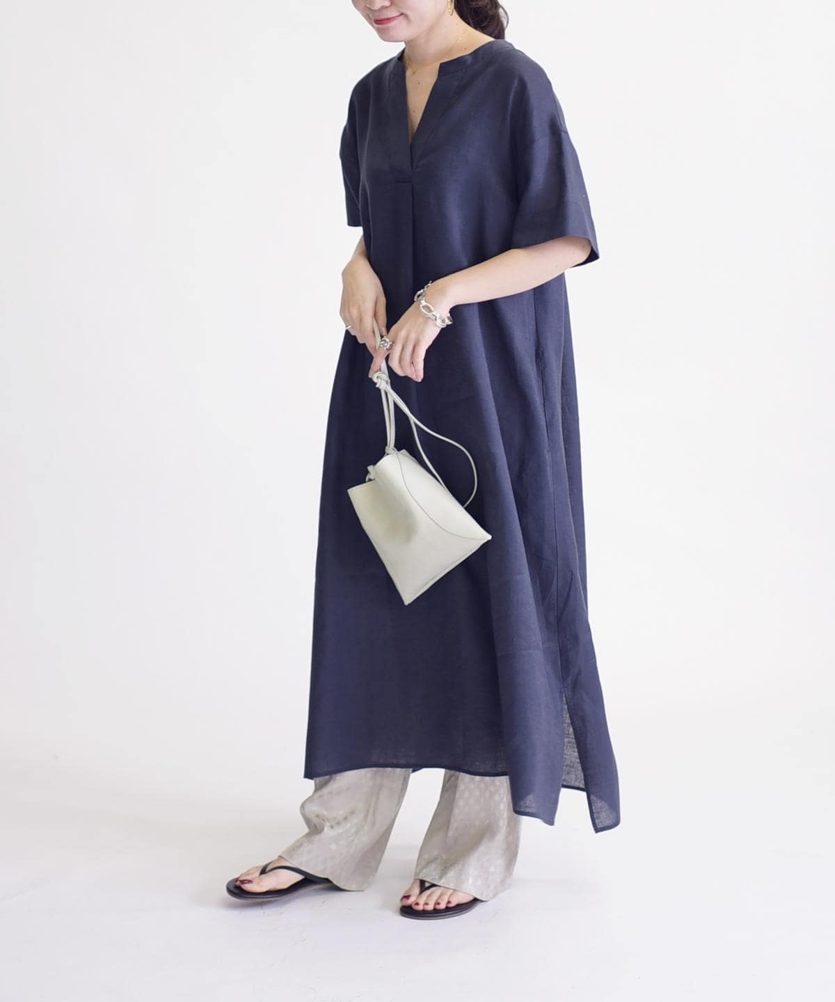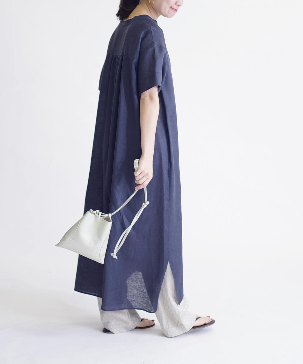 テレデランリネンを使用した涼やかなワンピース。トレーサビリティーのしっかりとしたフランス、ノルマンディー地方のリネンを仕様しています。ご家庭でお手入れができるので、デイリーにぴったりな一品◎