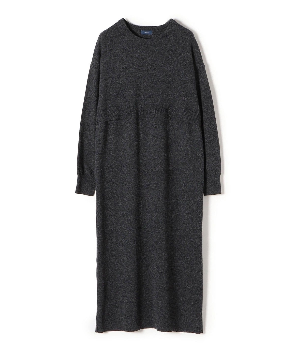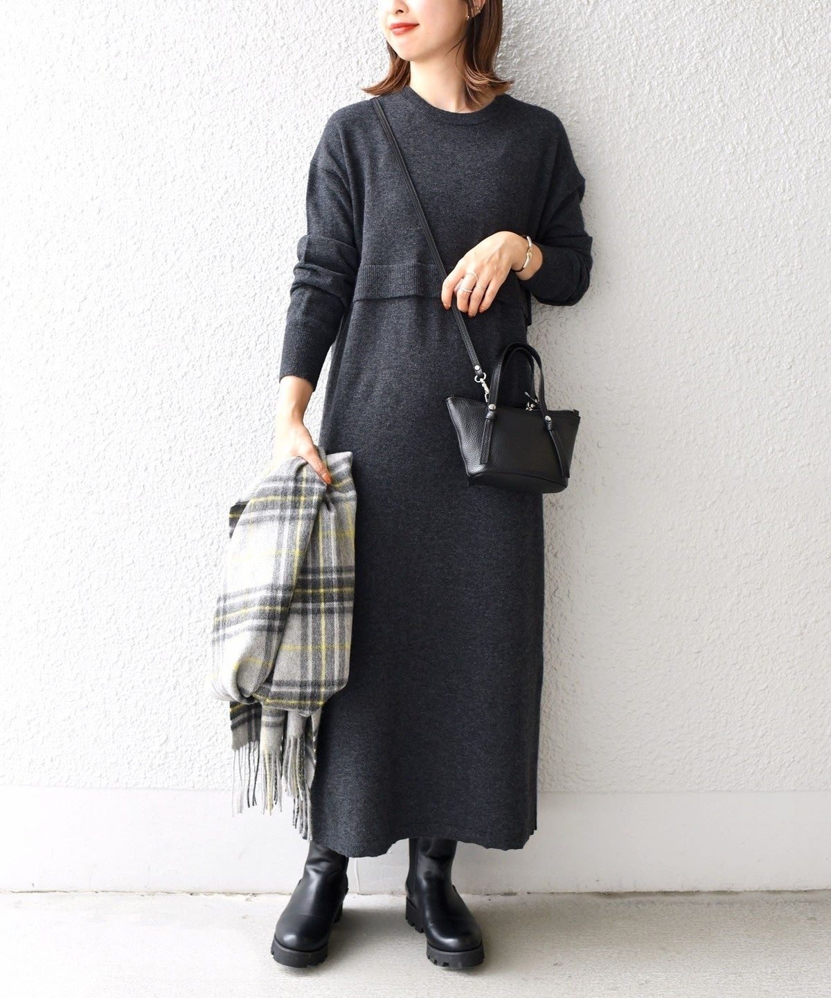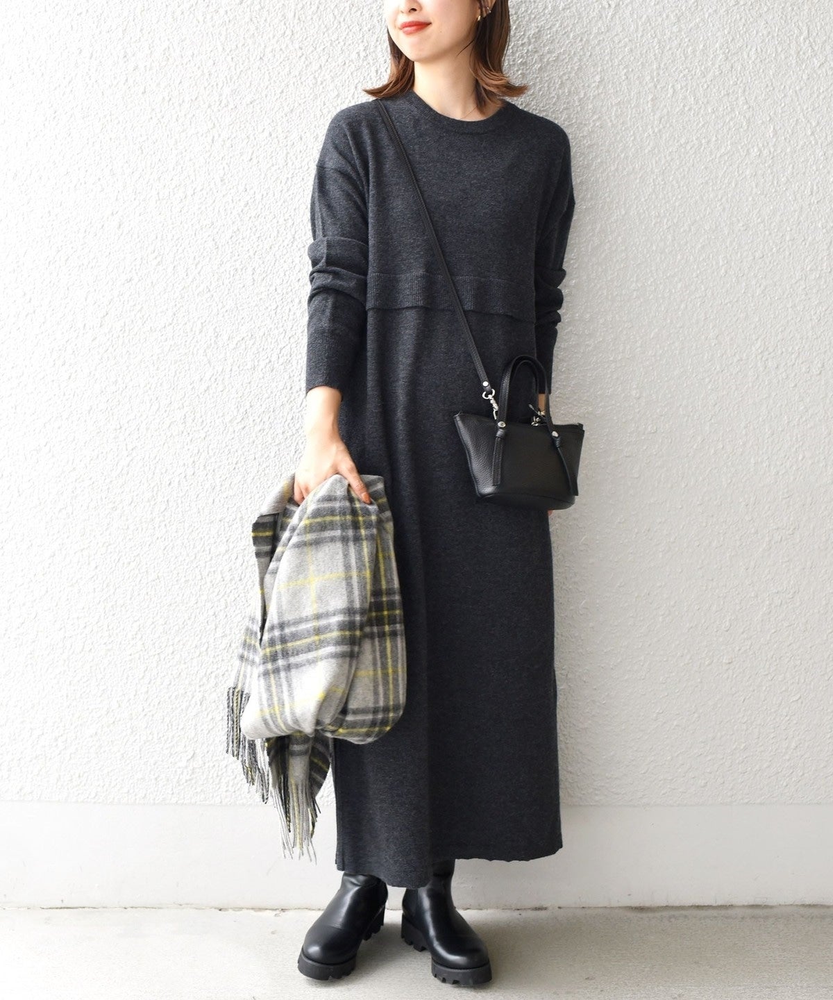 一枚でレイヤード感のでる、ケアフリーニットのワンピース。
