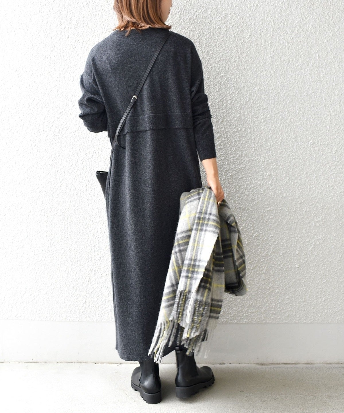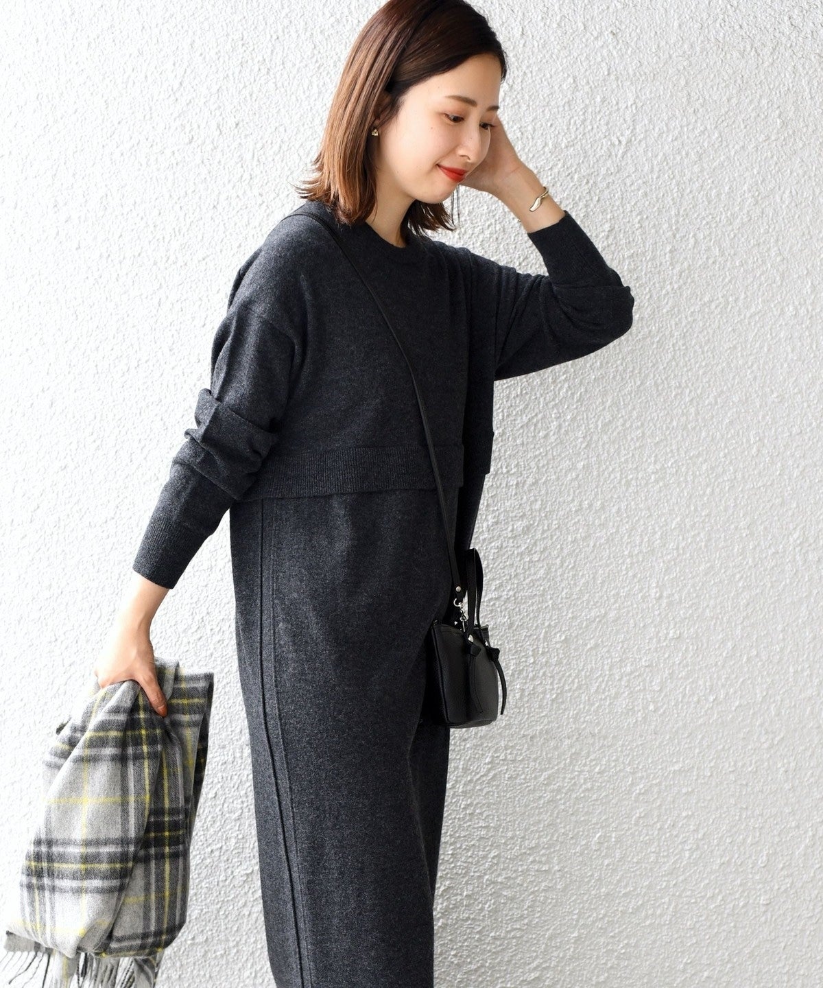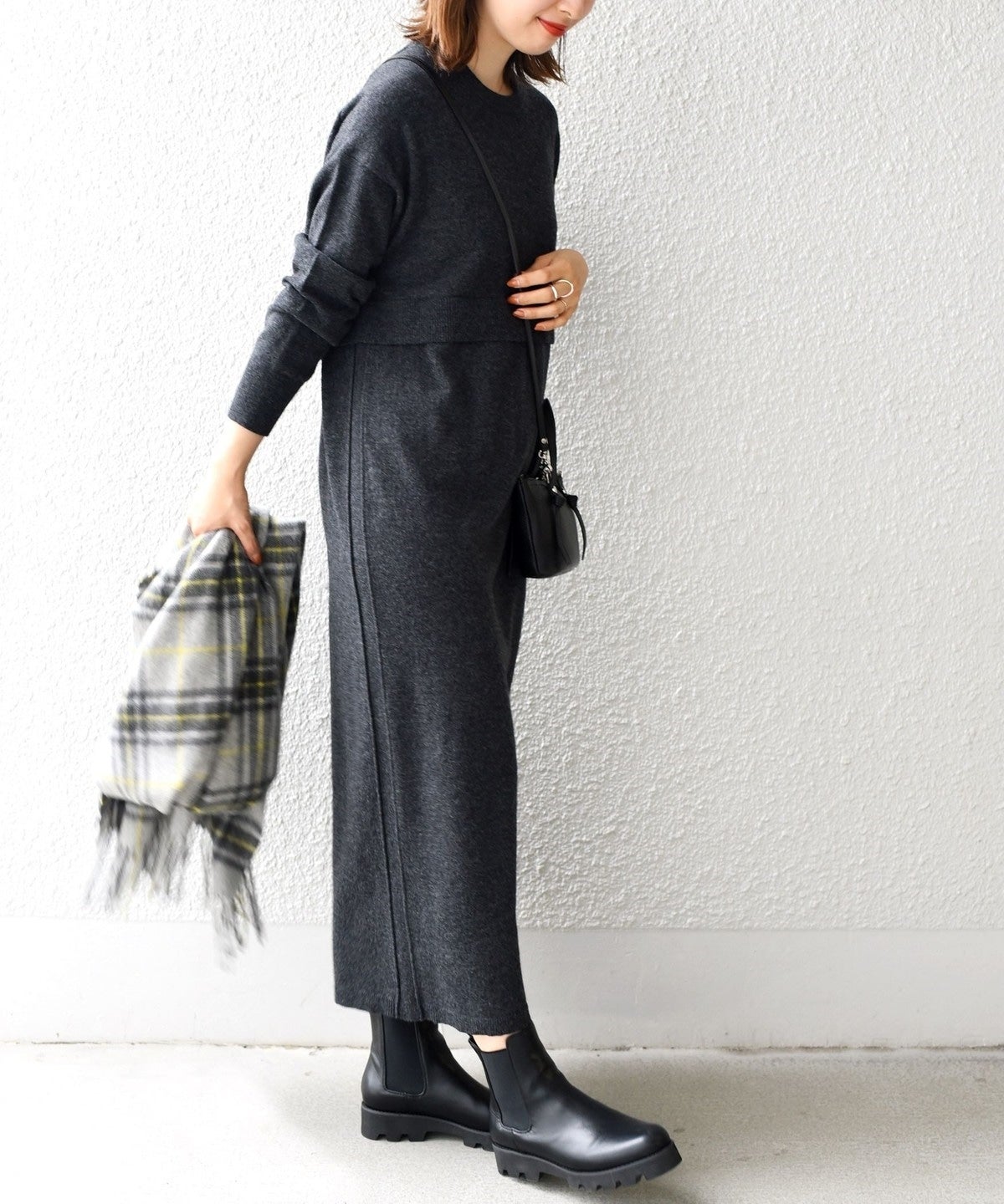 一枚でレイヤード感のでる、ケアフリーニットのワンピース。