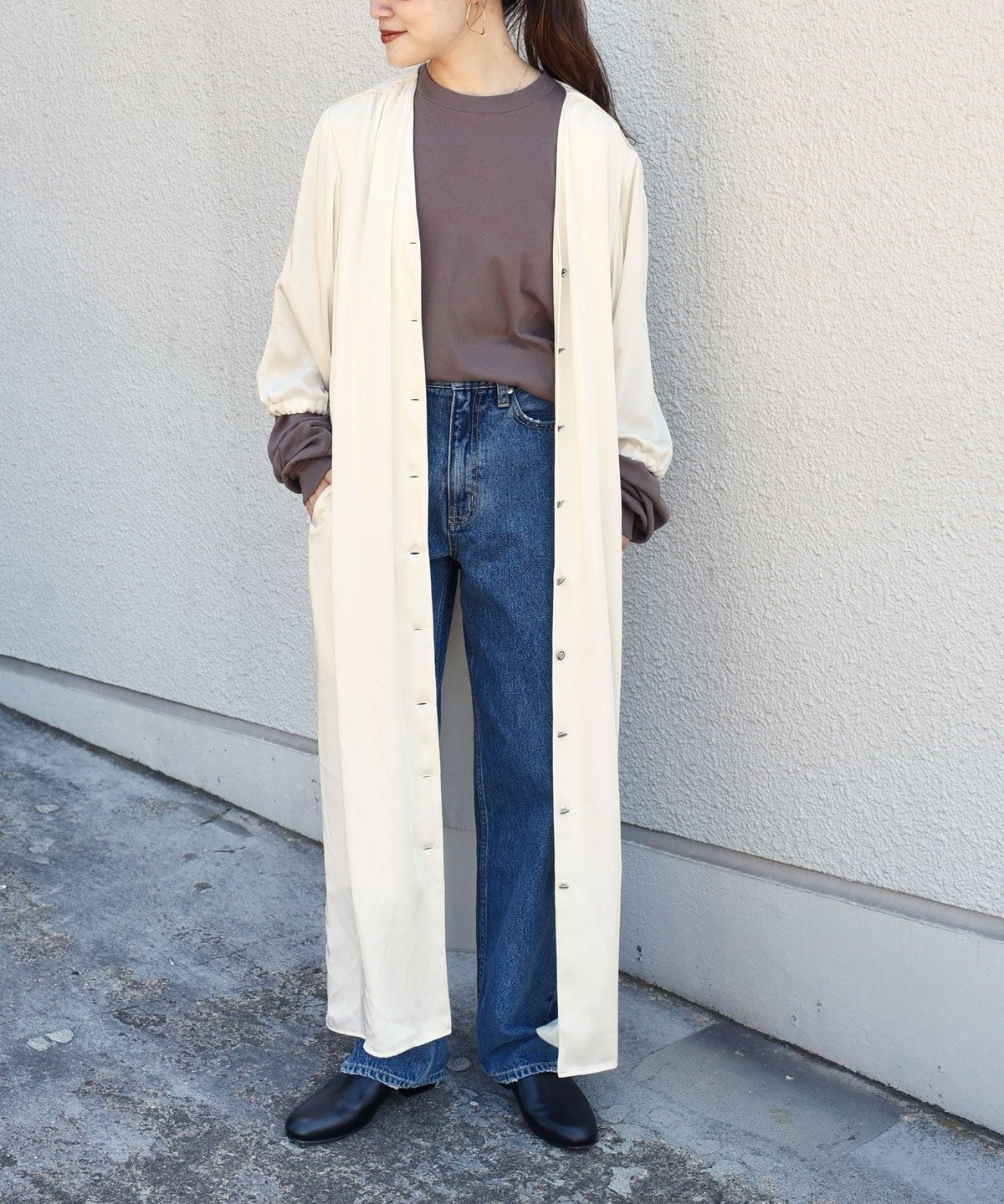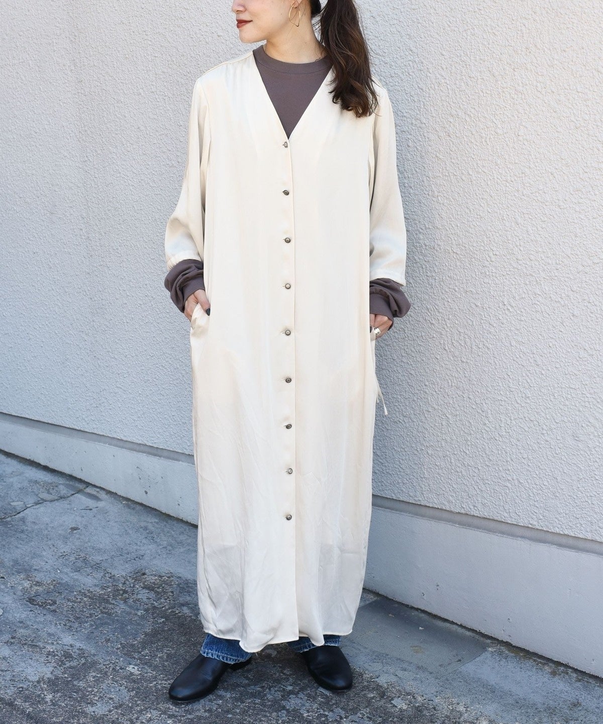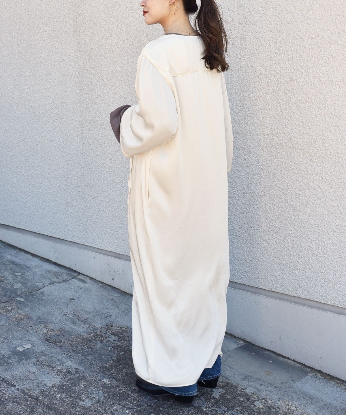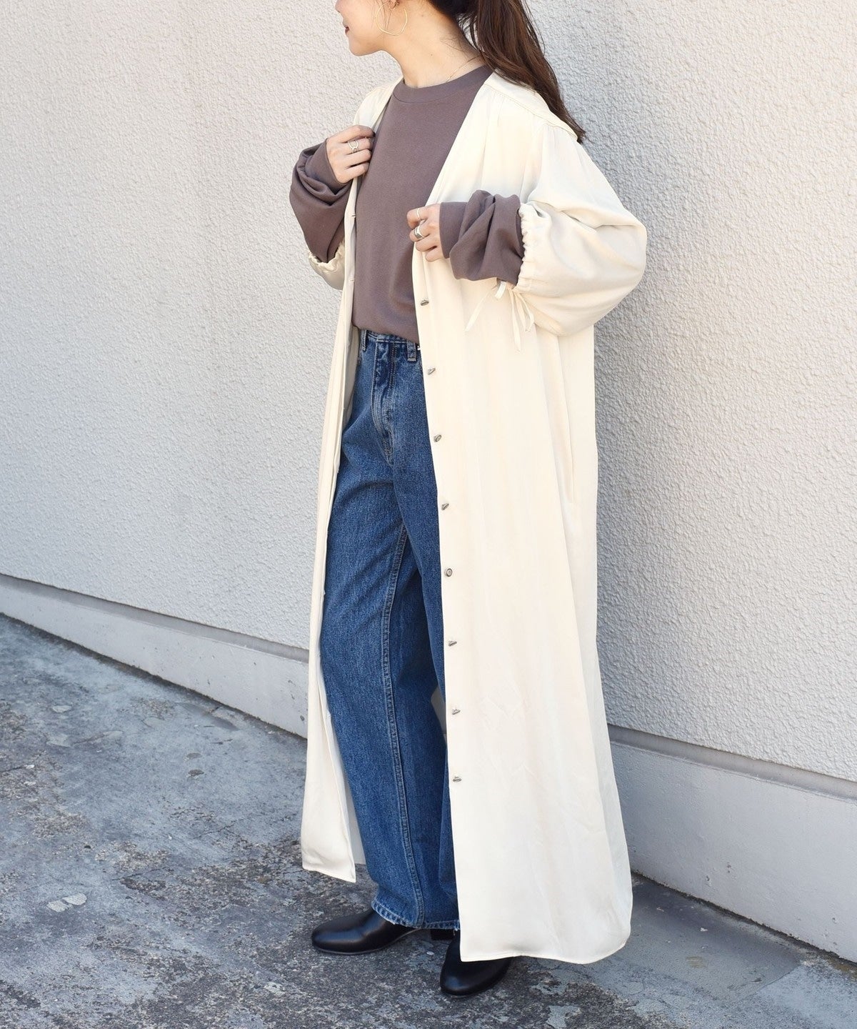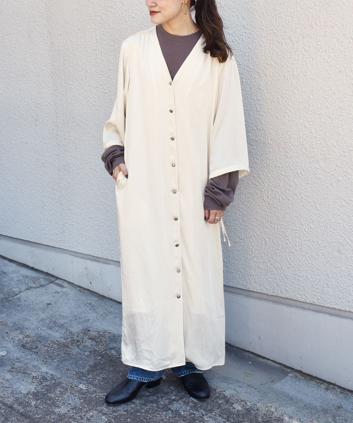 デニム同様に古着っぽいワンピースを作りました。シャツワンピースの様なシンプルデザインですが、絶妙丈のワイドスリーブやフロントの釦でカジュアルな着くずし感や遊びポイントを作りました。インナーにロンTを合わせて袖をわざと出したり、袖口を縛ってボリュームを作ったりと様々な着方が楽しめます。ボタンを開けて羽織としても着れるので秋冬〜春先まで着回せます。