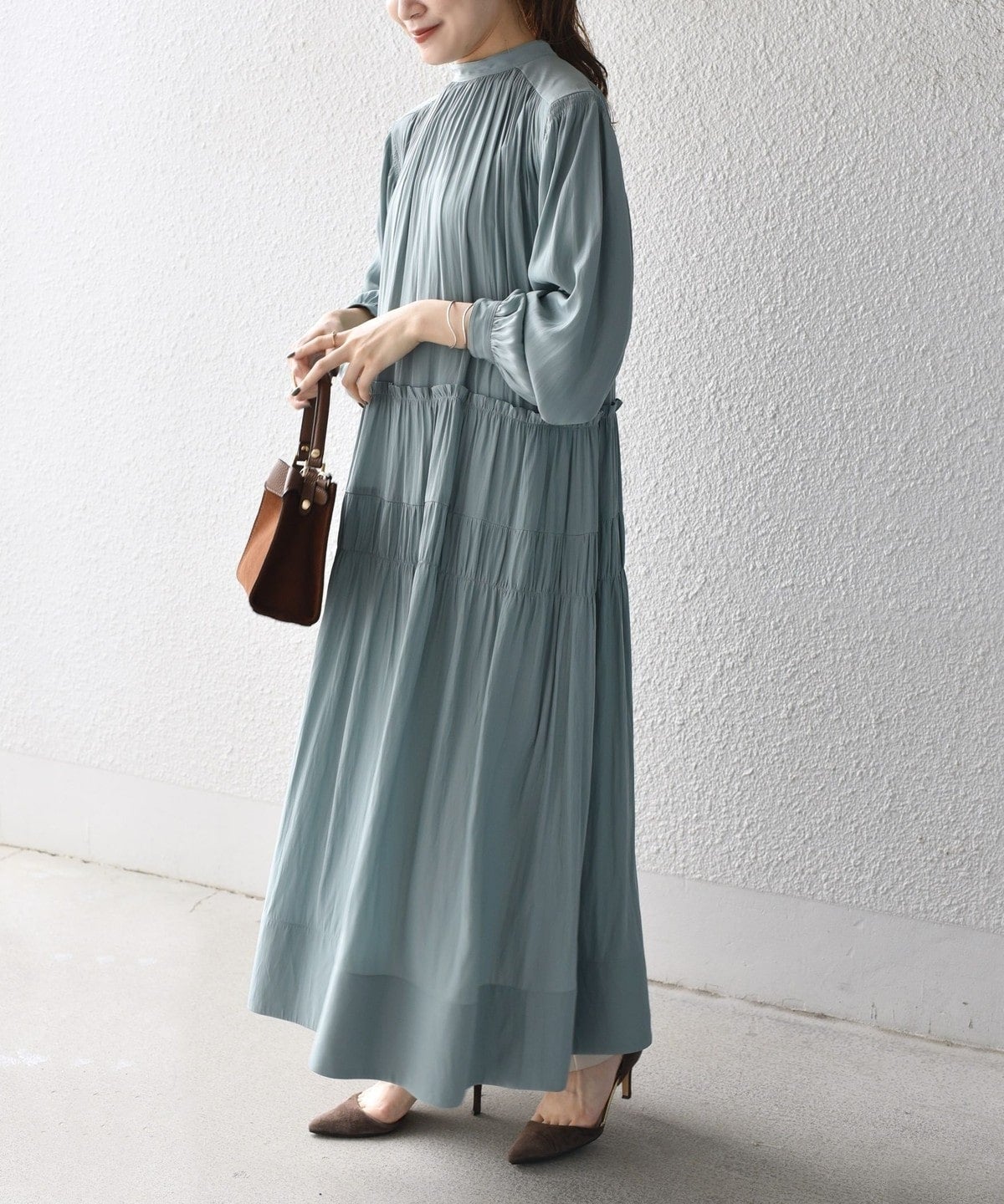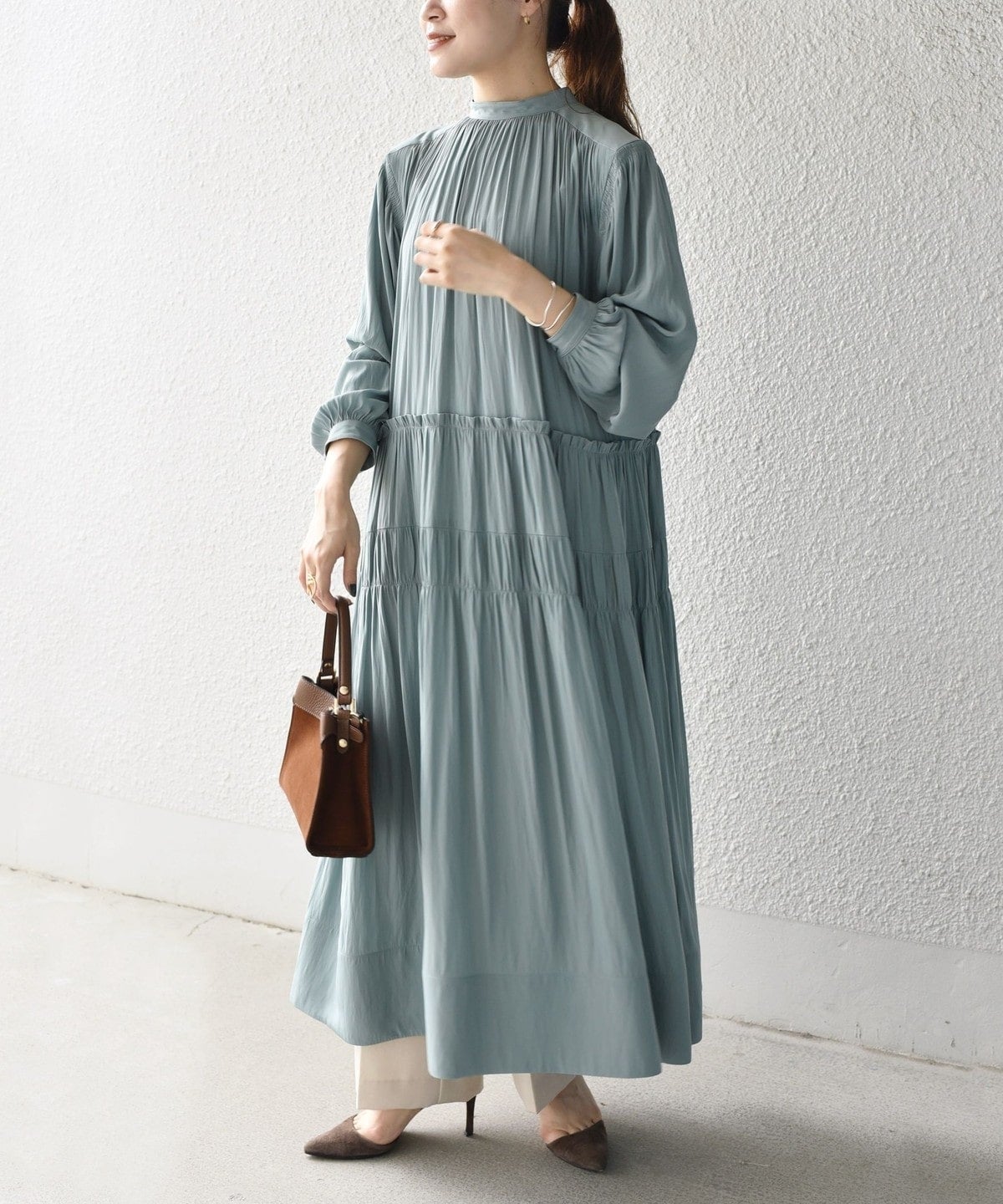 動くたびにしなやかに揺れるドレープが心地良い、大人女性におすすめのワンピースです。