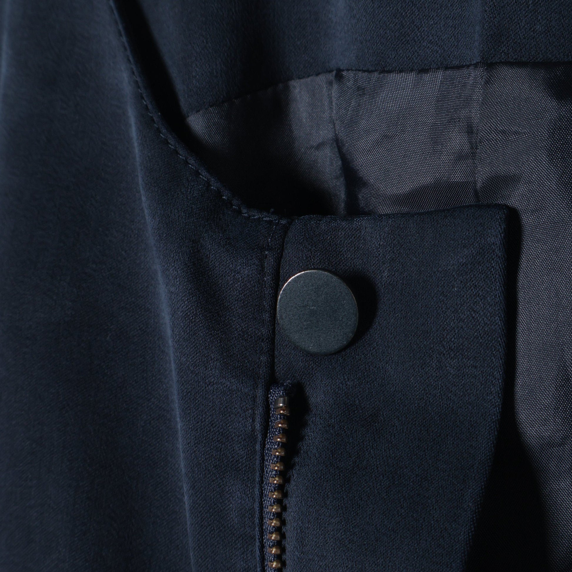 ミリタリーパラシュートパンツのディテールをそぎ落とし、サテン生地に落とし込みました。