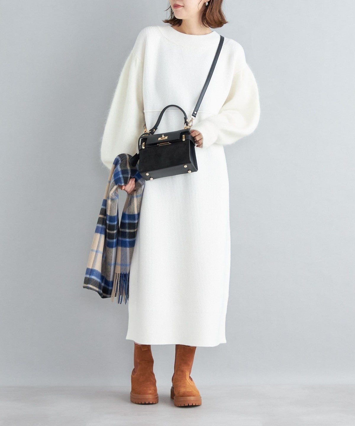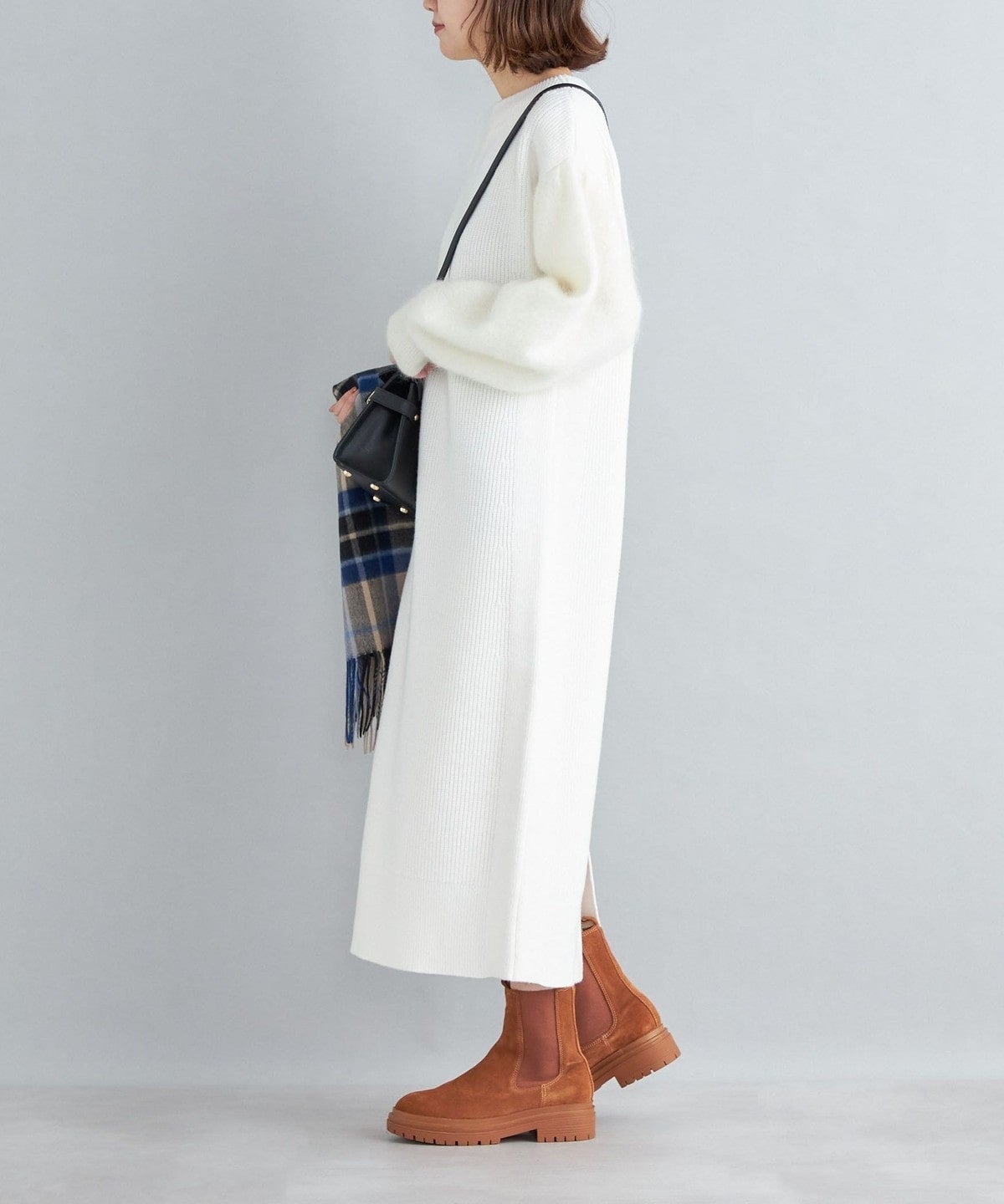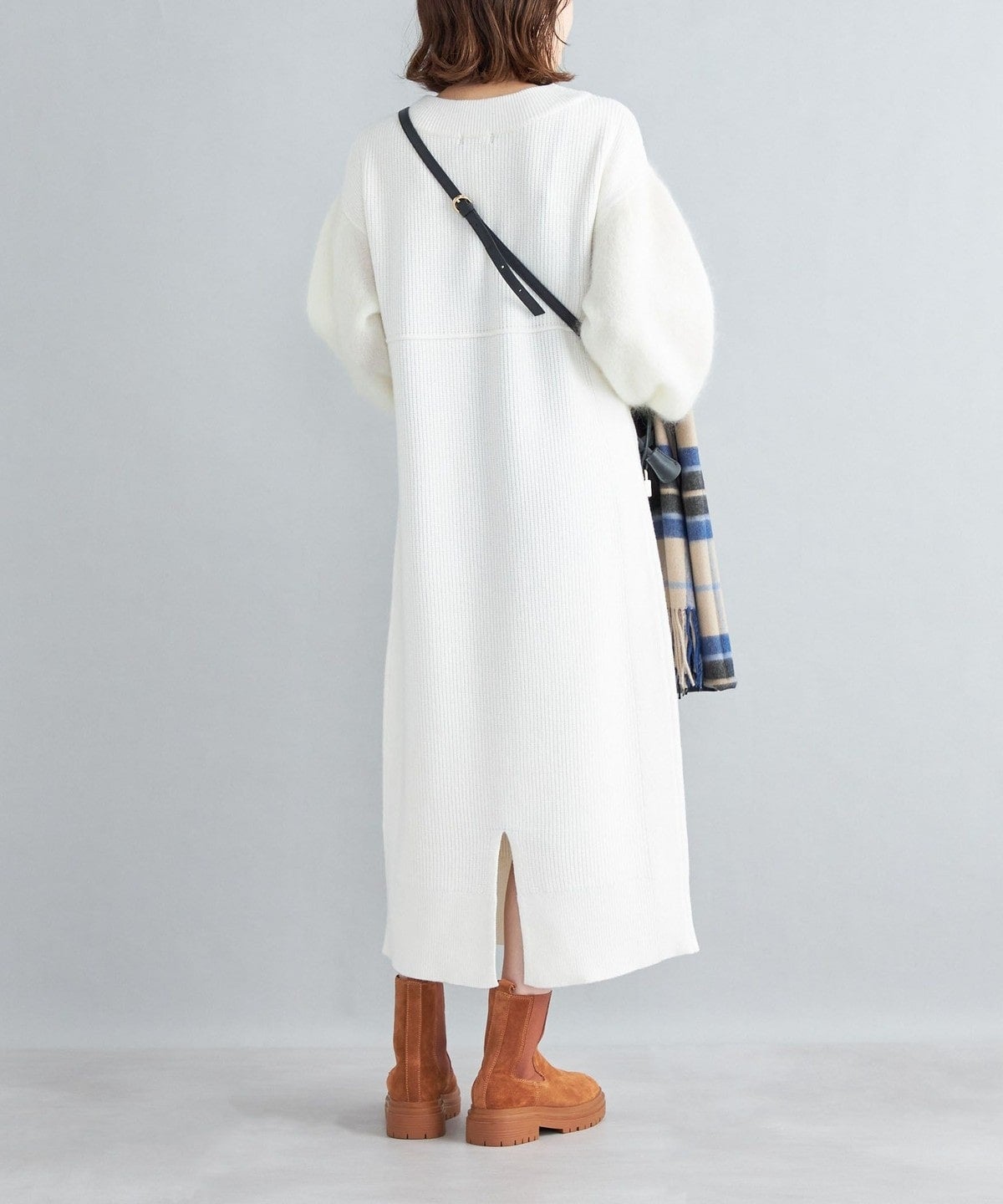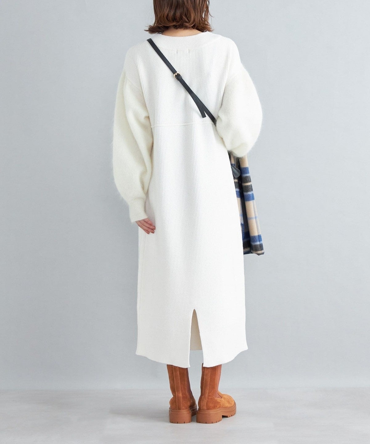 袖にヘアリーなモヘアをドッキングしたニットワンピース。