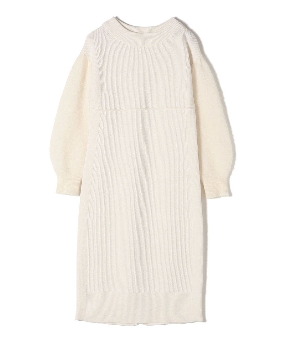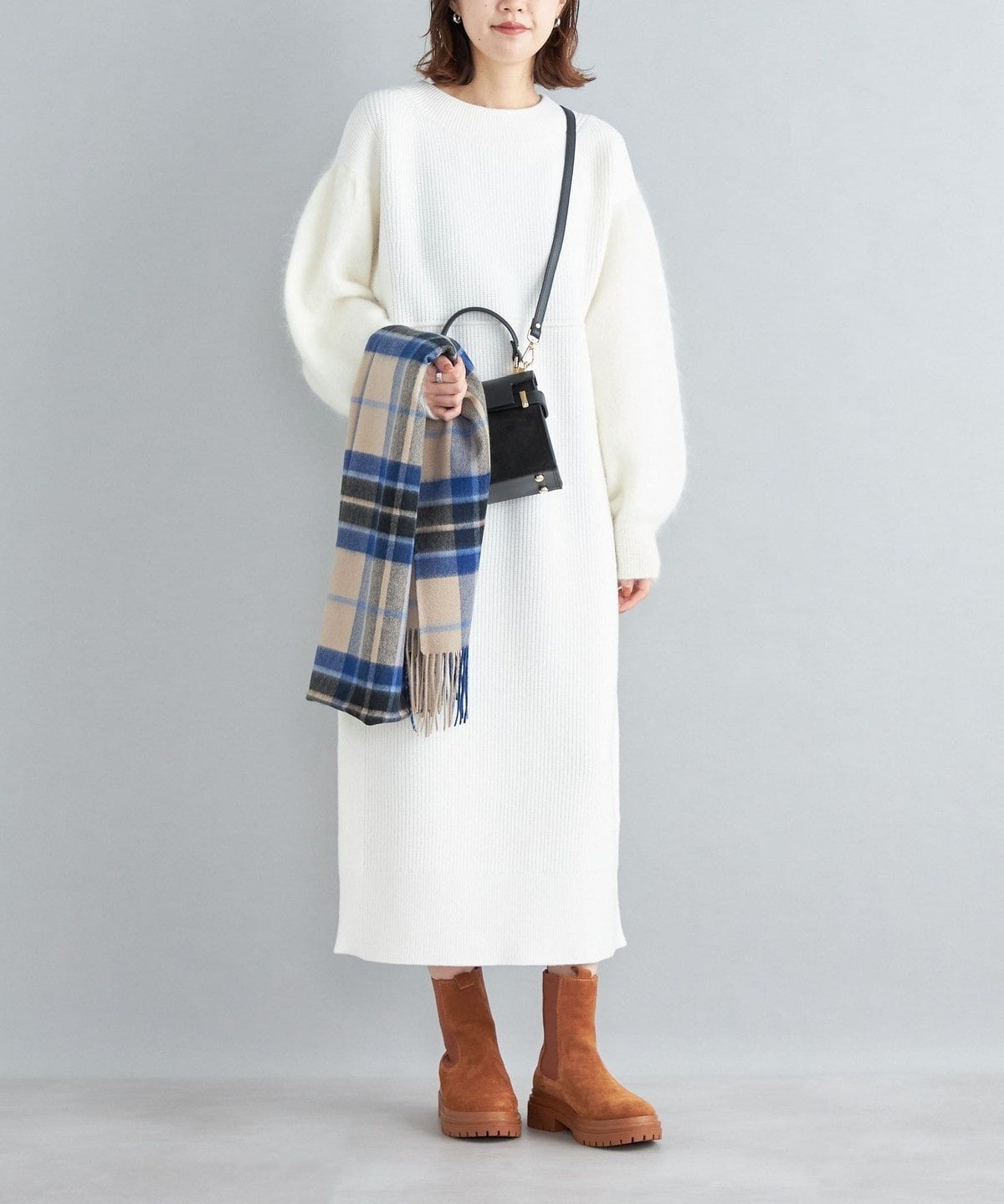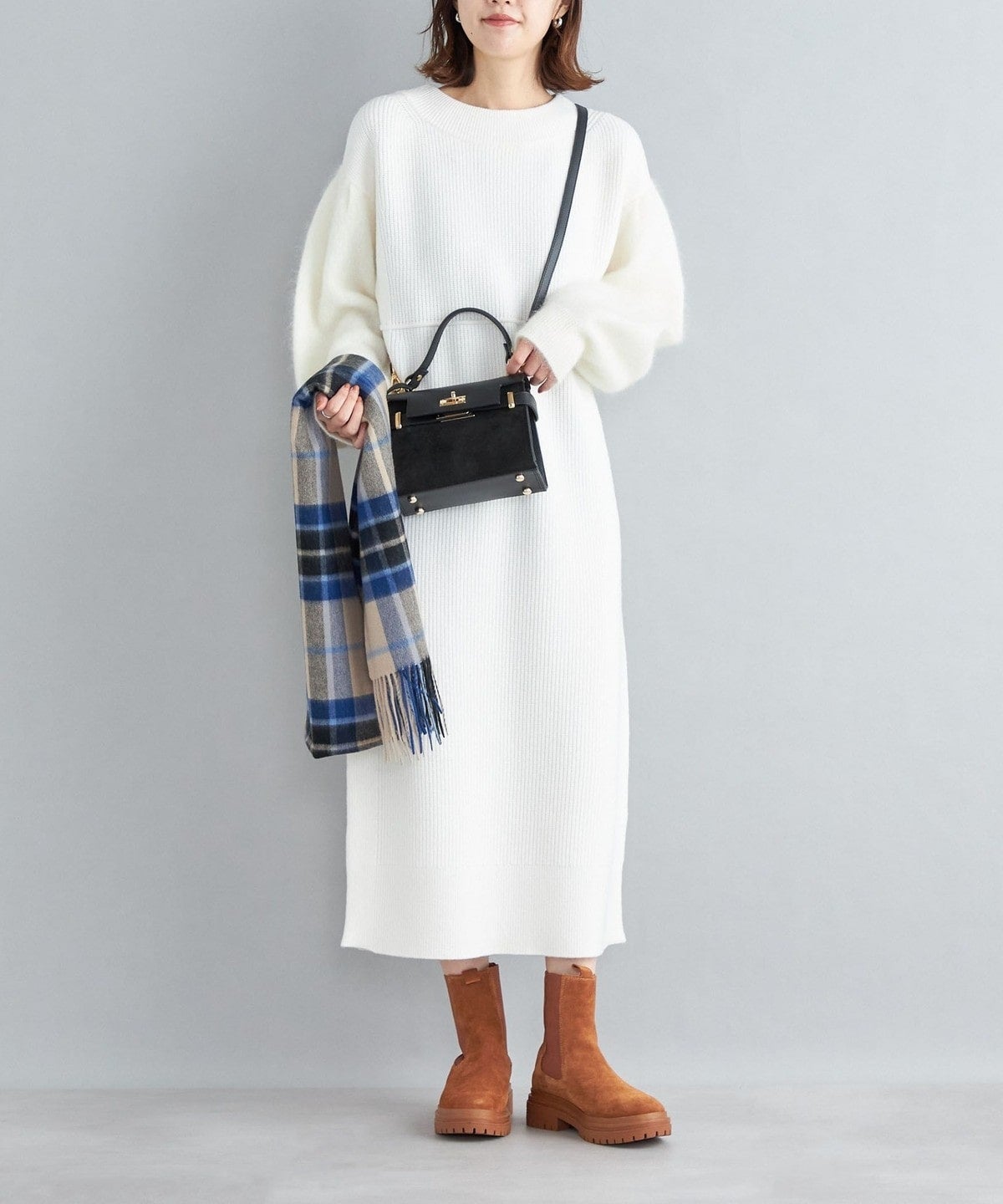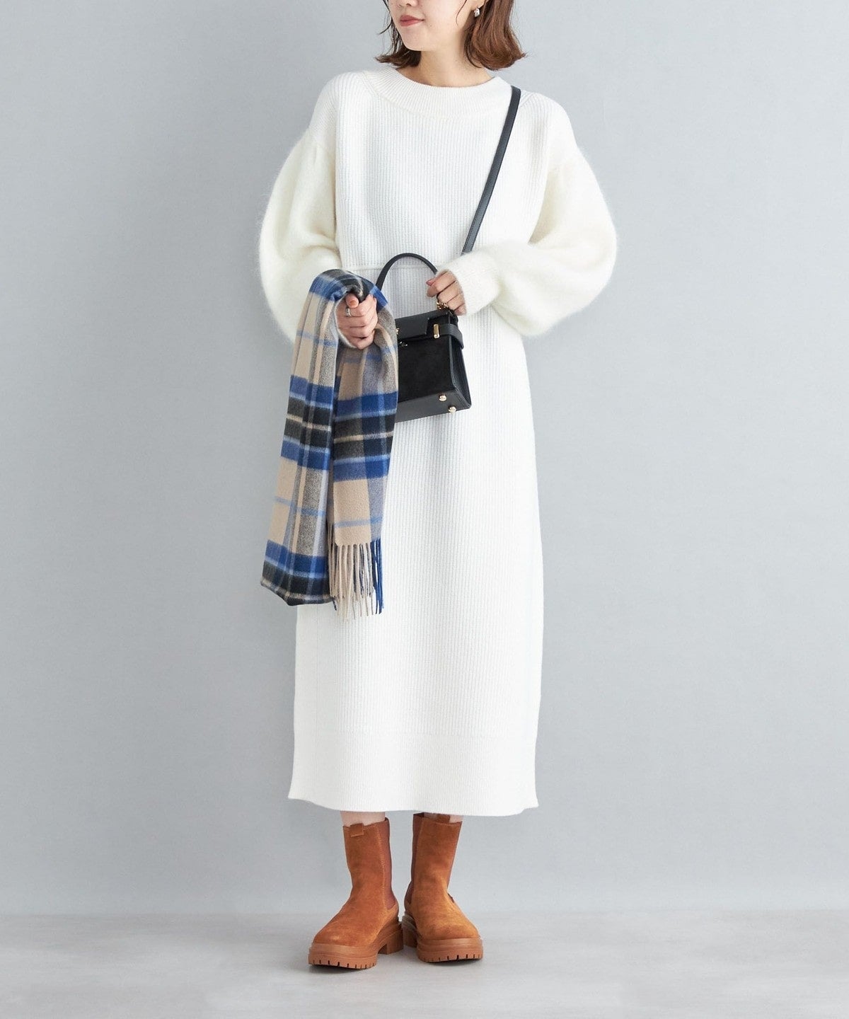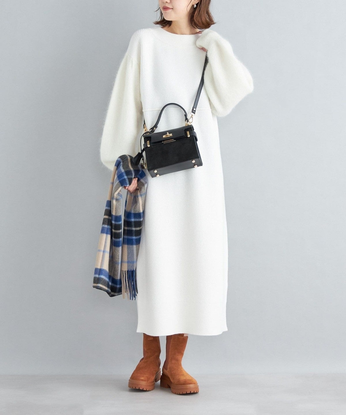 袖にヘアリーなモヘアをドッキングしたニットワンピース。