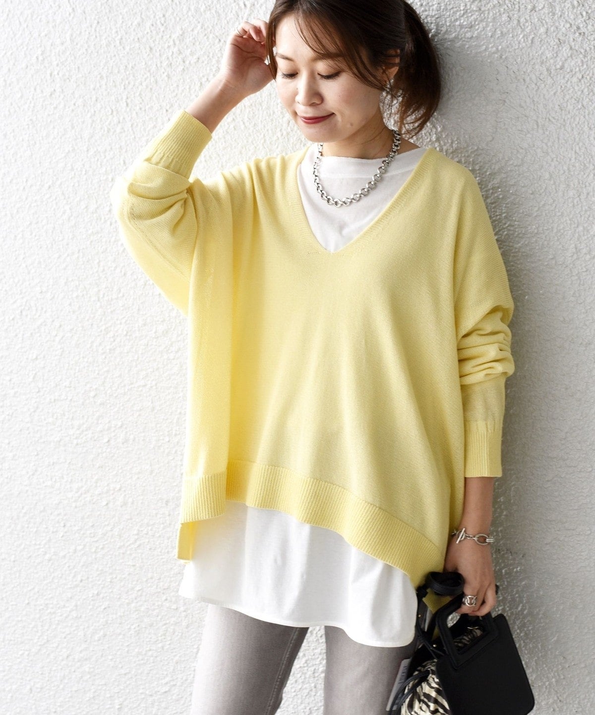 Tシャツなどのレイヤードスタイルが決まりやすい襟ぐりの開き、裾のデザイン、着丈感です。