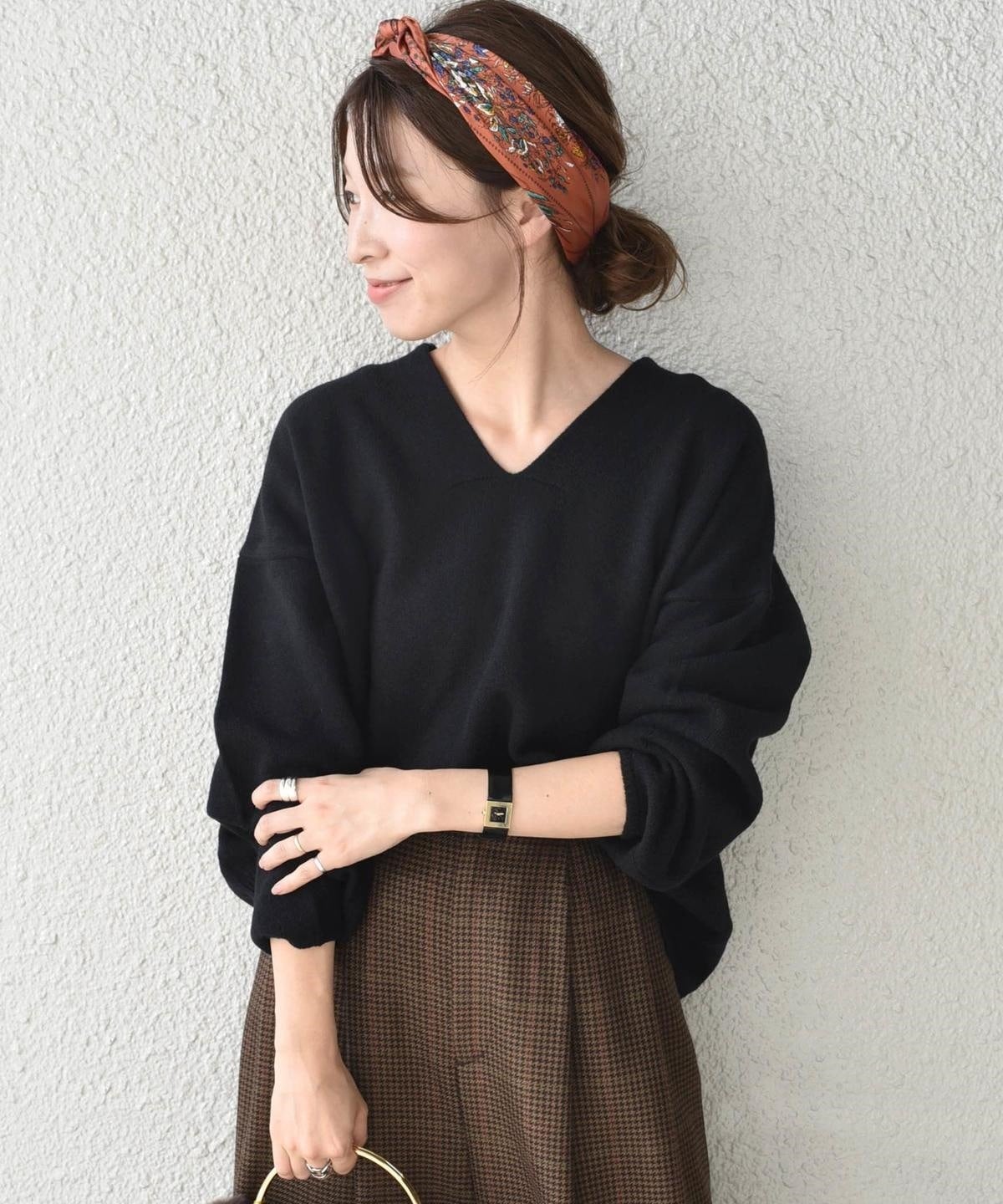 デコルテが綺麗に見えるVネックに、ふっくらとした風合いがシンプルな中に女性らしさのあるニット。