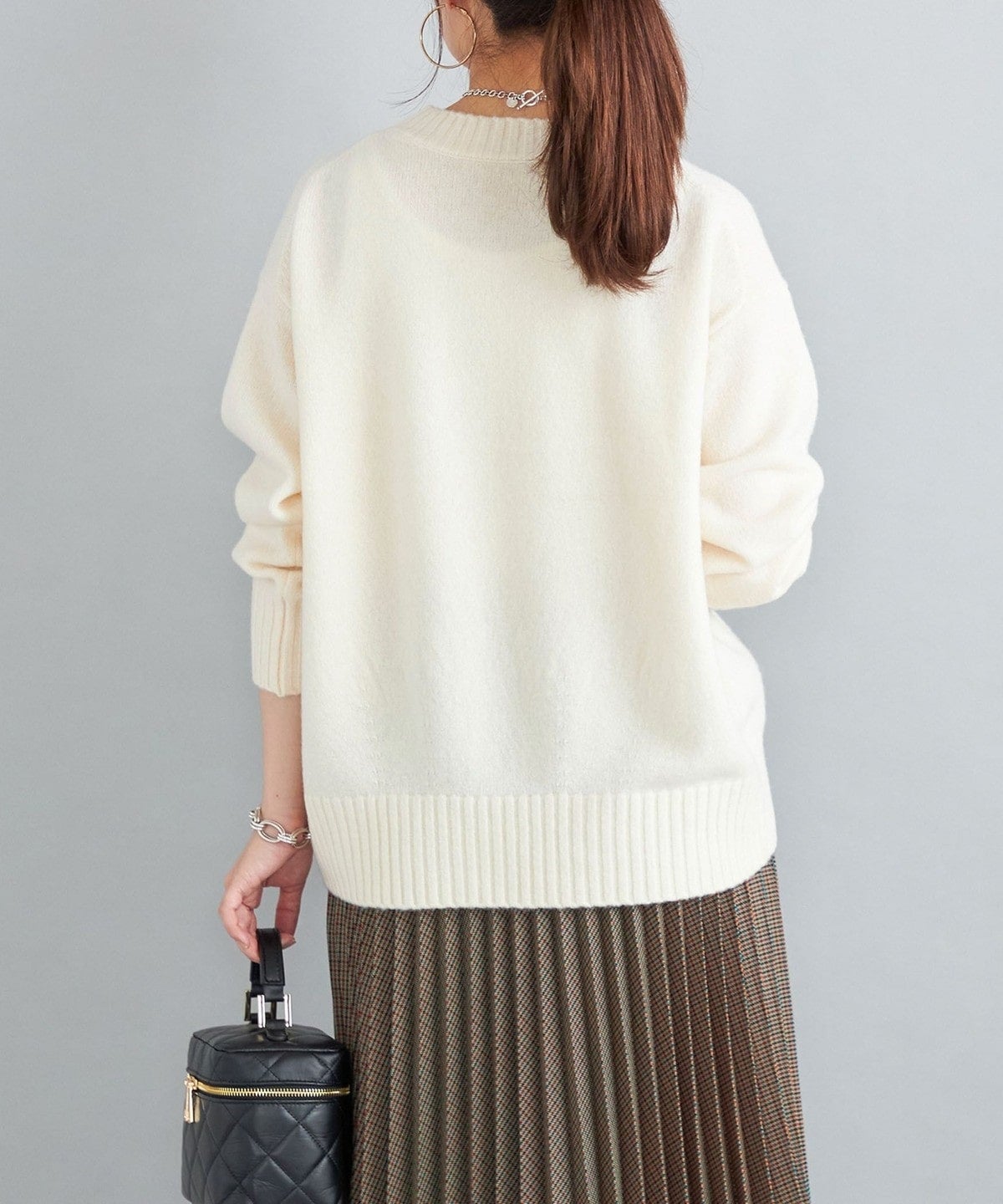 バックスタイルが、程良いコクーンシルエットになった、立体的な形のクルーネックニット。