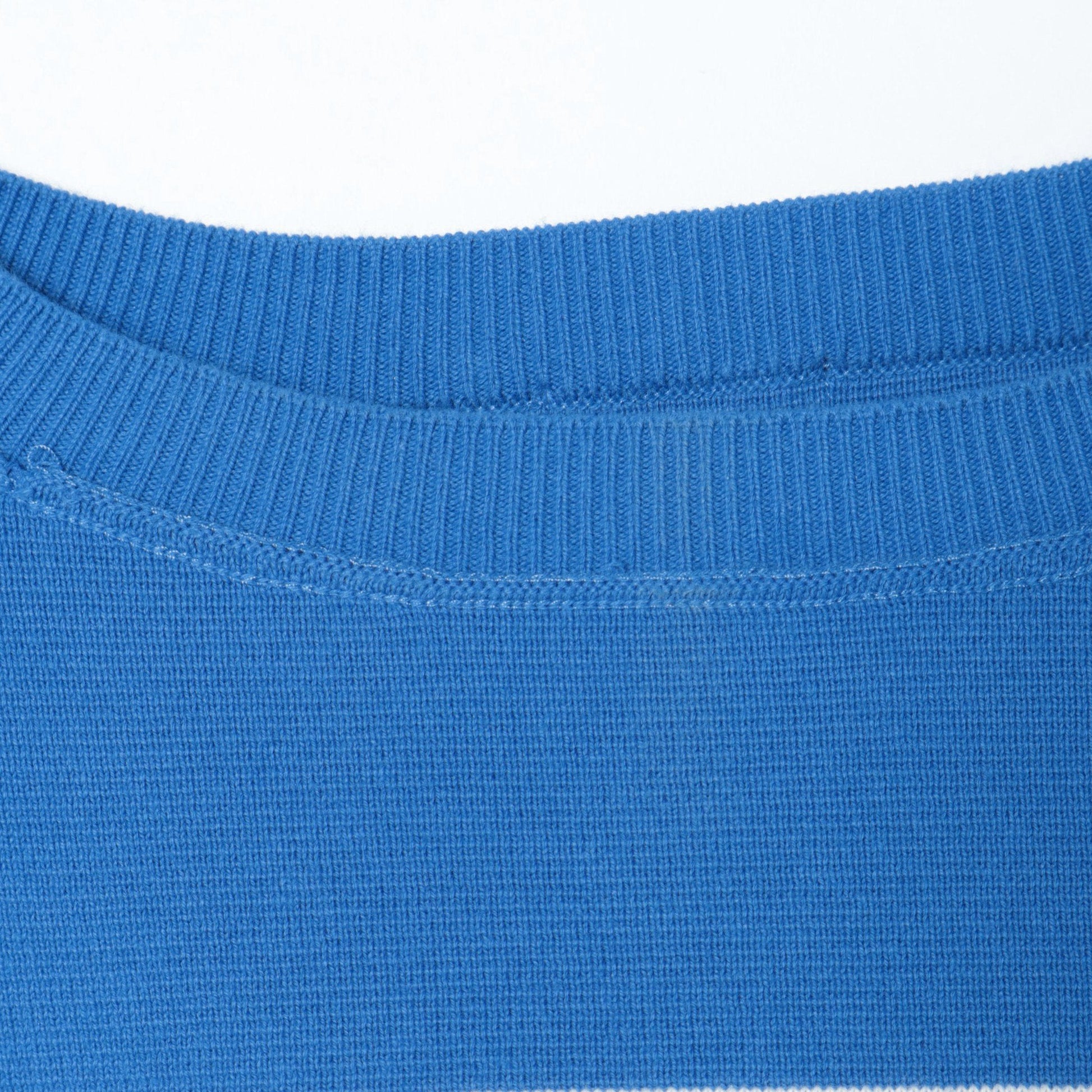 柔らかい甘撚りめのコットンにポリエステルをプレーテイングし、ミラノリブ編みにしています。