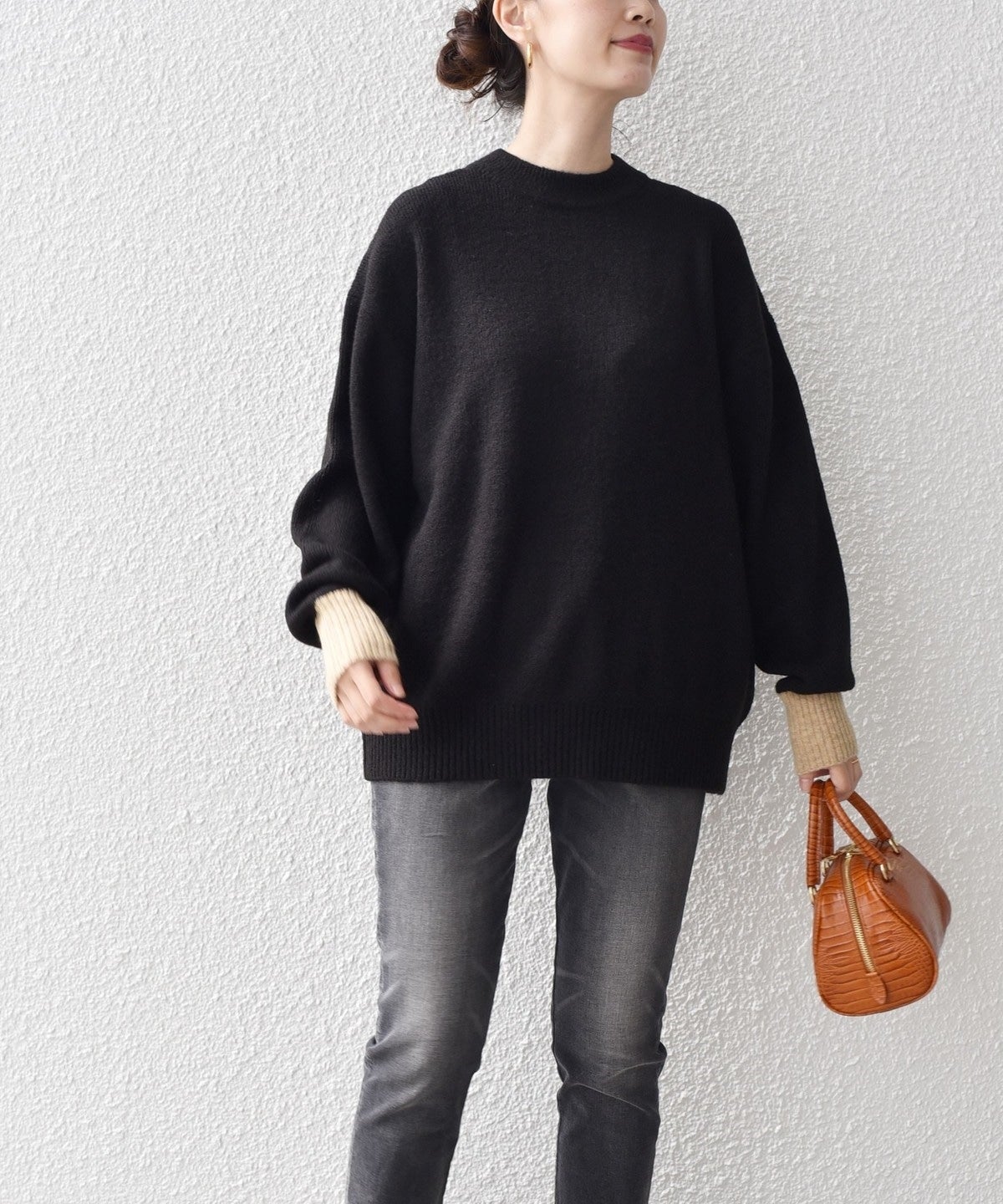 コメント:もっちりとした肌触りで肉感のある生地感。軽い着心地で、ネックもコンパクトなデザインなのであたたかいです。