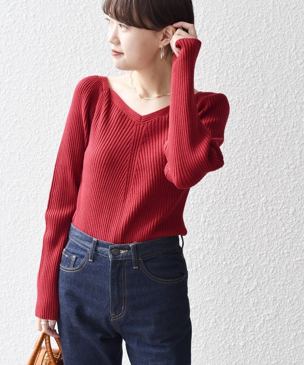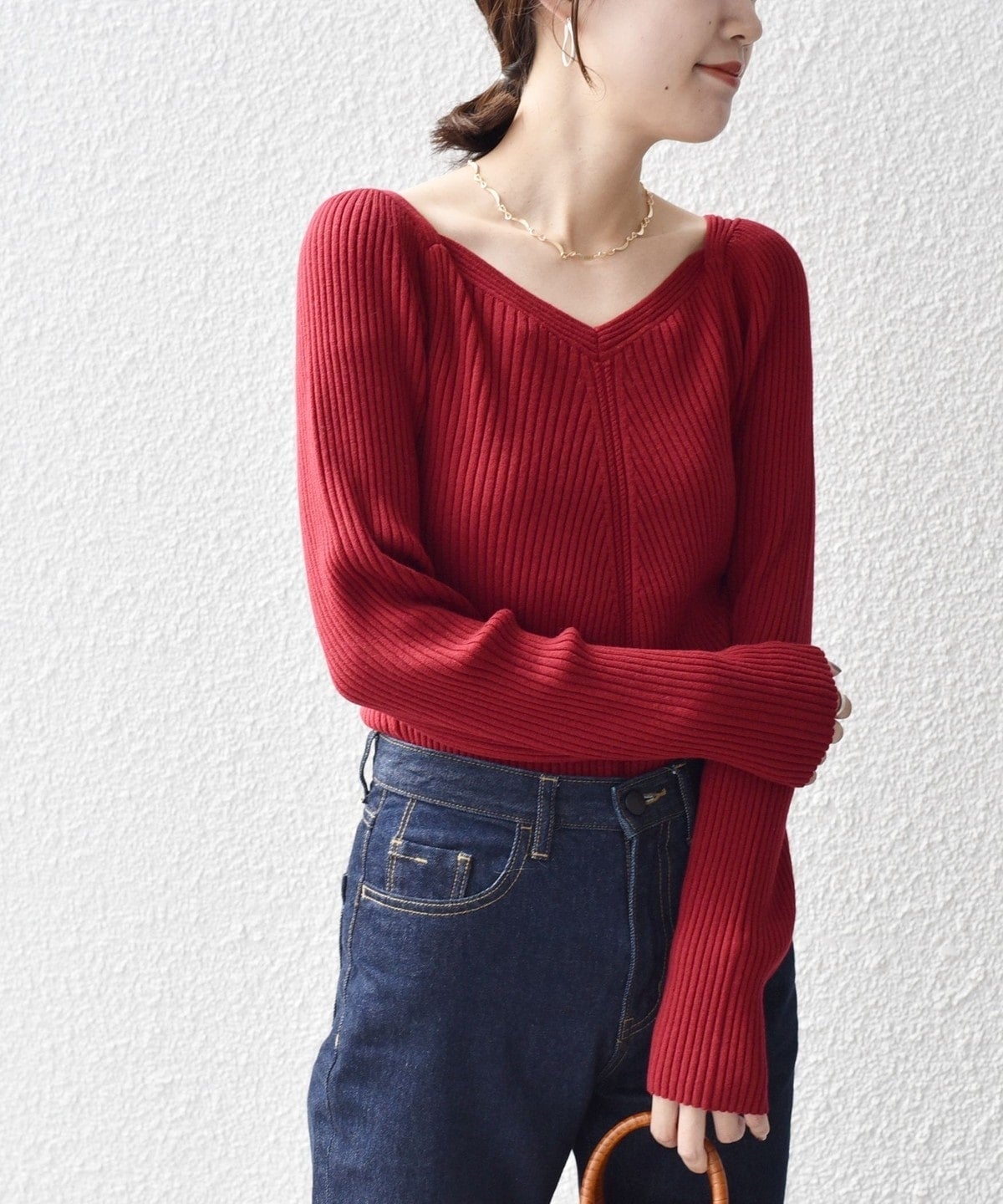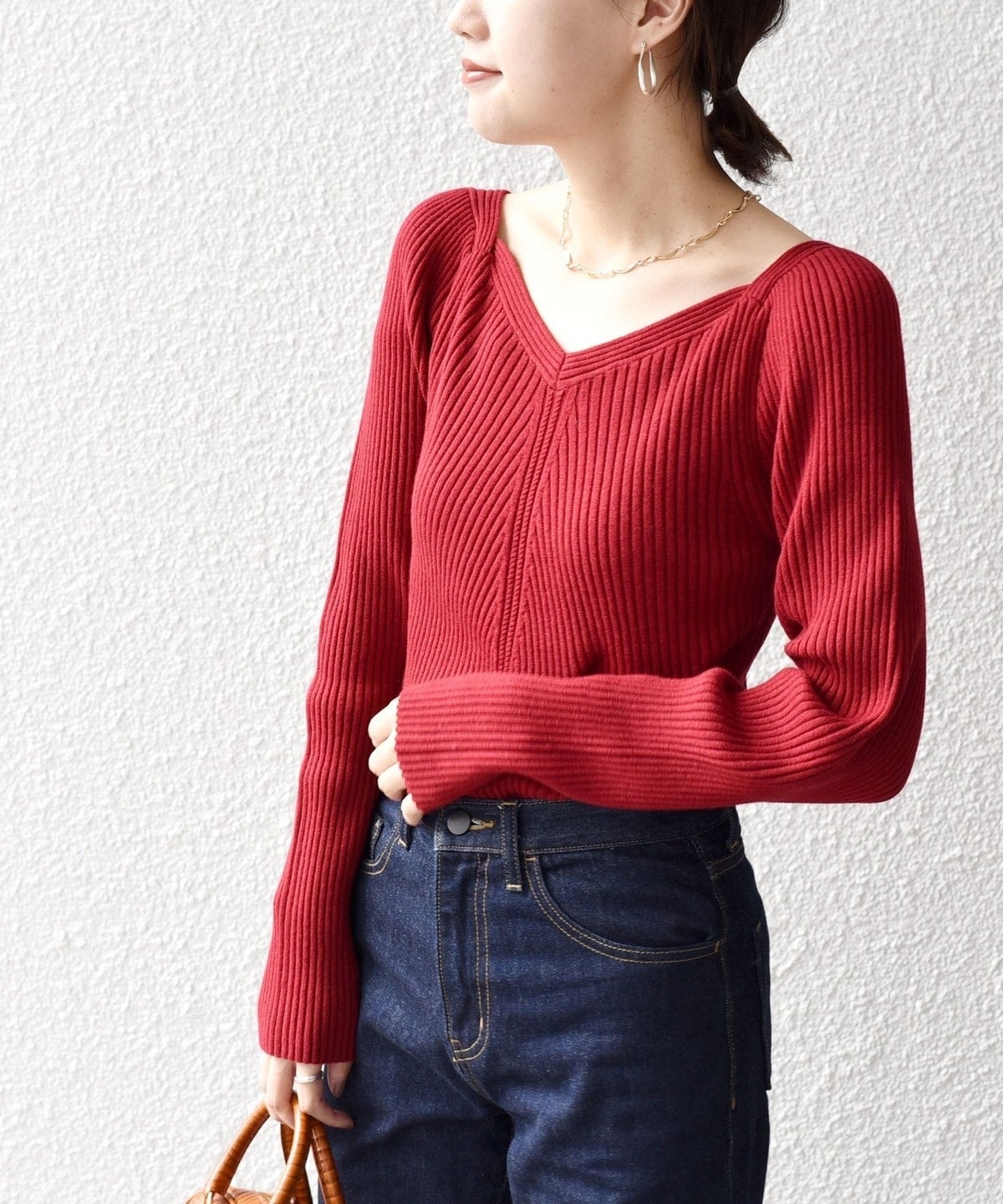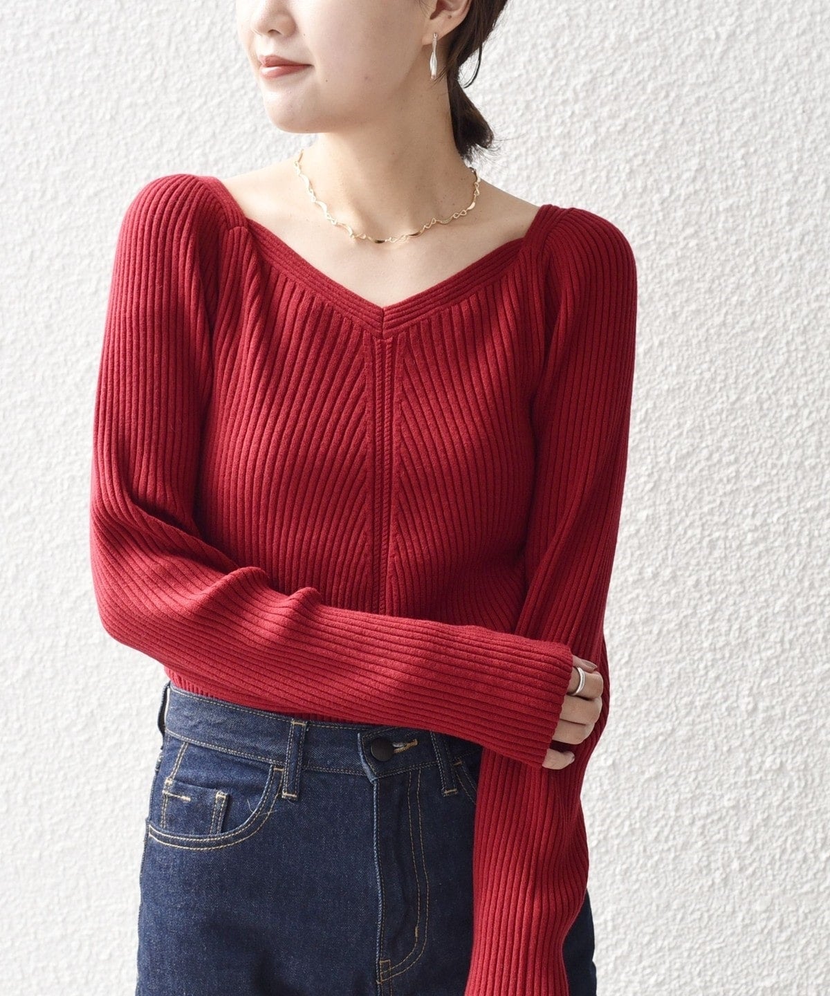 女性らしいリブニットなので、シンプルなパンツやスカートにすっきりインしていただくのがおすすめ。