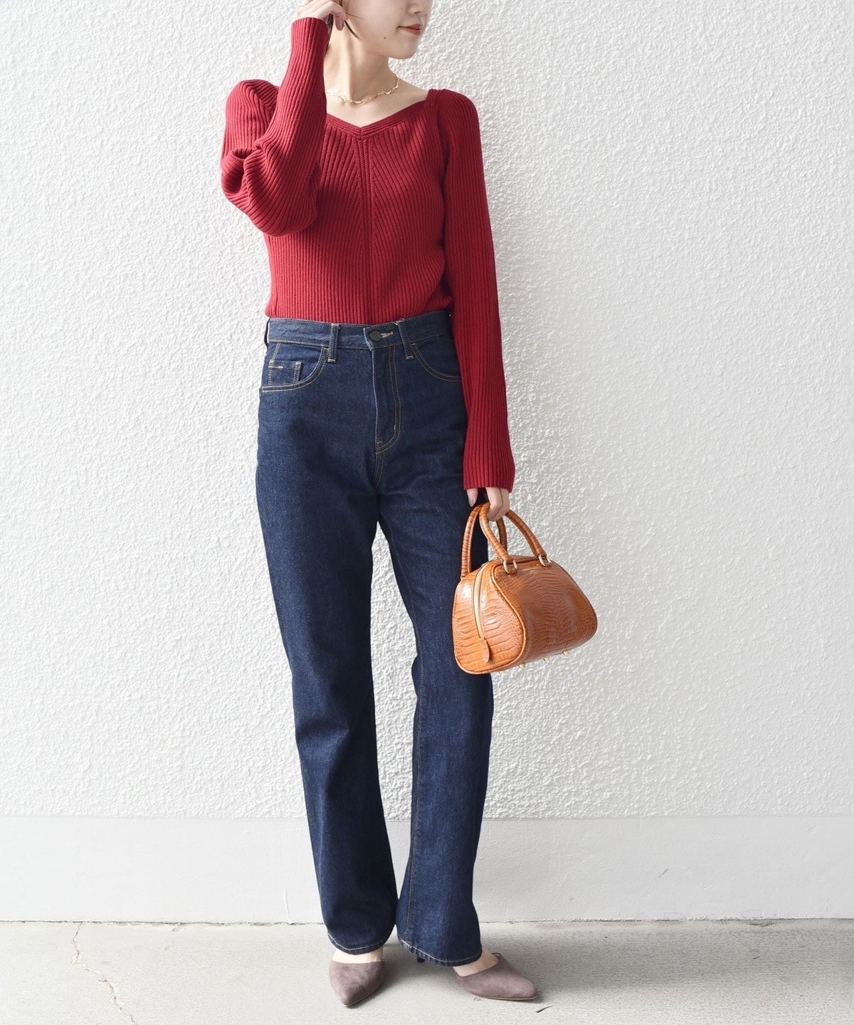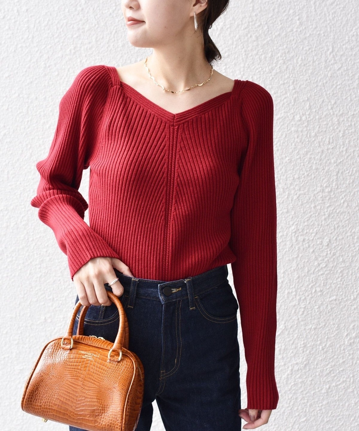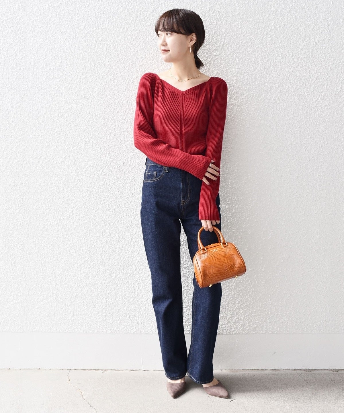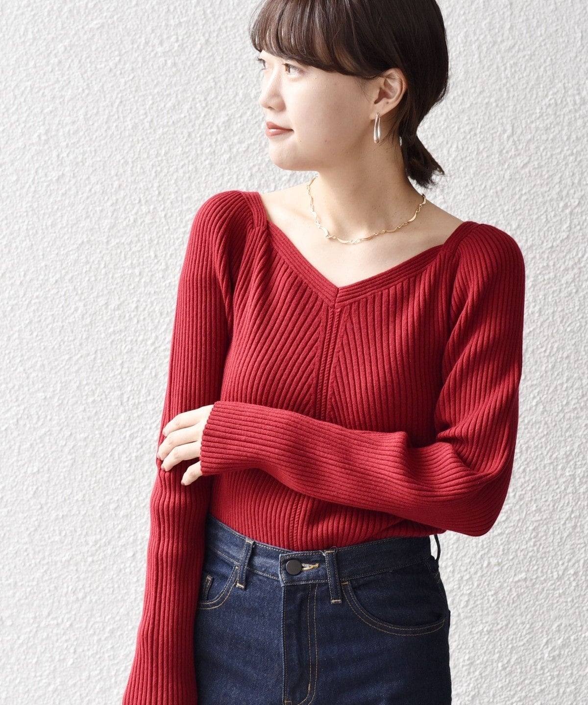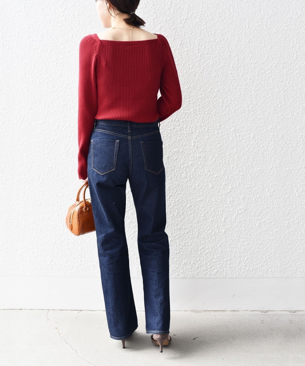 女性らしいリブニットなので、シンプルなパンツやスカートにすっきりインしていただくのがおすすめ。